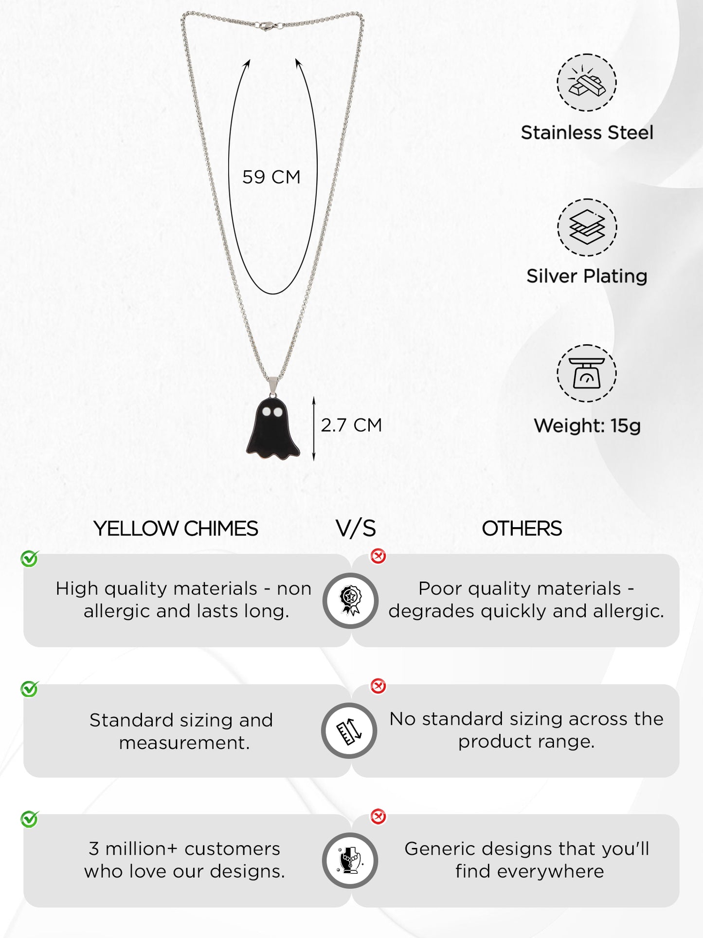 Yellow Chimes Chain Pendant for Men | Fashion Black Pendants for Boys | Lovely Ghost Shaped Pendant Necklace | Stainless Steel Chains for Boys | Accessories for Men | Birthday Gift for Men & Boys Wear this versatile men's pendant necklace for any occasion, from casual outings and nights out to special events. Make a statement with this eye-catching men's pendant, perfect as a gift for your son, friend, or any special man in your life. Worried about fading? This men's pendant is crafted from stainless steel designed to maintain its sleek black color over time. This durable stainless-steel pendant features a secure lobster clasp and a chain for a timeless look. Size Details: Chain Length is 59 CM, Charm Length 2.7 CM * Width 2.5 CM. Weight is 15 gr. Metal is Stainless Steel, Closure is Lobster Clasp. Packaging: Your favorite piece of Jewellery will reach you in an Elegant Yellow Chimes box with safety and precautions. You can leave it to us the job of delivering your Jewellery in original condition to you at your door-step. This stylish men's pendant necklace is crafted from high-quality stainless steel for lasting durability. Enjoy a premium, comfortable fit. This men's necklace is designed to be lightweight and easy to wear for everyday use.