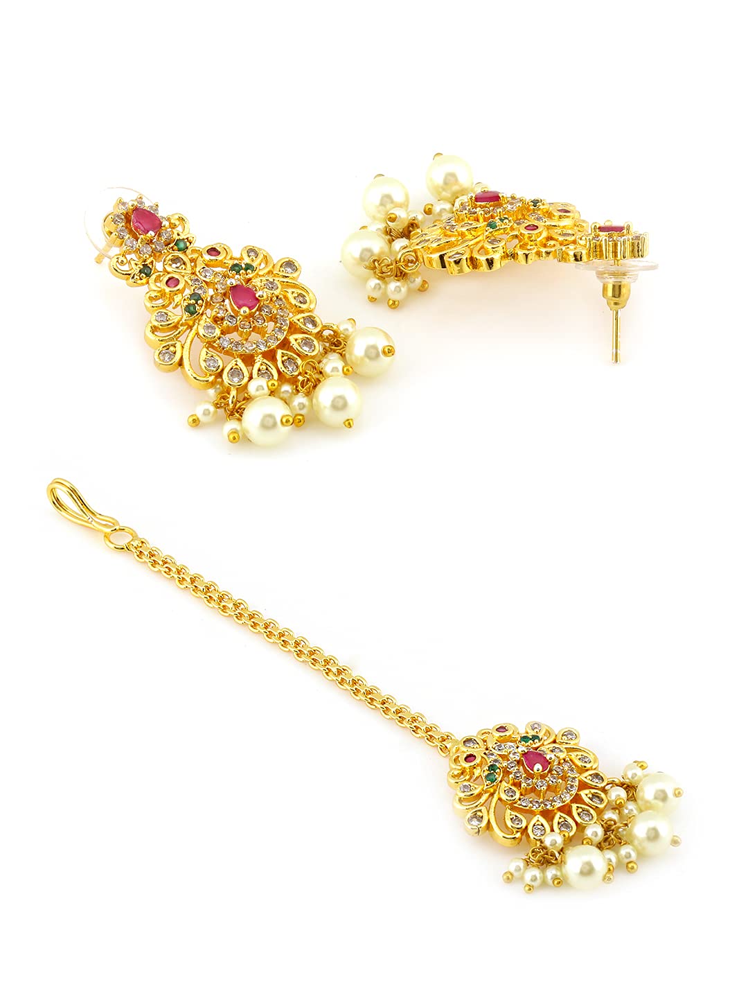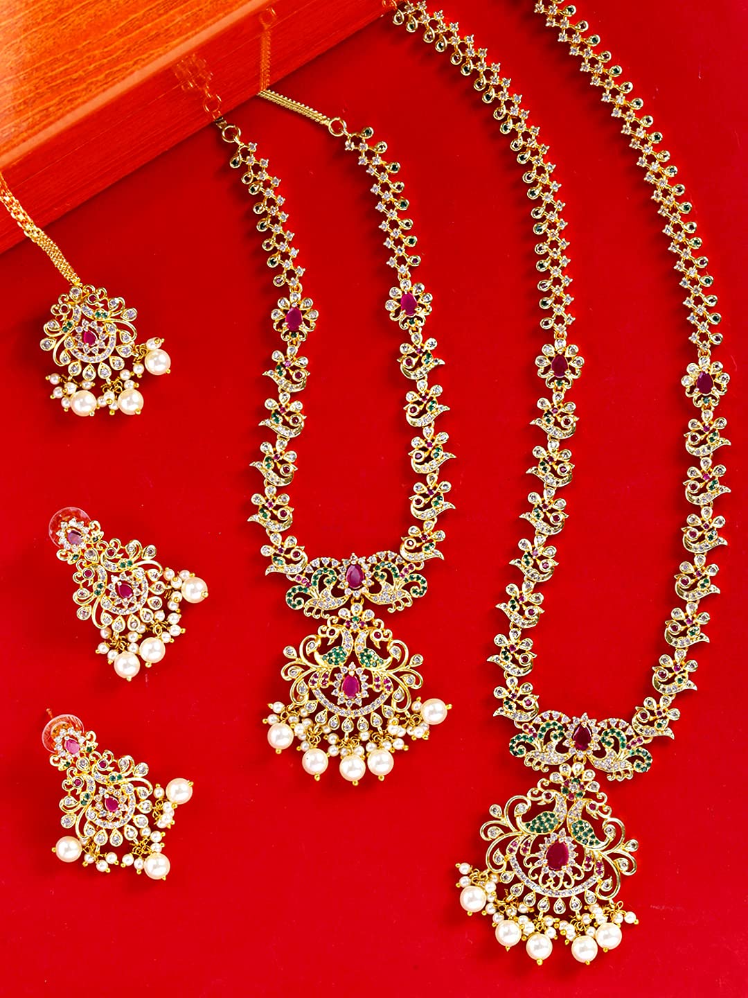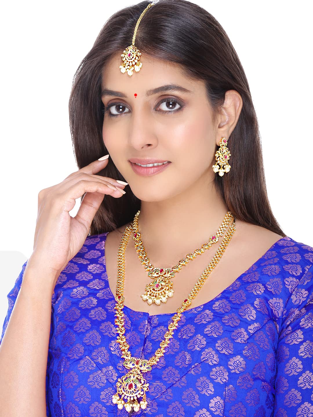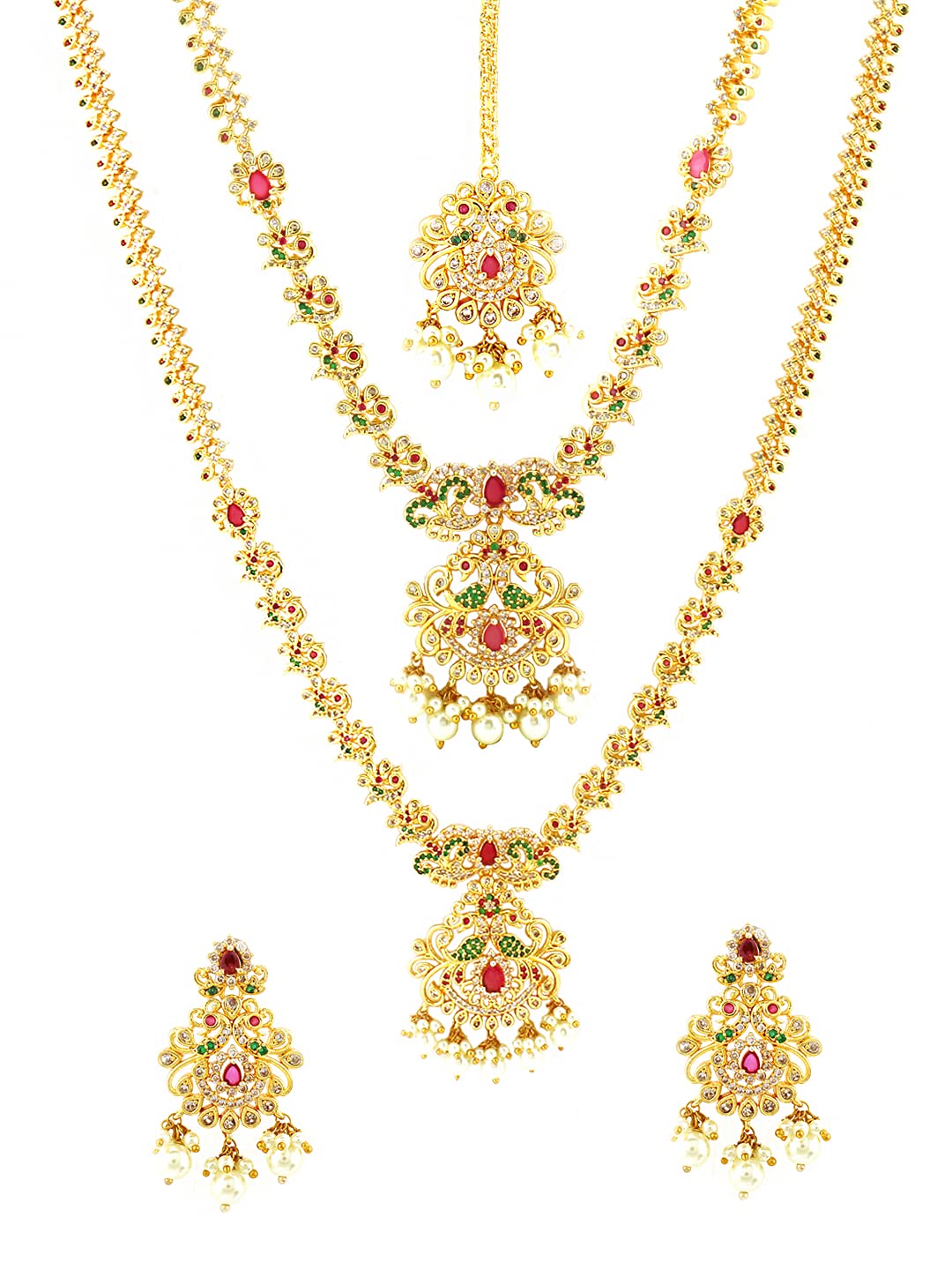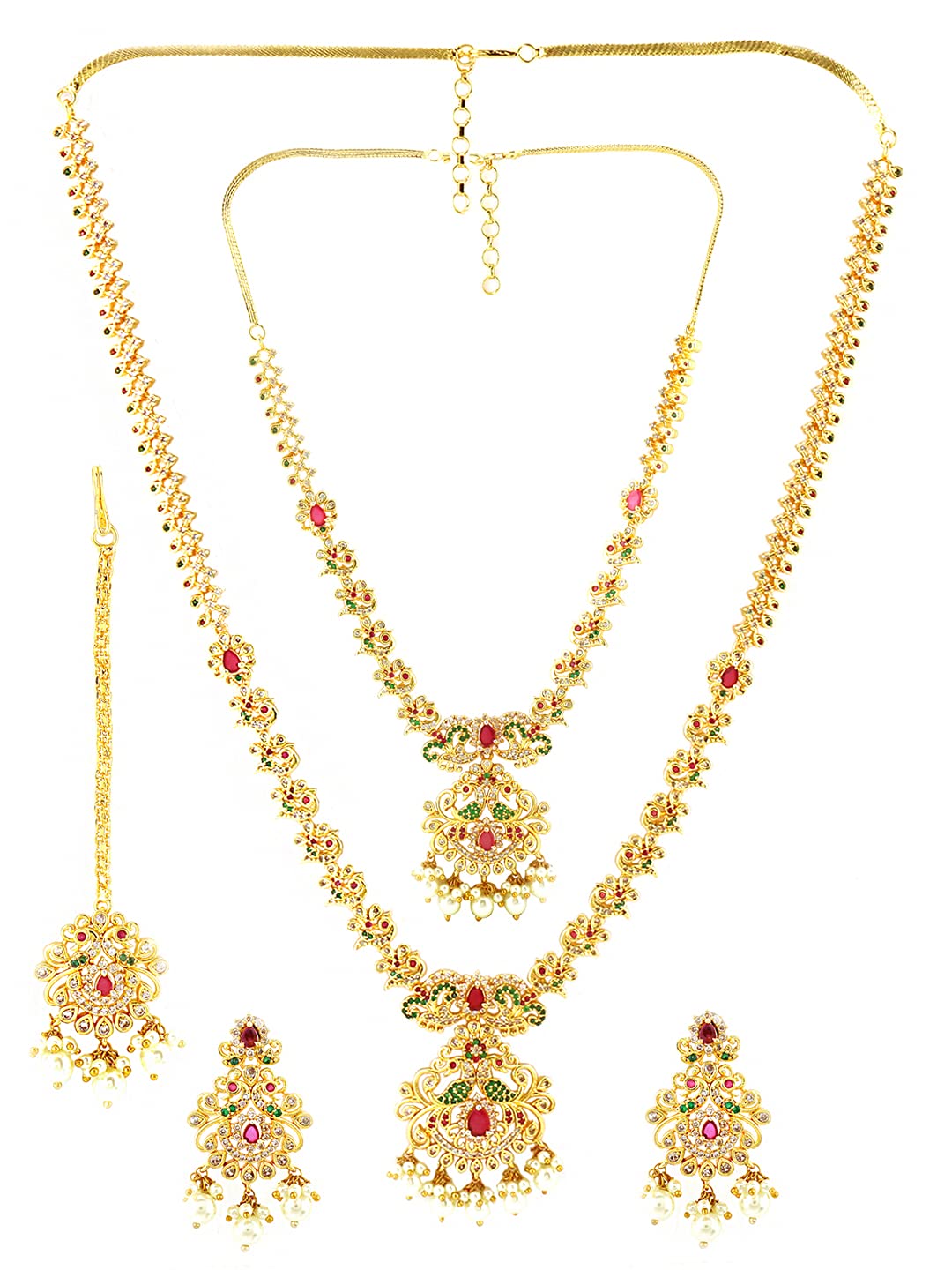 - Size: Choker Necklace length - 49 CM. (including adjustable), Width - 1 CM, Charm - 5.5 * 3.2 CM. Long Necklace length-70 cm (including adjustable), Width - 1 cm, Charm - 6 * 3.8 CM. Earrings - Length- 4.5 CM, Width- 2.4 CM, Maang Tikka Length- 11.5 CM, Width- 2.4 CM