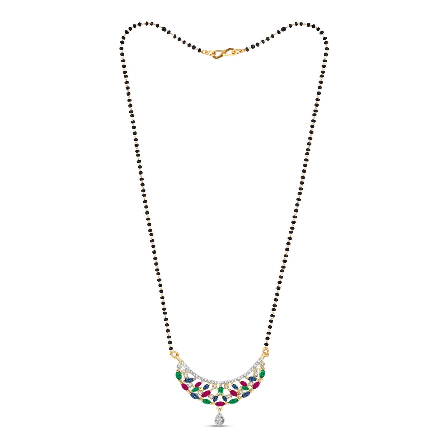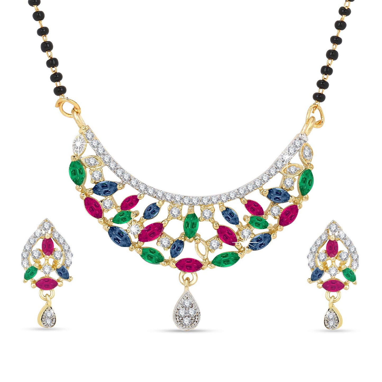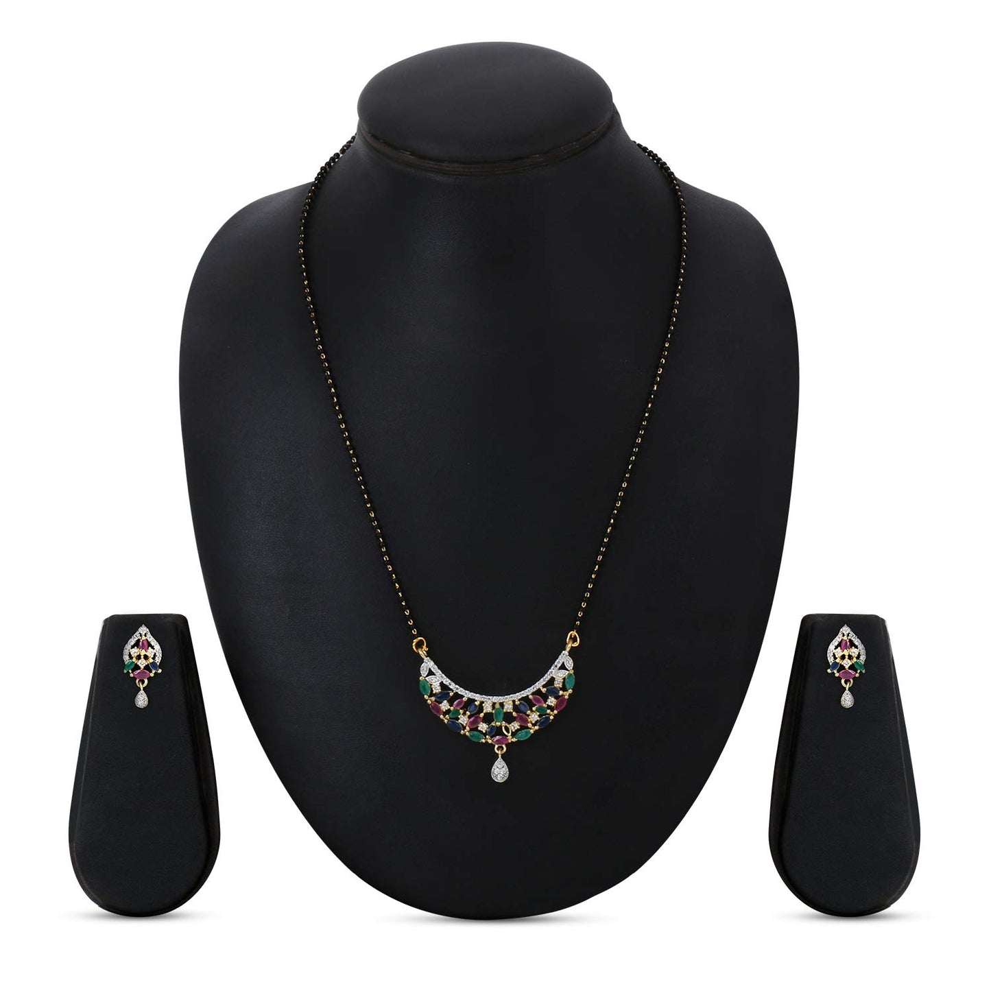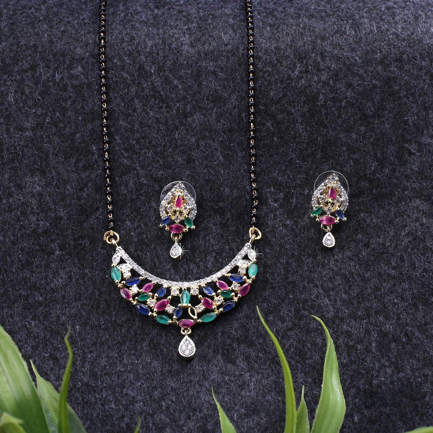 - Ethnic & Stylish Looks,Sparkling multicolor AD/American Diamond Studded Gold Plated Designer Fancy Mangalsutra ki designs With Earrings/Traditional Mangalsutra Tanmaniya Nallapusalu Stunning & Preciously Suitable Looks for all Kinds of Occasions.