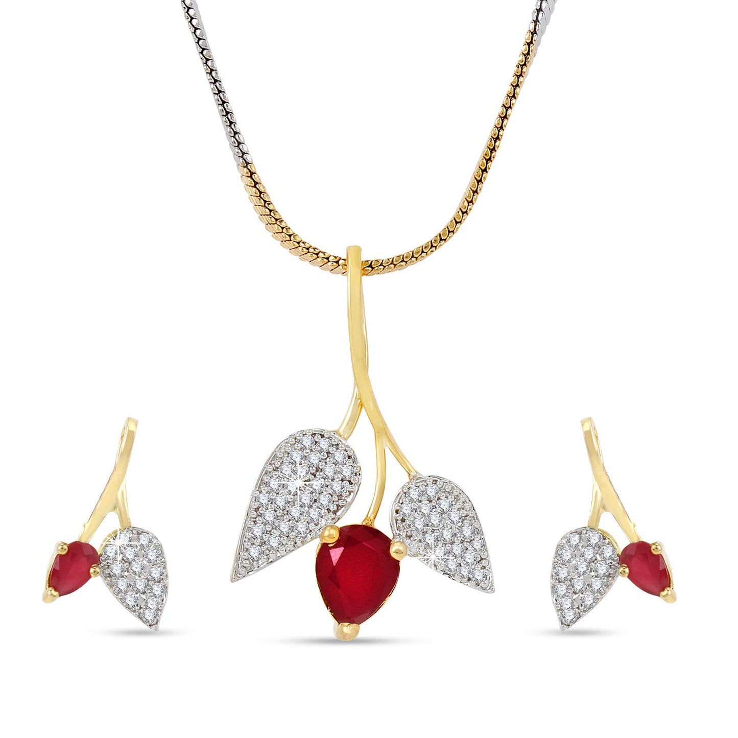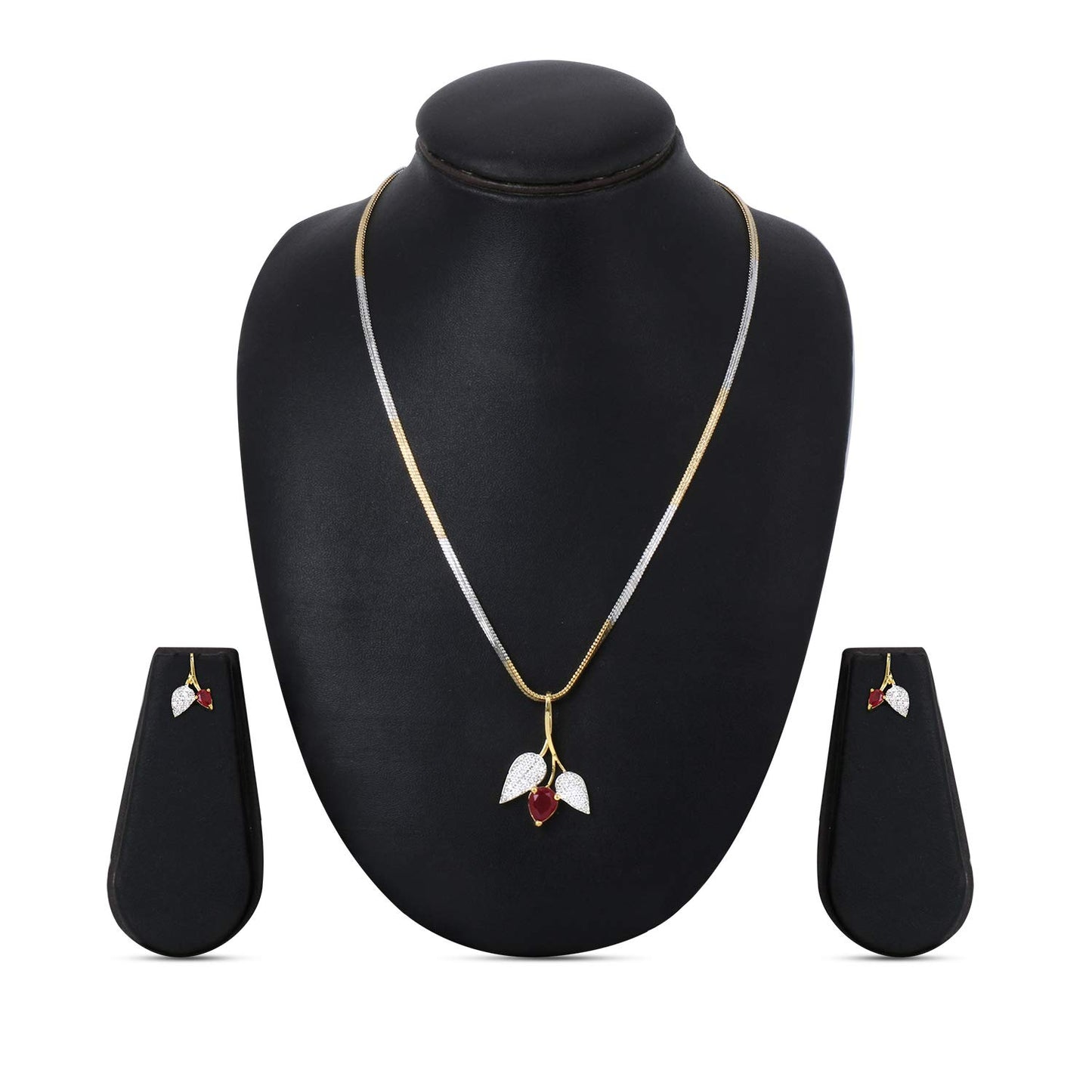 - Elegant A lovely stylish pretty party wear designer piece,Classic Dual tone chain leafy pendant design in pink Americal Diamond Studded pendant set with stud earrings jewellery set A5 grade clarity is stunning and preciously suitable for all kinds of occasions.
