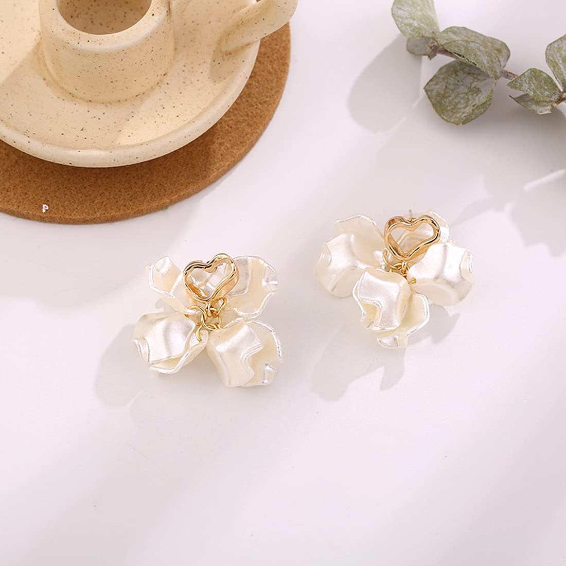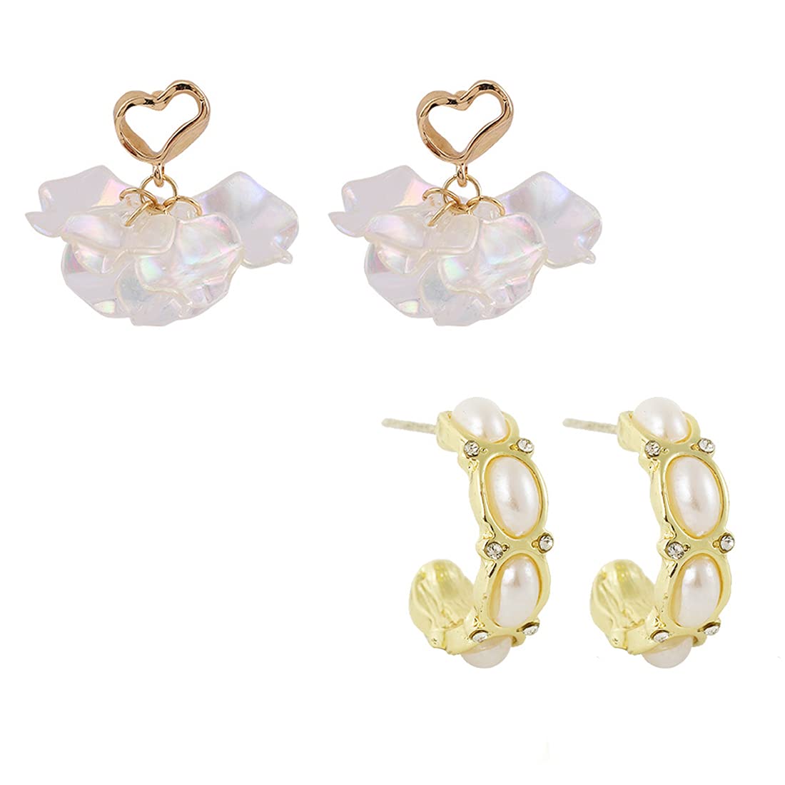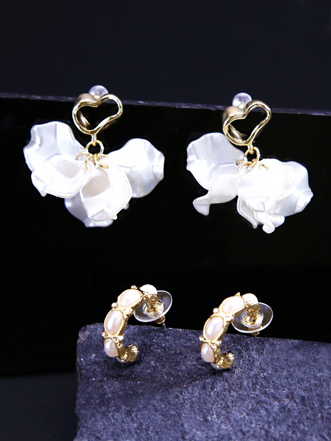 Combo of 2 Pairs Latest Fashion Gold Plated Floral Pearl Design Drop Stud Earrings for Women and Girls, Medium, YCFJER-02PRLDGN-C-WH