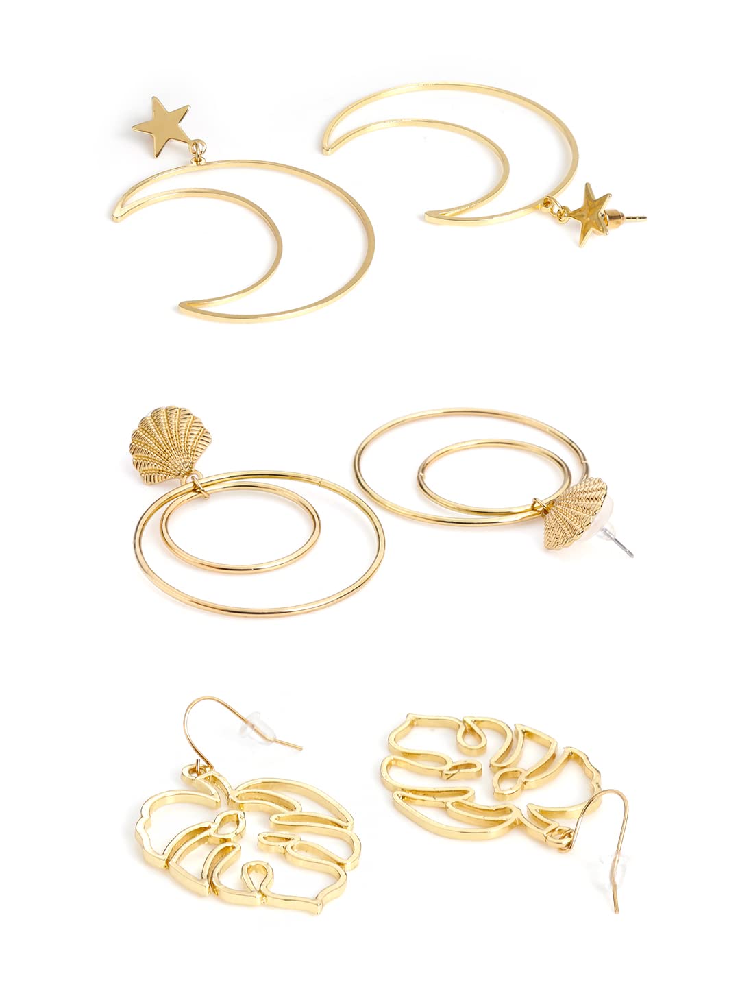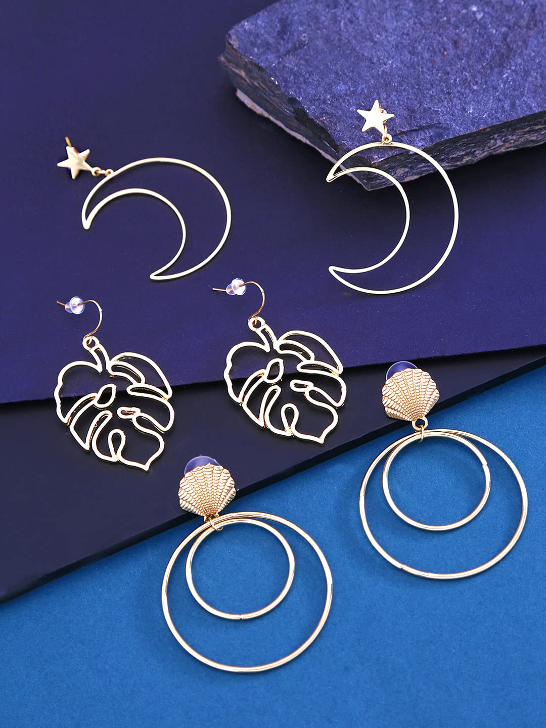 Combo of 3 Pairs Latest Fashion Gold Plated Geometric Design Round Leaf Shape Dangle Earrings for Women and Girls, Medium, YCFJER-15GEOMTRC-C-GL