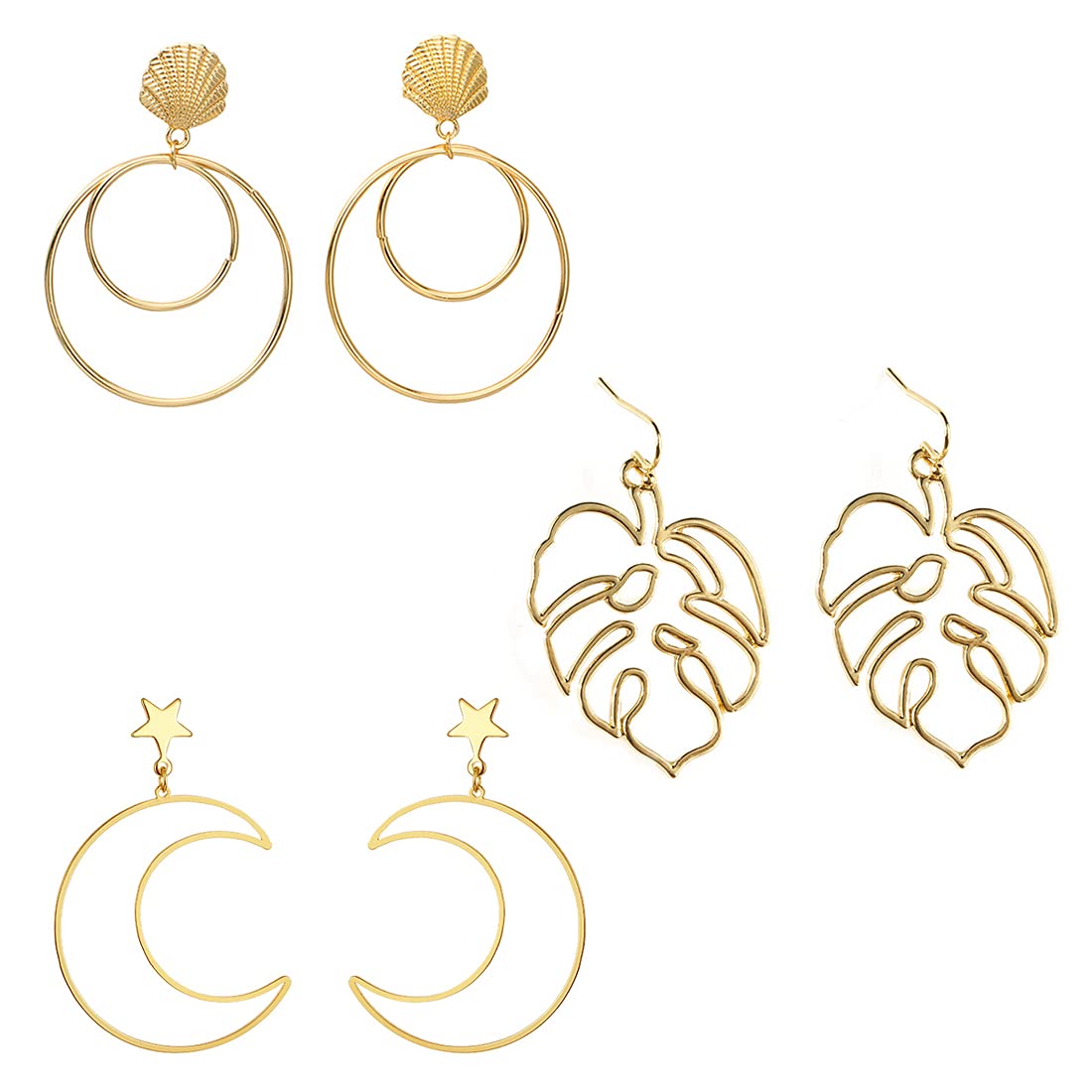 Yellow Chimes Combo of 3 Pairs Latest Fashion Gold Plated Geometric Design Round Leaf Shape Dangle Earrings for Women and Girls, Medium, YCFJER-15GEOMTRC-C-GL