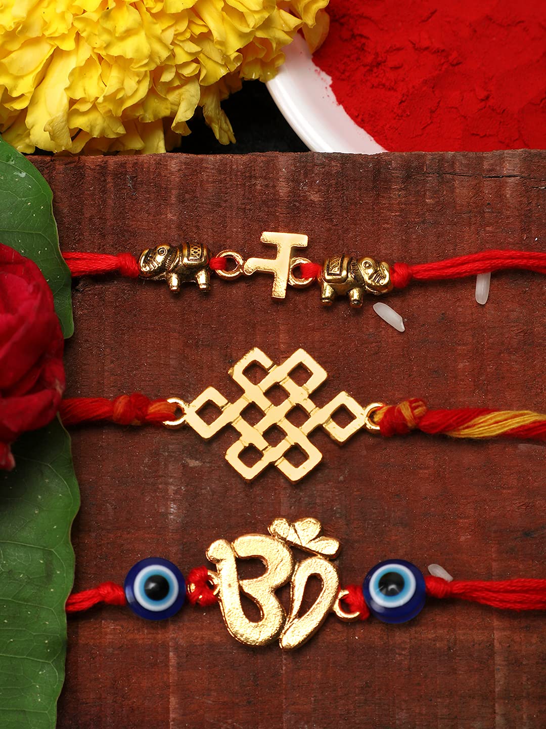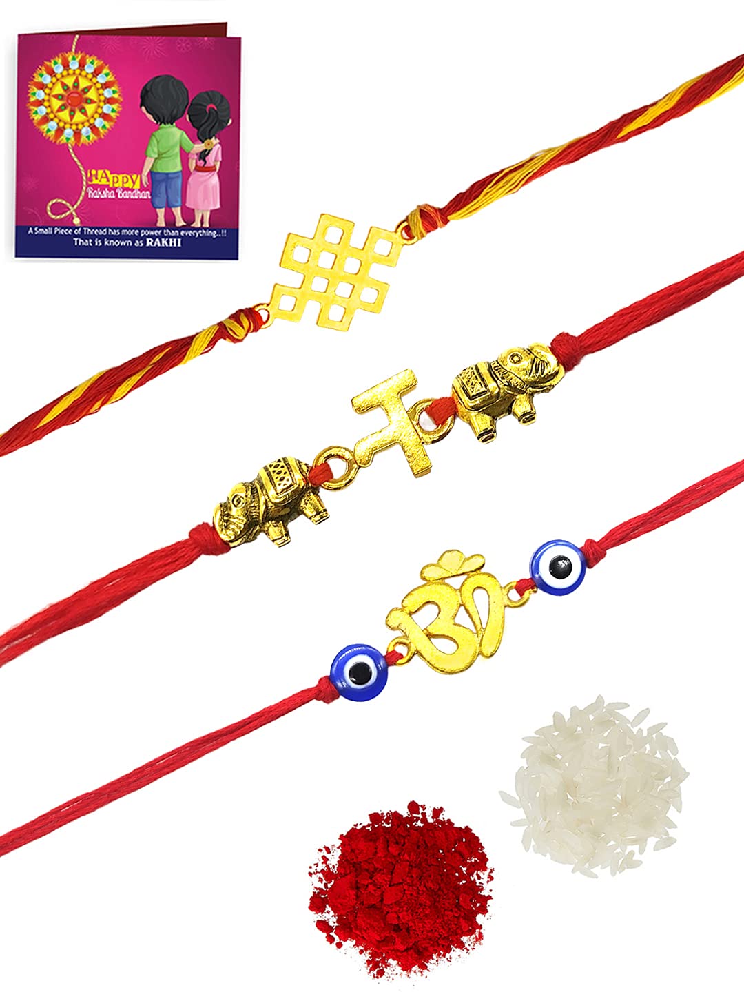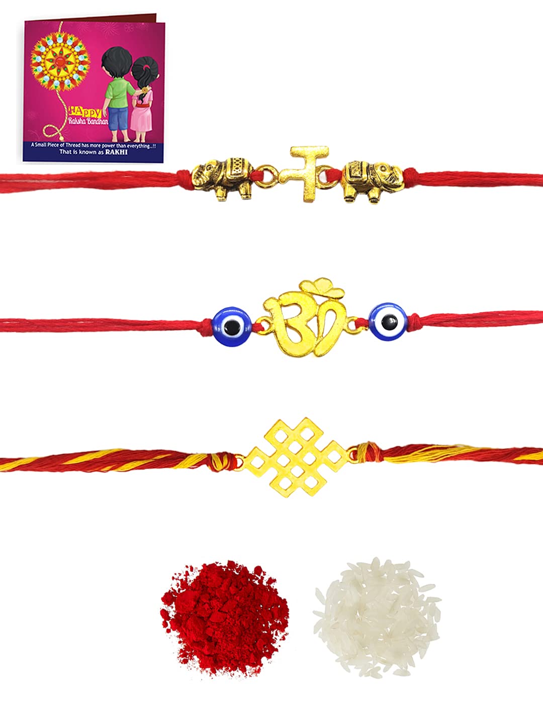 Yellow Chimes Combo of 3 Pcs Handmade Dori Worked Gold Toned OM Initial Letter N and Celtic Design Evil Eye Beads Rakhi for Brother with Roli & Chawal, Red, Gold, Medium (YCTJRK-27BHAY-GL)