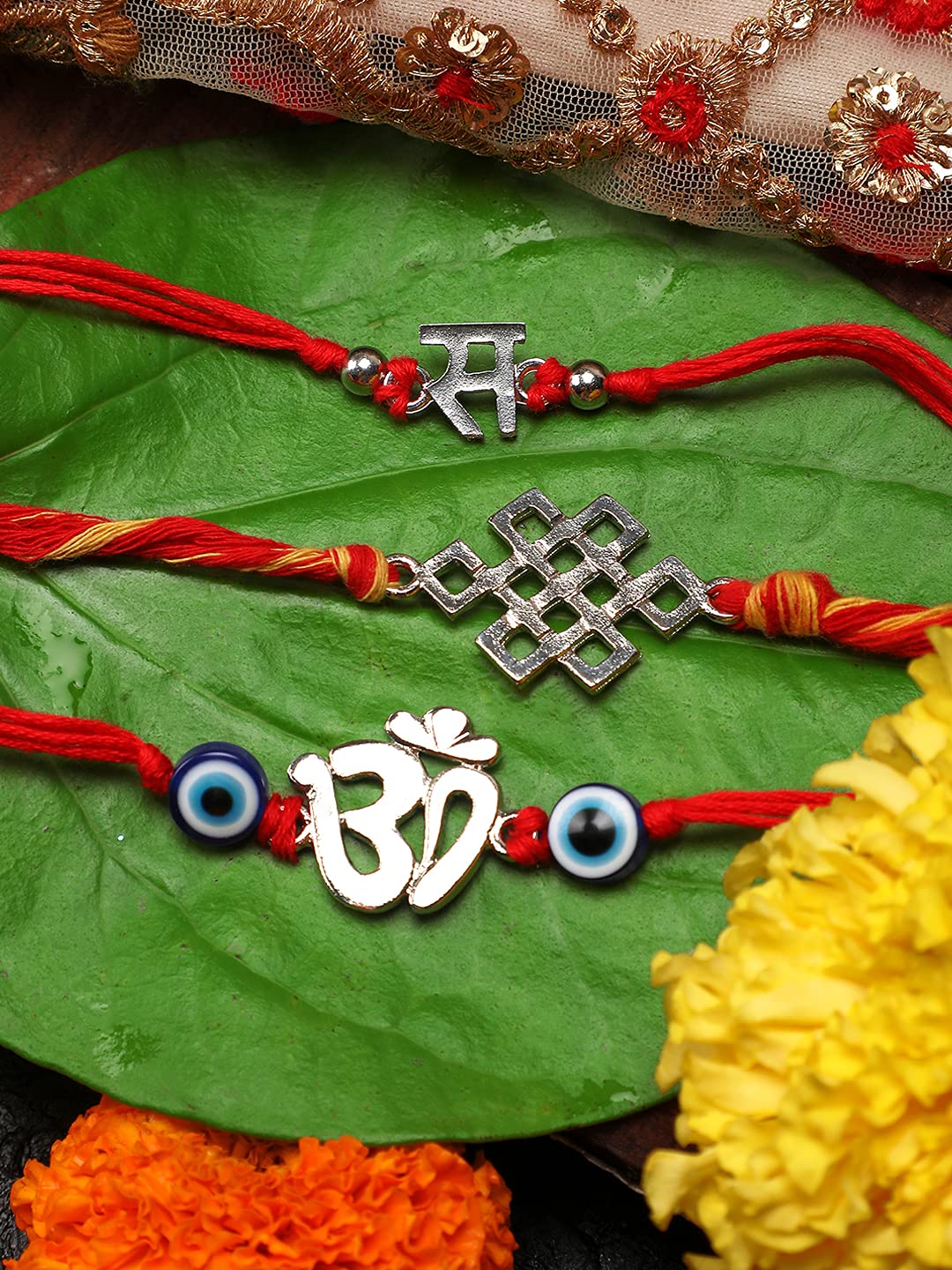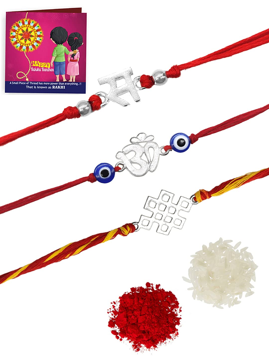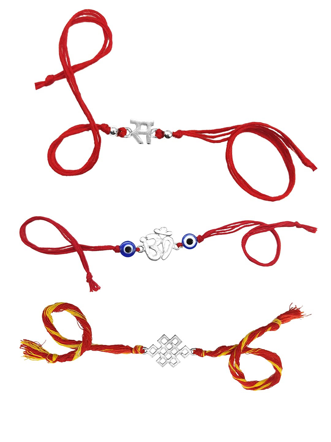 Yellow Chimes Combo of 3 Pcs Handmade Dori Worked Silver Toned OM Initial Letter S and Celtic Design Evil Eye Beads Rakhi for Brother with Roli & Chawal, Red, Silver, M (YCTJRK-28BHAY-SL) Combo of 3 pieces -Beautiful Handmade Silver toned OM initial letter S and Celtic Design Rakhi by Local Indian artisans for Your Brother. Instead of normal thread, Red -Yellow Holy Mauli Dori is used to wraparound. Products comes with Roli and Chawal packet. Rakhi is the festival of expressing the feelings of love. Thus what can be better than expressing it your loving brother by bringing a designer rakhi for him this year. Specially designed handcrafted traditional designer rakhi for brother/bhai This is exclusively designed and handmade by Indian Artisans using jewellery assortments. Closure type: Tie-knot Gift For Rakshabandhan: The traditional exchange of gifts is something every brother and sister looks forward to with anticipation. If you are also looking for rakhi gift ideas for your sibling or cousin, have a look at some of the amazing gift.