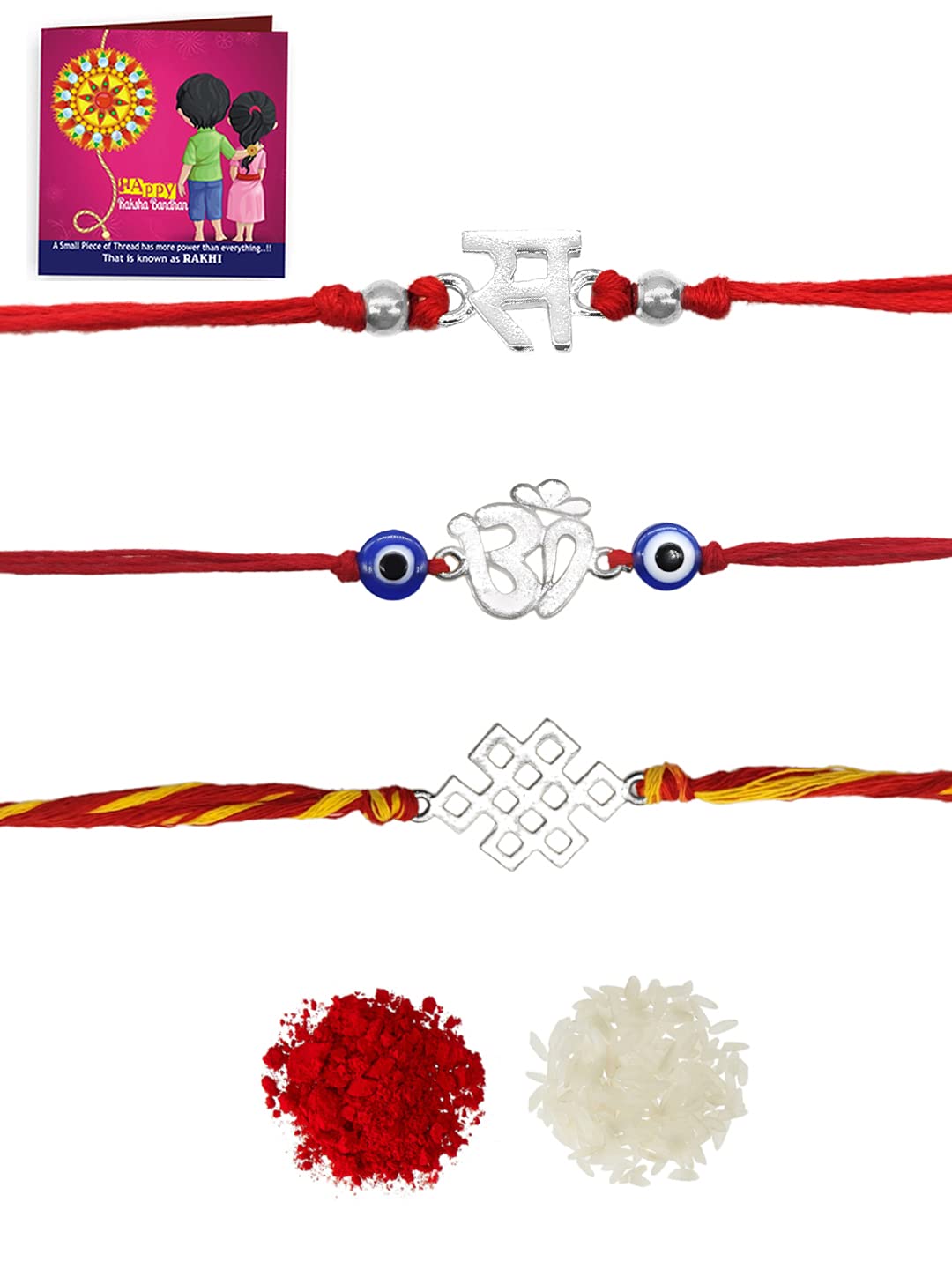 Yellow Chimes Combo of 3 Pcs Handmade Dori Worked Silver Toned OM Initial Letter S and Celtic Design Evil Eye Beads Rakhi for Brother with Roli & Chawal, Red, Silver, M (YCTJRK-28BHAY-SL)