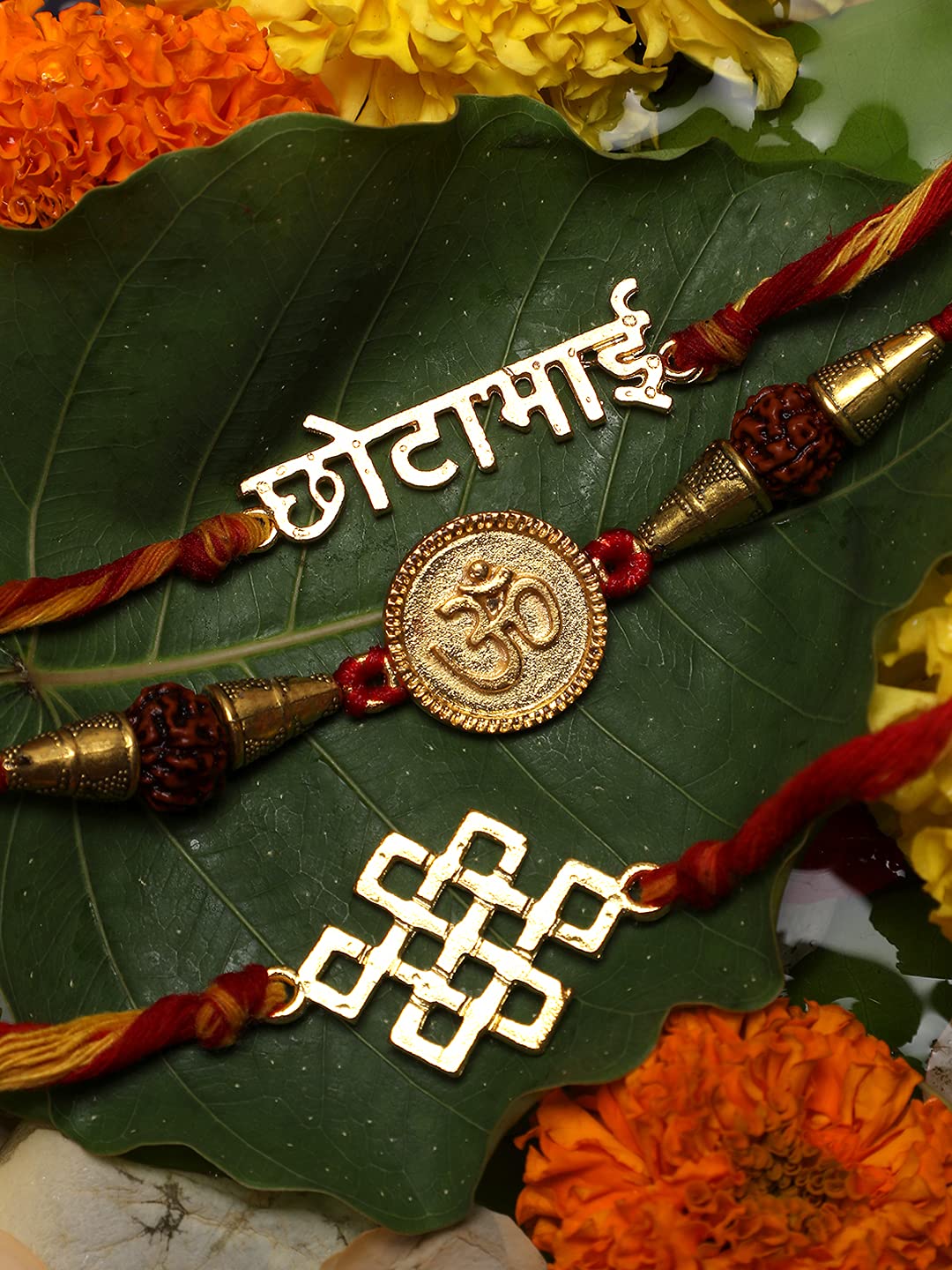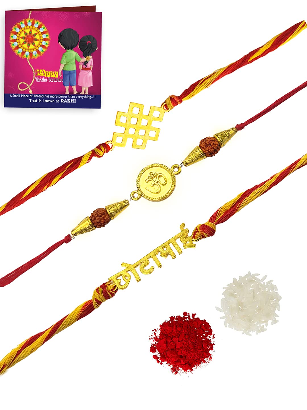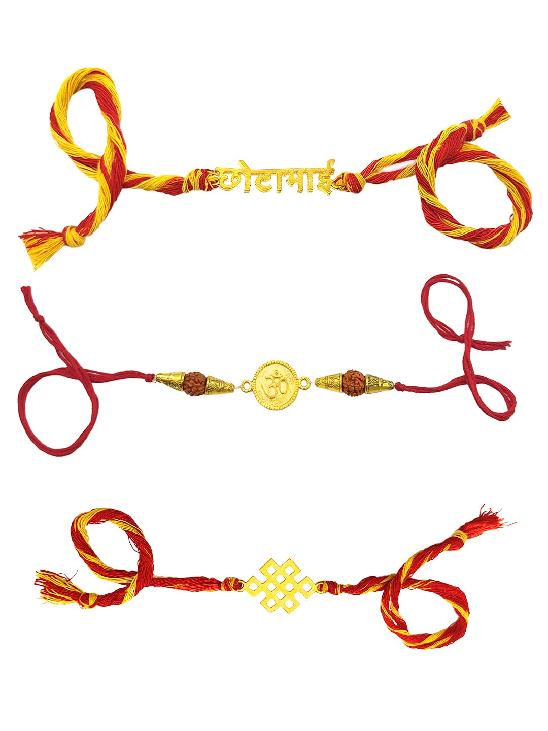 Yellow Chimes Combo of 3 Pcs Handmade Dori Worked Gold Toned OM Chota Bhai and Celtic Design Rakhi for Brother with Roli & Chawal, Red, Gold, Medium (YCTJRK-19BHAY-GL) for Men