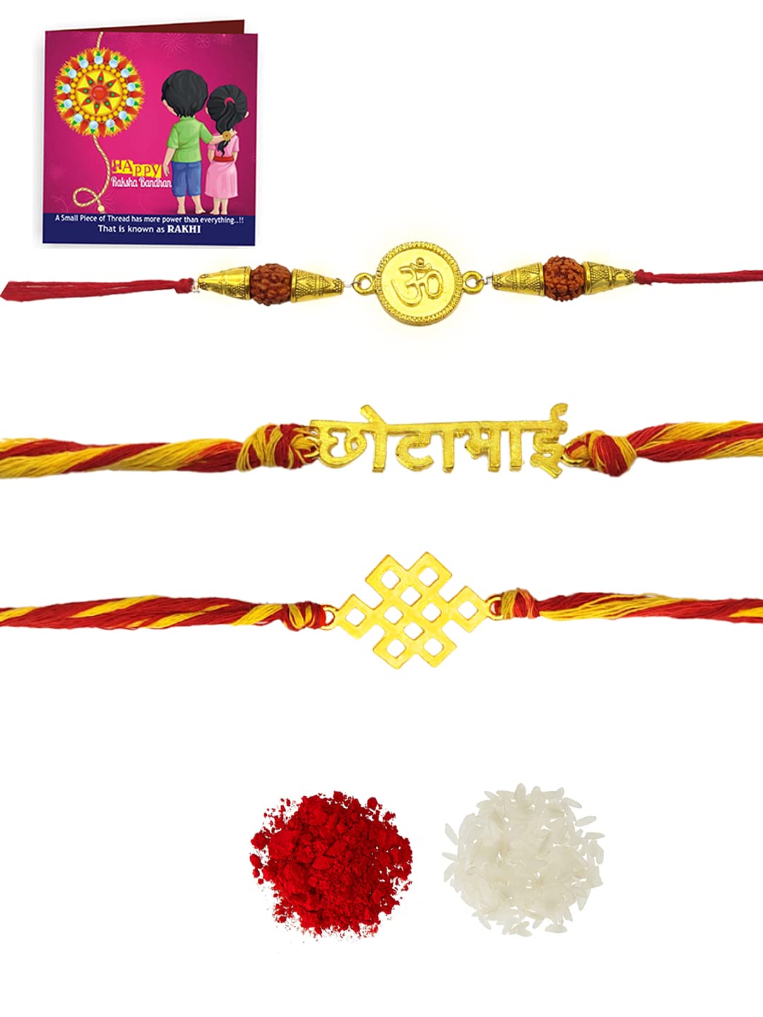 Yellow Chimes Combo of 3 Pcs Handmade Dori Worked Gold Toned OM Chota Bhai and Celtic Design Rakhi for Brother with Roli & Chawal, Red, Gold, Medium (YCTJRK-19BHAY-GL) for Men Combo of 3 pieces -Beautiful Handmade Gold toned OM Chota Bhai and Celtic Design Rakhi by Local Indian artisans for Your Brother. Instead of normal thread, Red -Yellow Holy Mauli Dori is used to wraparound. Products comes with Roli and Chawal packet. Rakhi is the festival of expressing the feelings of love. Thus what can be better than expressing it your loving brother by bringing a designer rakhi for him this year. Specially designed handcrafted traditional designer rakhi for brother/bhai This is exclusively designed and handmade by Indian Artisans using jewellery assortments. Closure type: Tie-knot Gift For Rakshabandhan: The traditional exchange of gifts is something every brother and sister looks forward to with anticipation. If you are also looking for rakhi gift ideas for your sibling or cousin, have a look at some of the amazing gift.