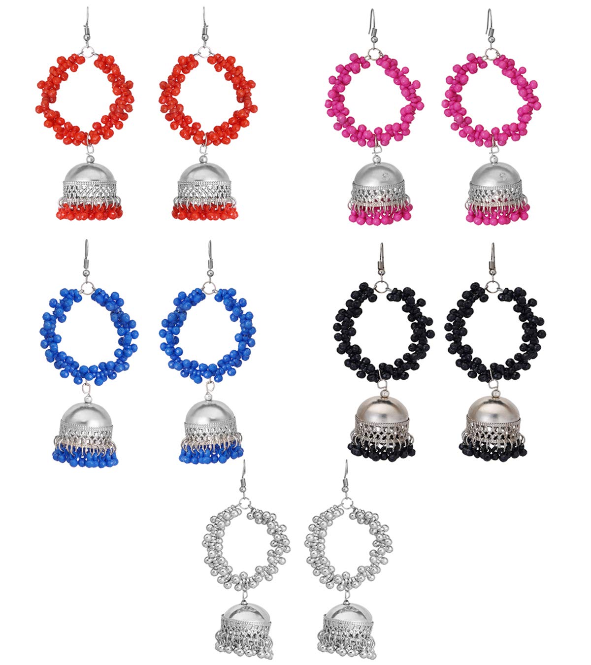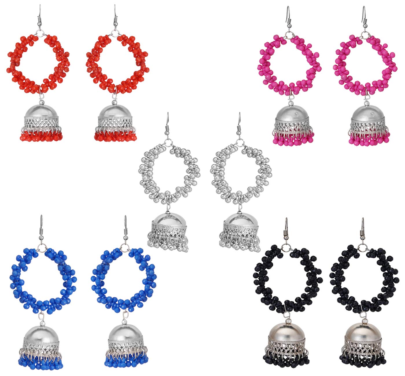 Combo of 5 Pairs Silver Oxidised Jhumka Afghani Style Traditional Hoop Jhumka Earrings For Women and Girl's