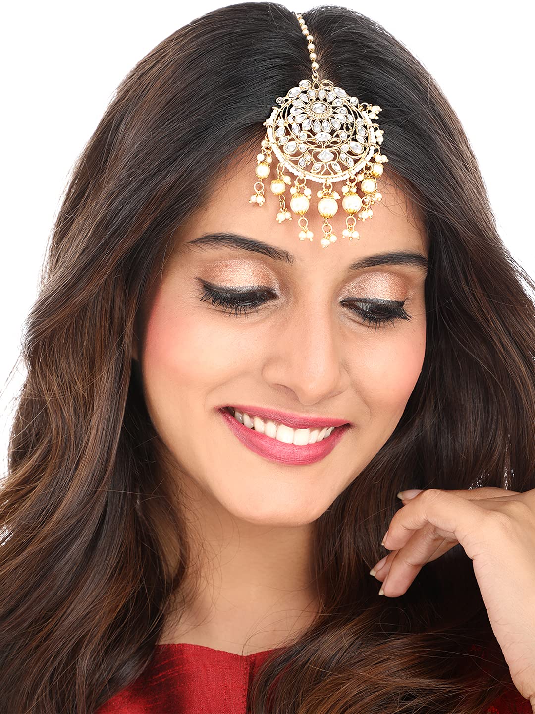 Yellow Chimes Combo of Traditional Gold Plated Studded Kundan Beads Design Ethnic Maang Tikka for Women and Girls (Design 5) Ethnic Stylish latest designer traditional Jewellery Antique work Kundan studded Floral Designer Maang Tikka Ethnic yet Contemporary. Beautiful Looks at One Glance - with Intricate High Polish creates Glamorous Reflections and adds Luxurious Looks. Produced under Quality Control; One by One Checking; Focus on Detail Processing. Top Quality/ Latest Trend Design/Anti-Allergy Skin Friendly (97% tin and 3% bismuth). Nickel free and Lead free as per International Standards.Size: Maang Tikka 1 Length- 15 CM, Width- 4.4 CM. Maang Tikka 2 Length- 15.5 CM, Width- 5 CM Gift for women! - ideal valentine, birthday, anniversary gift for someone you love. with our packaging box, you do not need to opt-in for any additional gift packaging. the product comes in a beautiful elegant ready-to-gift box