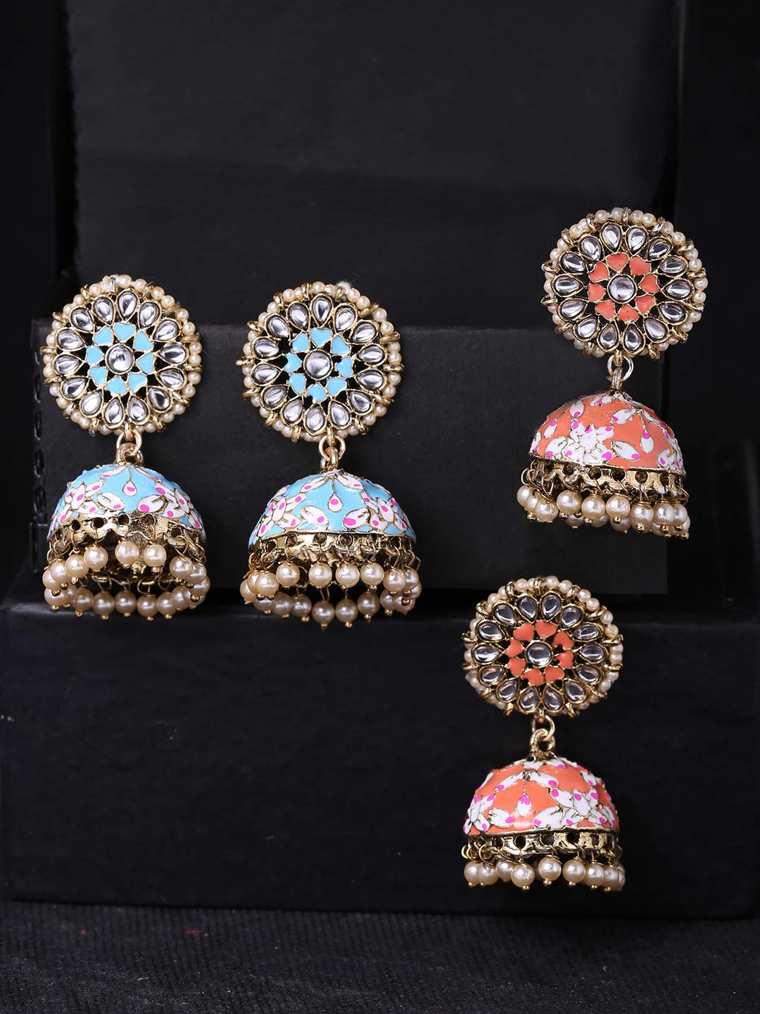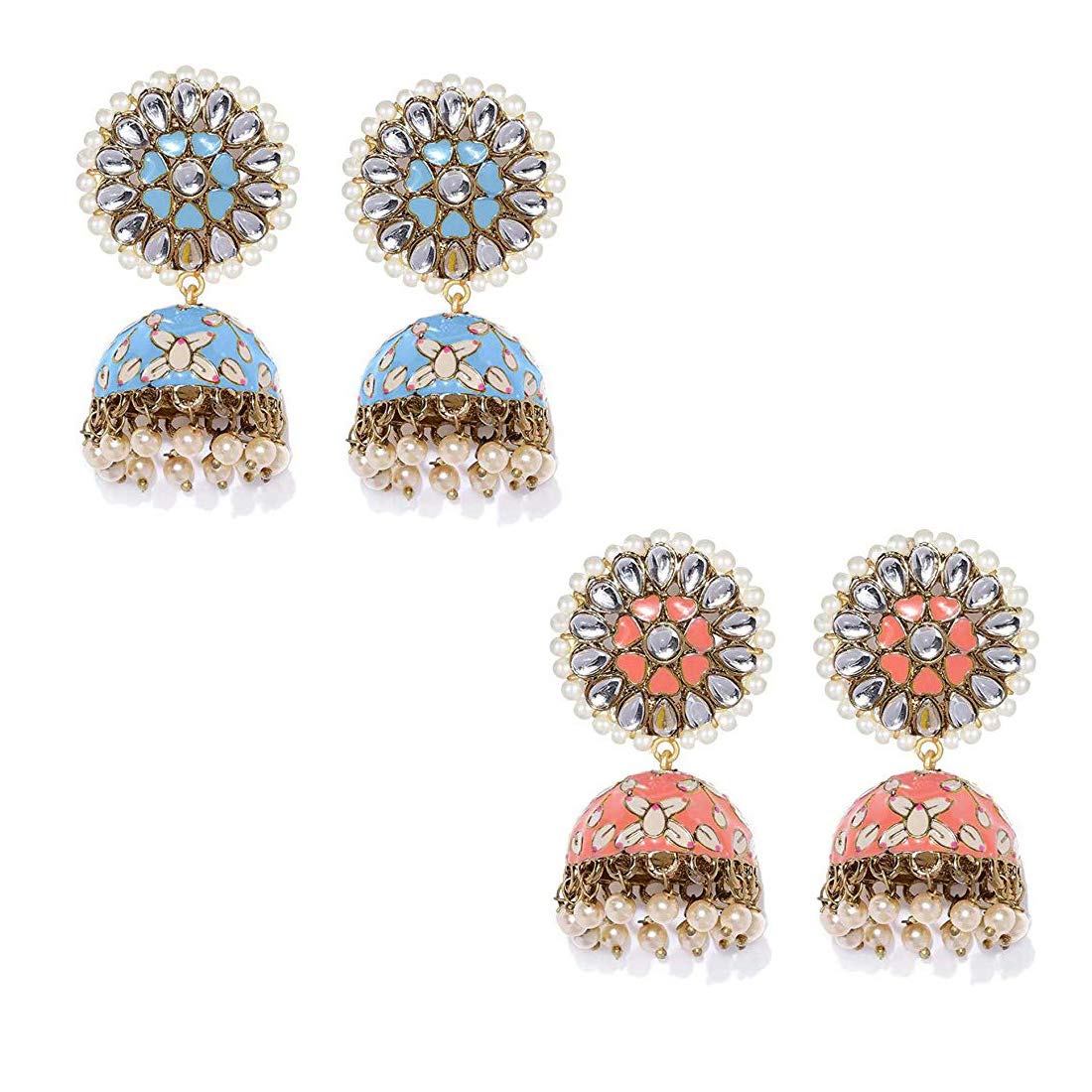 - Beauty - Combo of Two Pairs Stylish Artisan crafted Meenakari work Traditional Gold Plated Jhumka Earrings in Pastel Peach and Blue Shade. It will complement any Occasion Ethnic Wear.