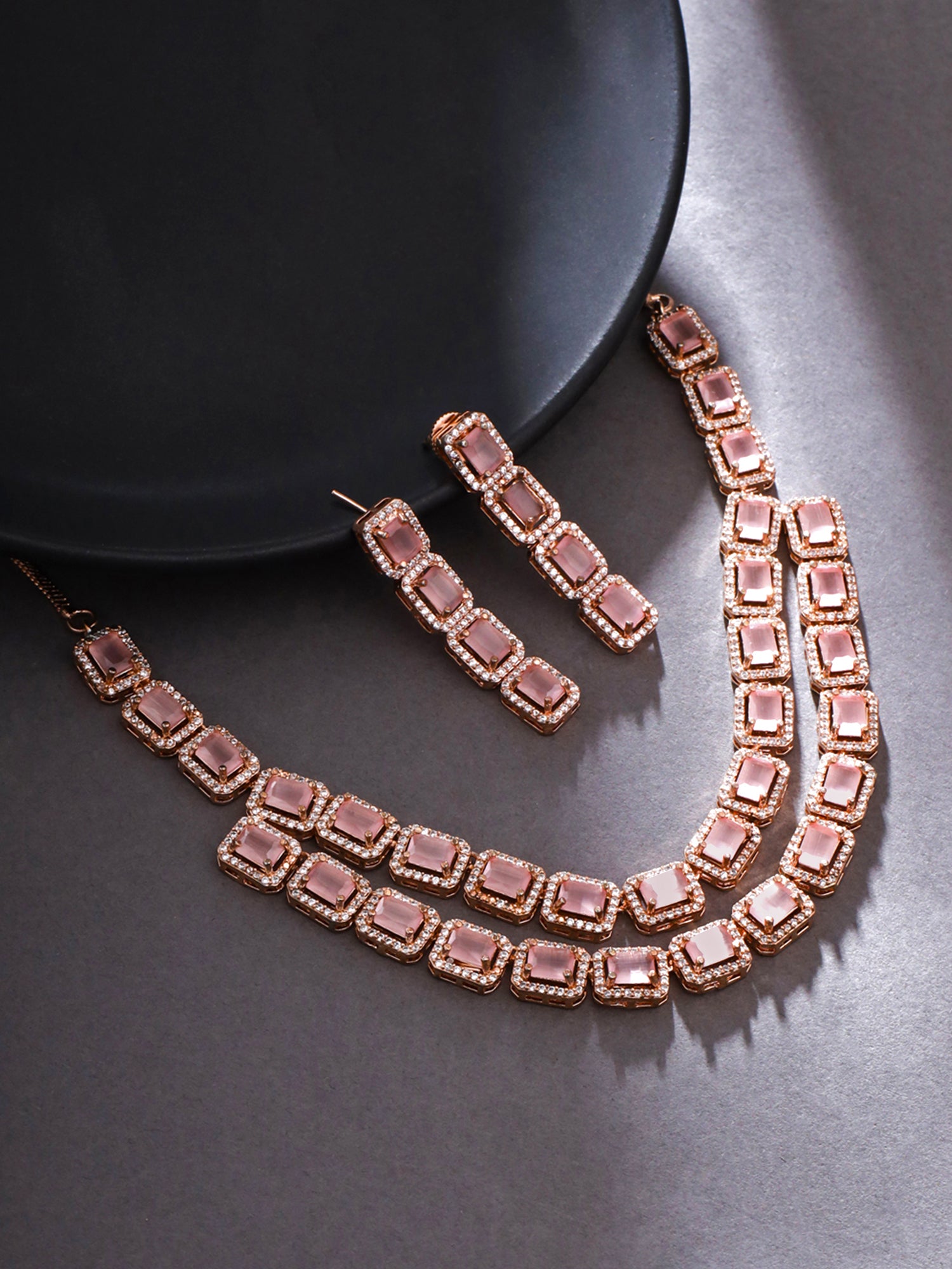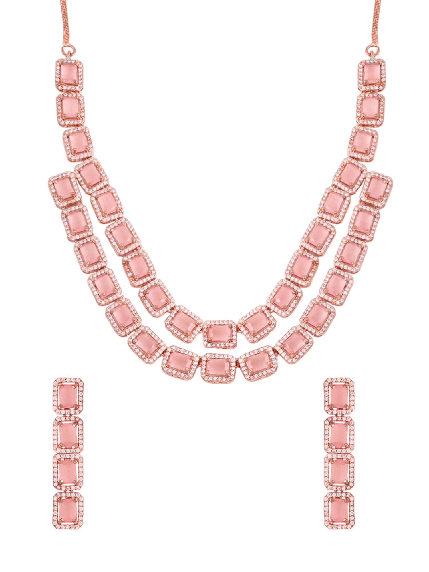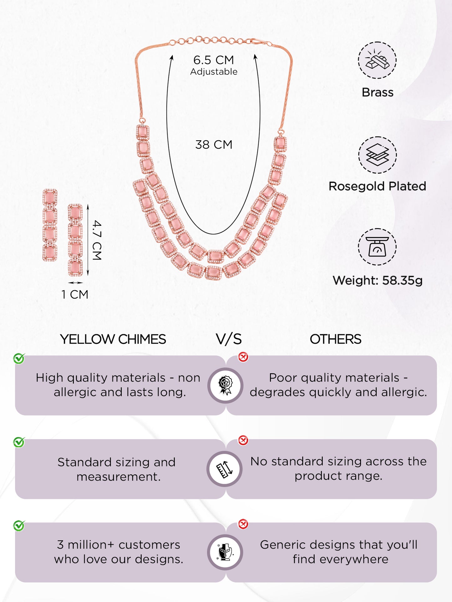 Yellow Chimes Diamond Necklace Set for Women | White Stone Rose Gold Necklace Set | AD Jewellery Set for Girls | Diamond Necklace Set | Birthday Gift for Girls & Women Anniversary Gift for Wife ATTRACTIVE DESIGN: People love the beautiful design and high quality of this Exclusive American Diamond Collection Jewellery Set from Yellow Chimes. The intricate detailing and polished finish make it a standout accessory for any occasion, be it a party, wedding, or themed function. VERSATILE USAGE: Pair this stunning American Diamond Jewellery Set with a cocktail dress for a night out with friends, or with a saree for a wedding event. Its adjustable feature makes it suitable for various neck sizes, ensuring a comfortable and stylish fit for all occasions. SIZE DETAILS: Necklace Front length - 38 CM. Total length - 44.5 CM (including adjustable), Earrings Length is 4.7 CM * Width is 1 CM. Weight is 58.35 gr. Material is Rosegold Plated and Metal is Brass, Closure is Hook Clasp. Packaging: Your favorite piece of Jewellery will reach you in an Elegant Yellow Chimes box with safety and precautions. You can leave it to us the job of delivering your Jewellery in original condition to you at your door-step.