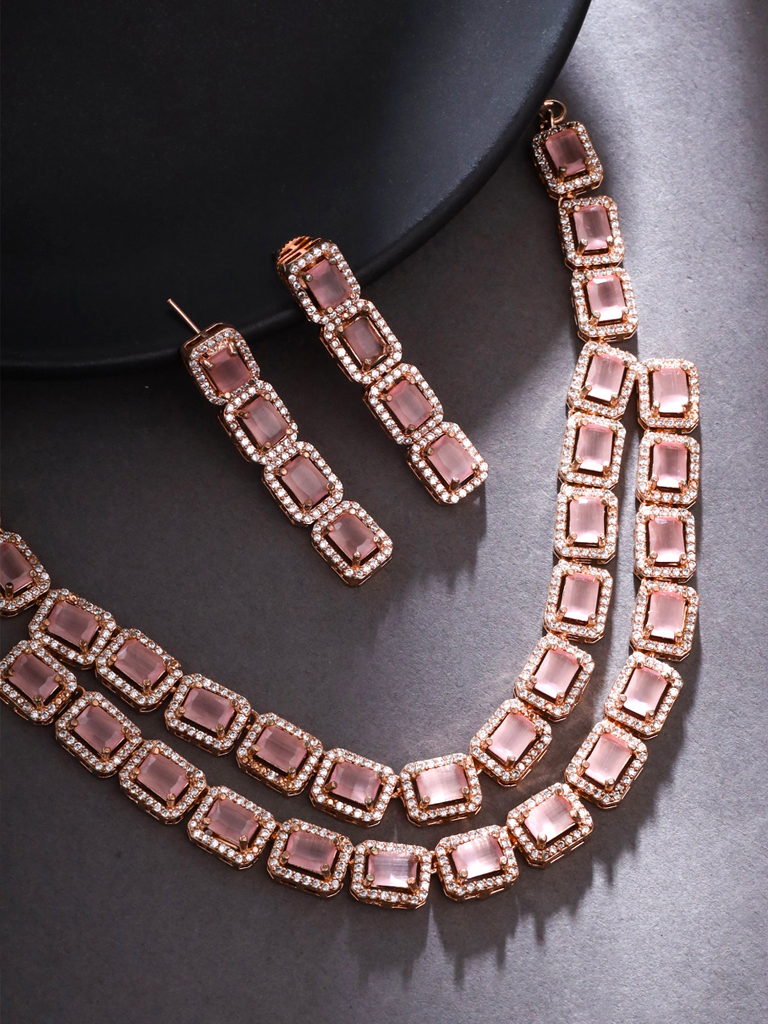 Diamond Necklace Set for Women | White Stone Rose Gold Necklace Set | AD Jewellery Set for Girls | Diamond Necklace Set | Birthday Gift for Girls & Women Anniversary Gift for Wife