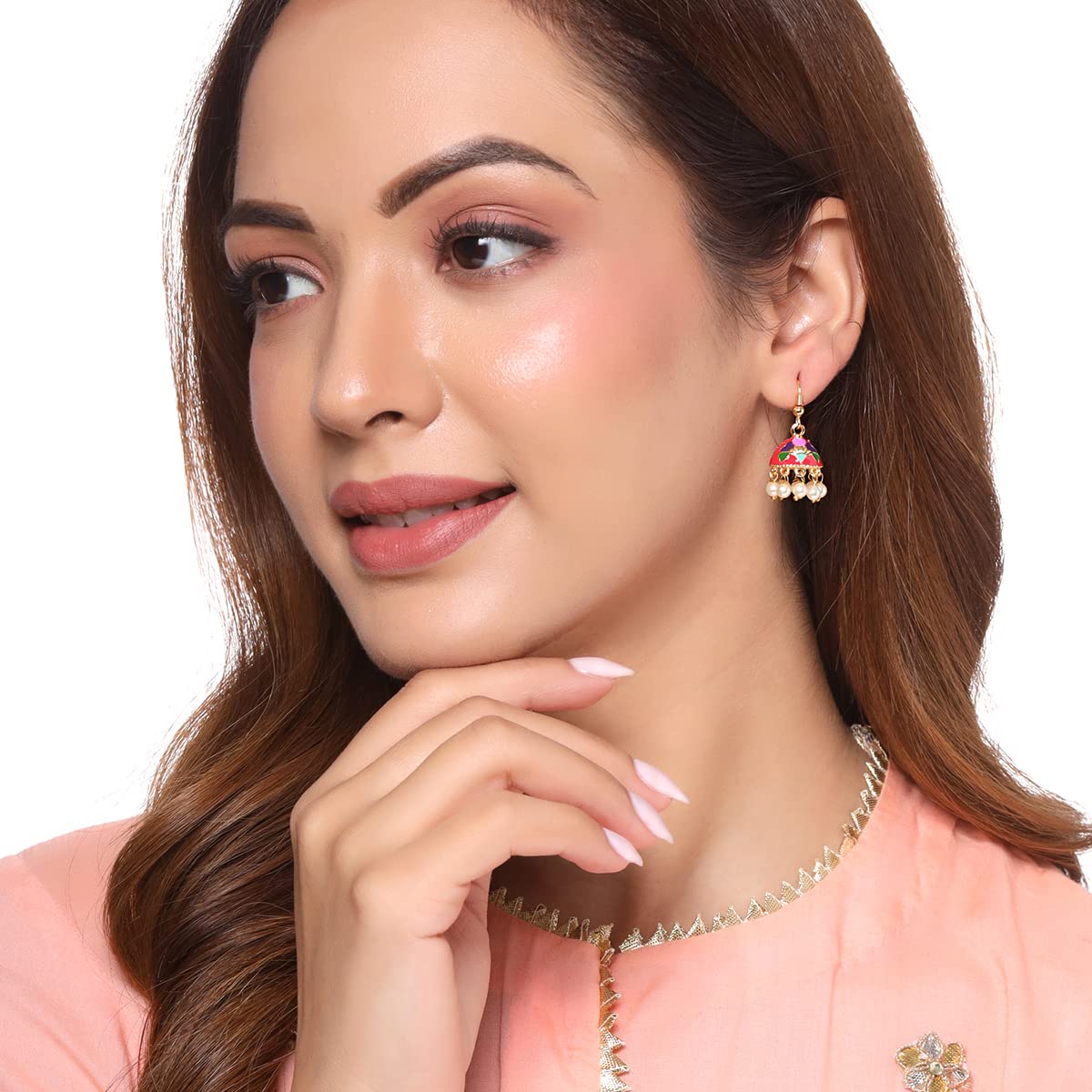 - Traditional Design: These Jhumka earrings showcase exquisite Meenakari work, perfect for adding a touch of sophistication to any outfit.