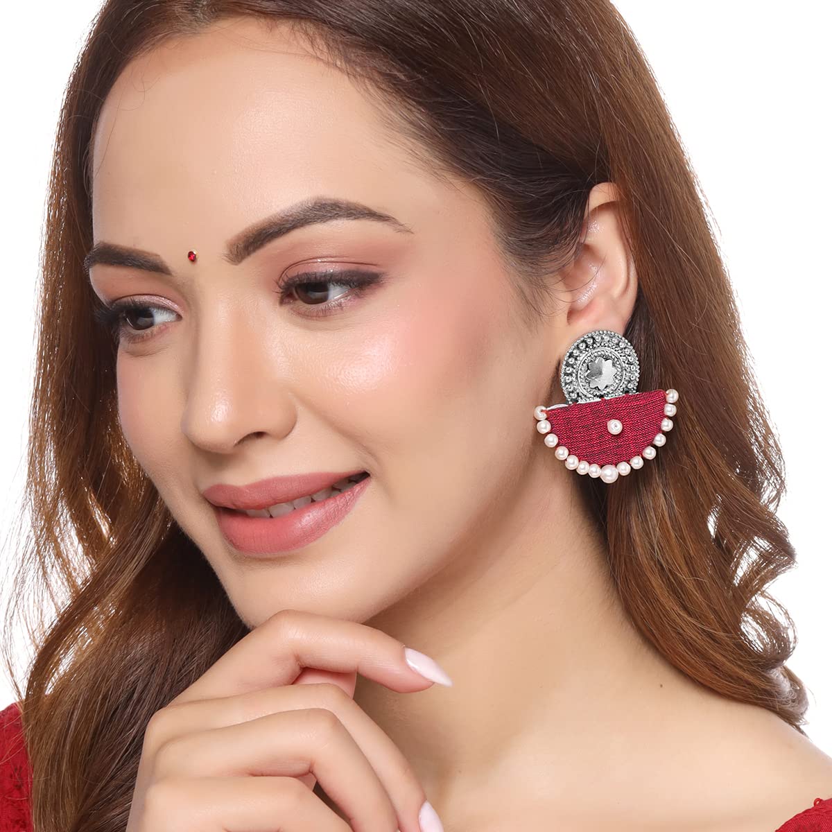 Earrings for Women and Girls Traditional Silver Oxidised Drop|Maroon Woven Wrapped Pearl Drop Earrings|Birthday Gift For girls and women Anniversary Gift for Wife