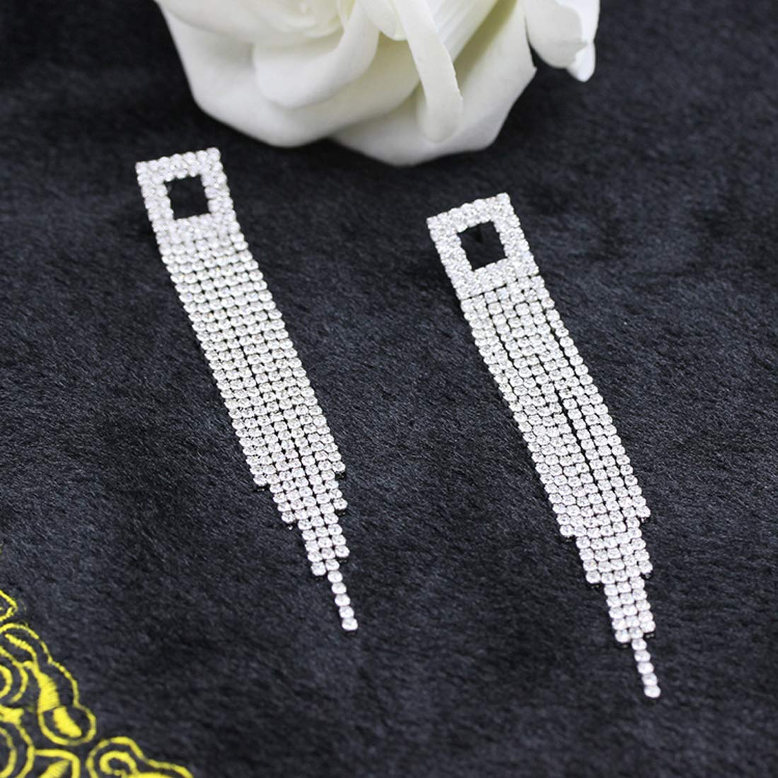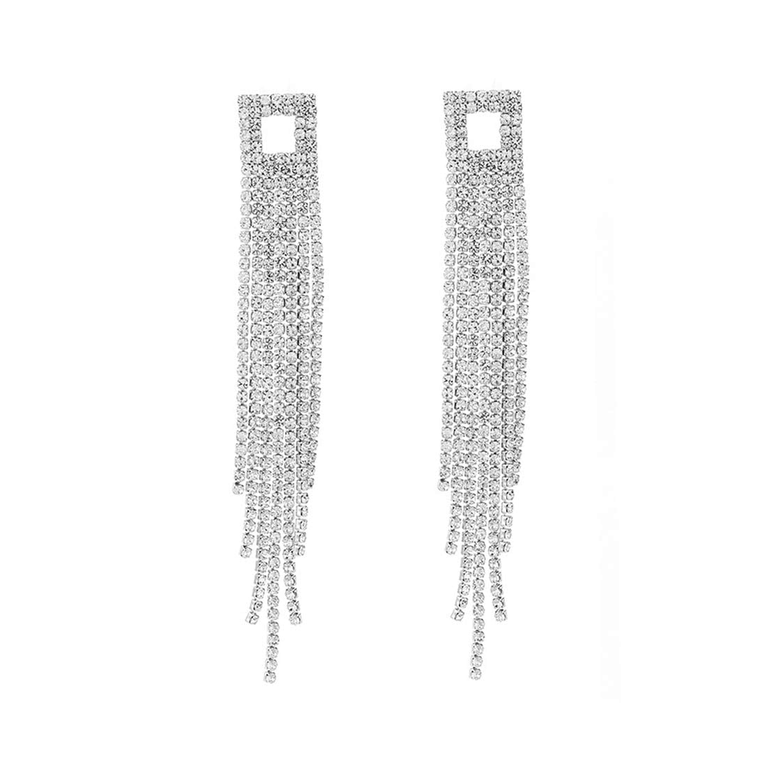 - Stunning Design: Featuring a striking silver-toned design that is accentuated with captivating crystals forming a square above beautifully engraved long chain danglers.