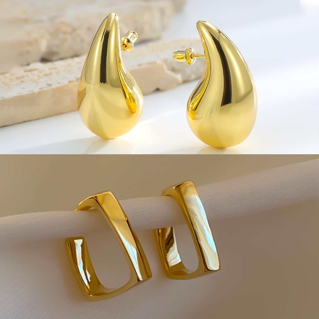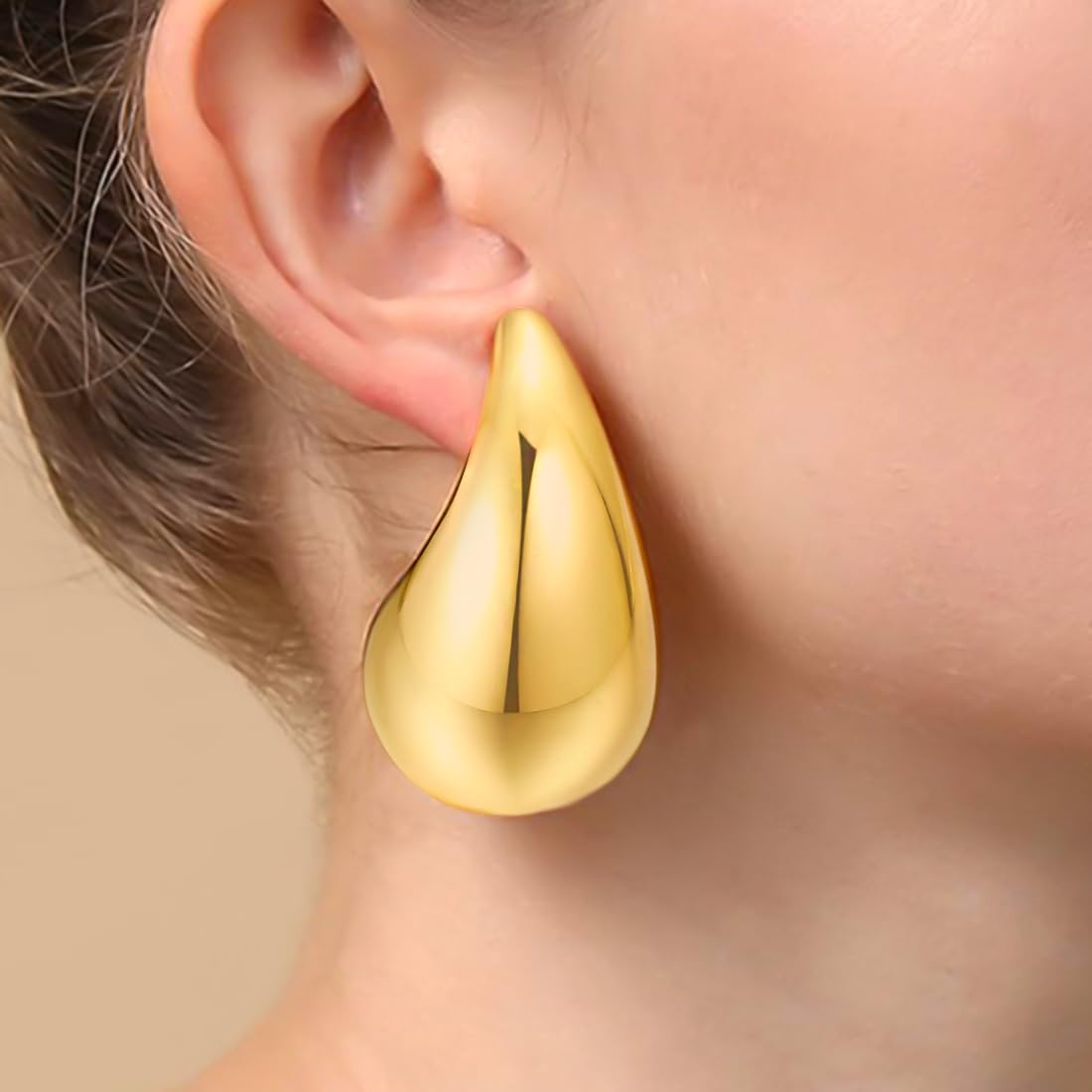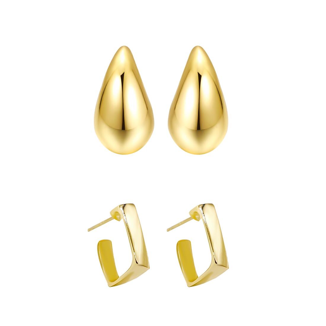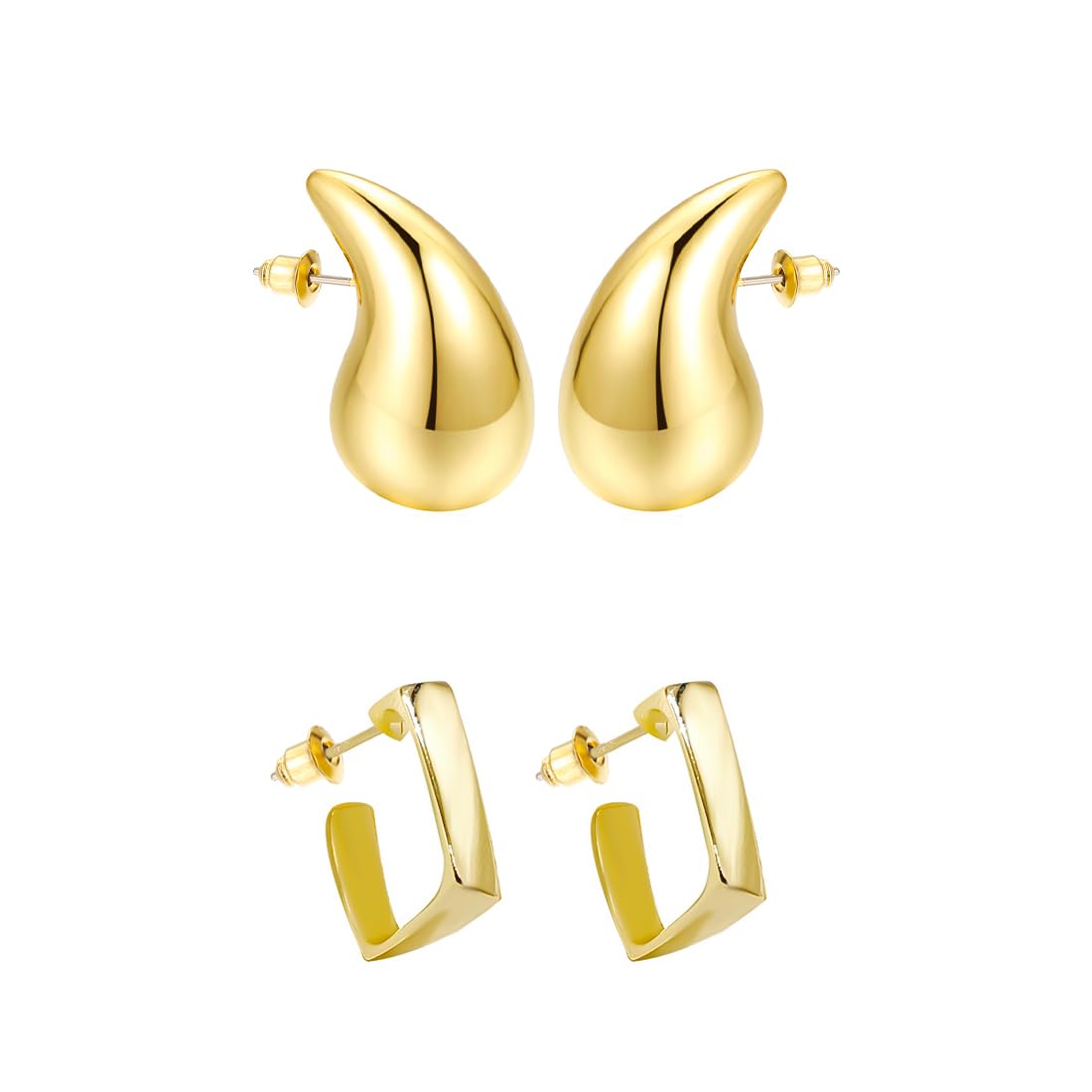 - The chunky style 2 pairs stud hoop earrings for women waterdrop tear drop shaped earrings. This chunky gold hoop earrings is a great accessory that can add a touch of elegance and sophistication to your look. It can be worn with any outfit and can be dressed up or down depending on the occasion.