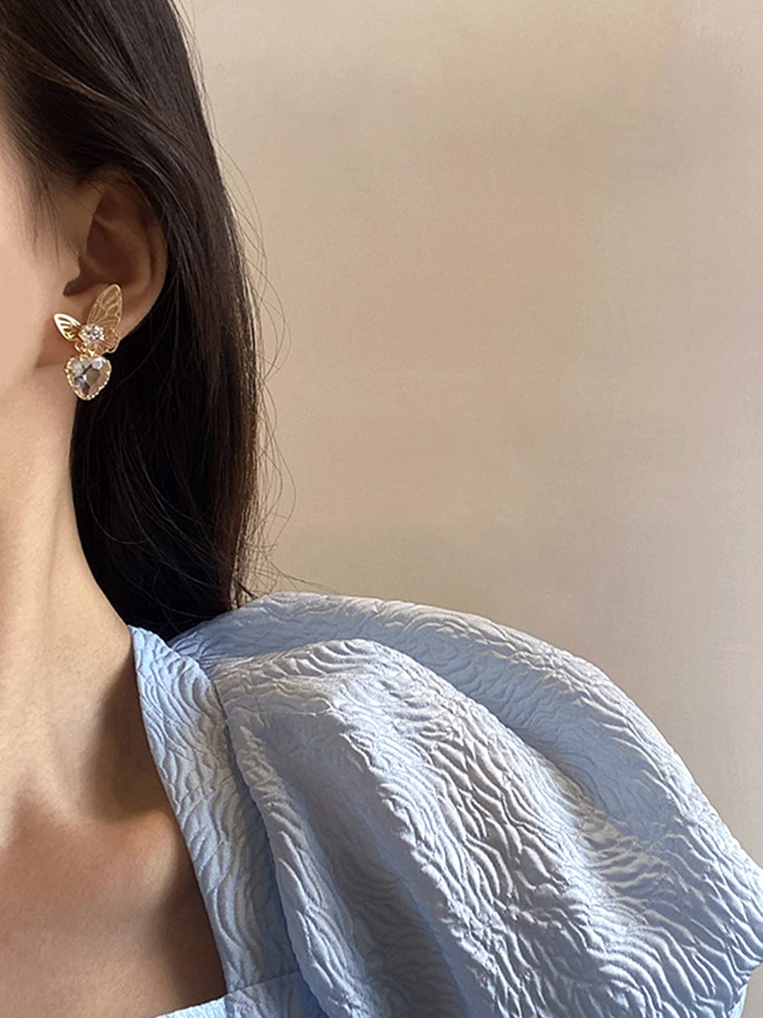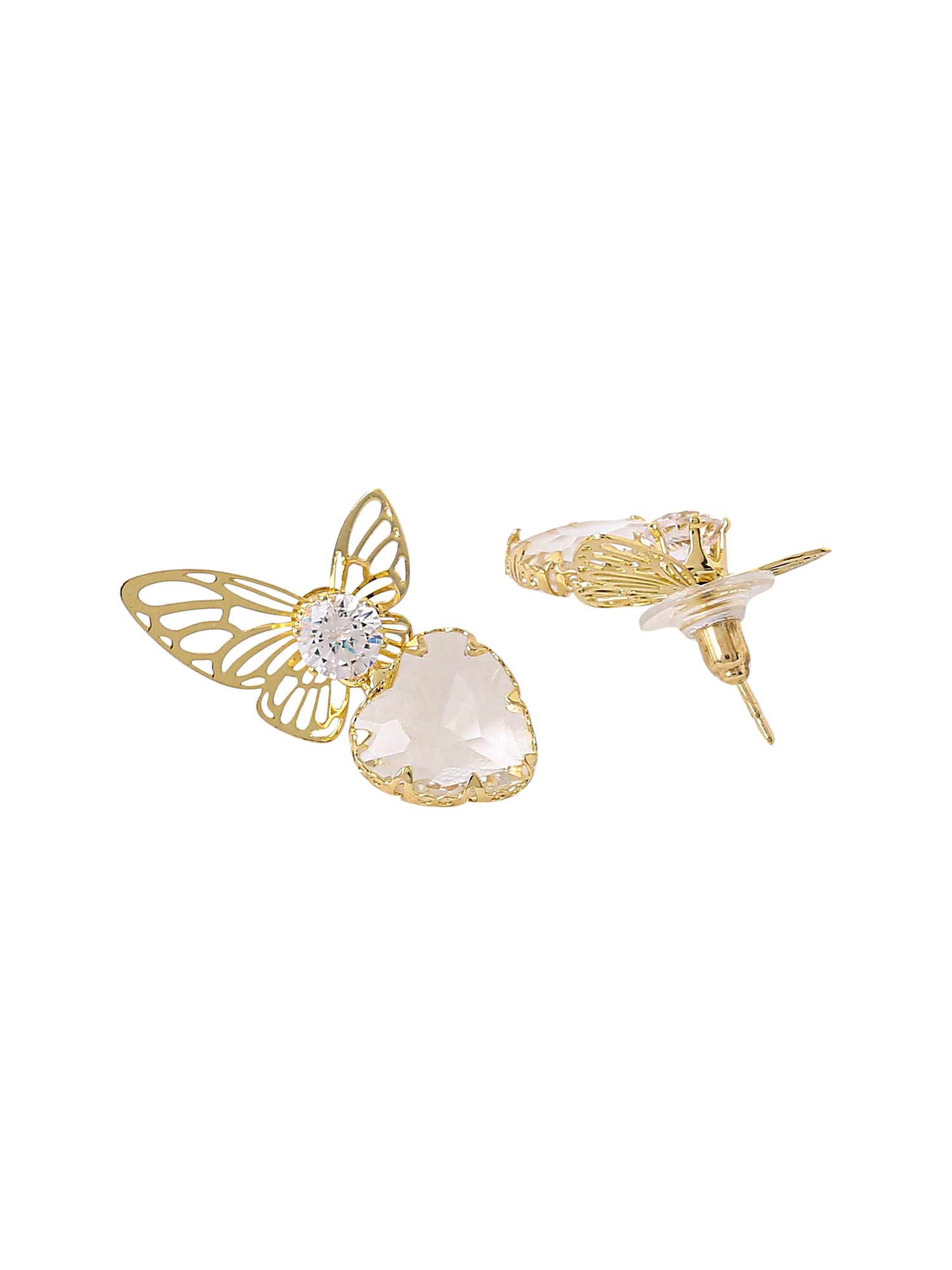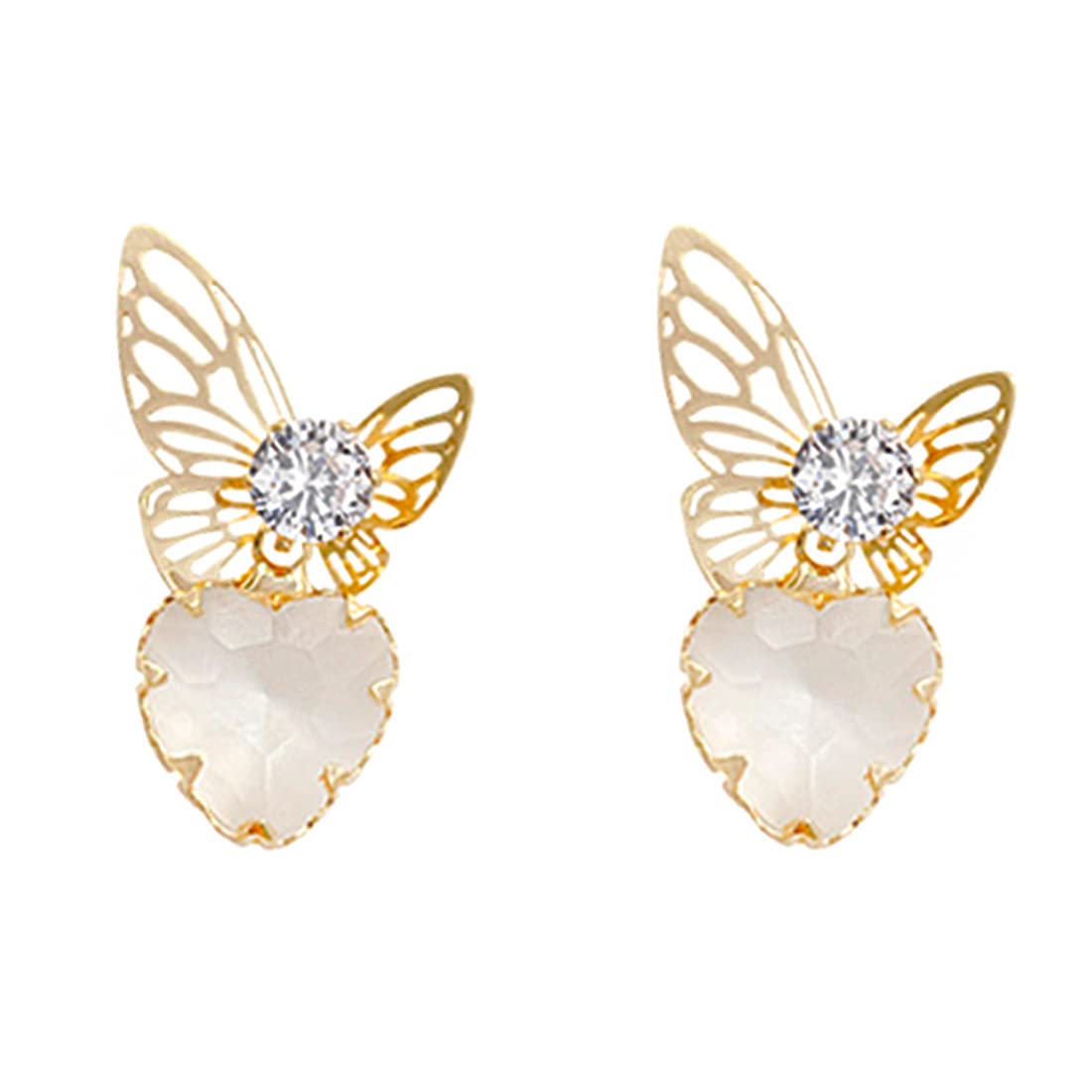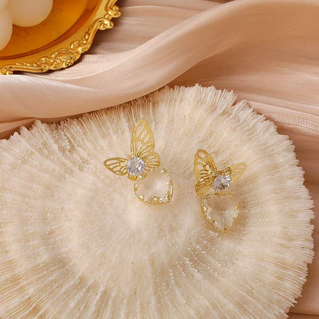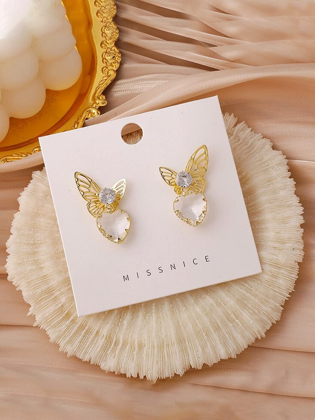 Crafted in lustrous gold-plated metal, these earrings feature a beautiful heart-shaped design adorned with sparkling crystals. The intricate butterfly heart artistic pattern ensures that you stand out in any crowd.