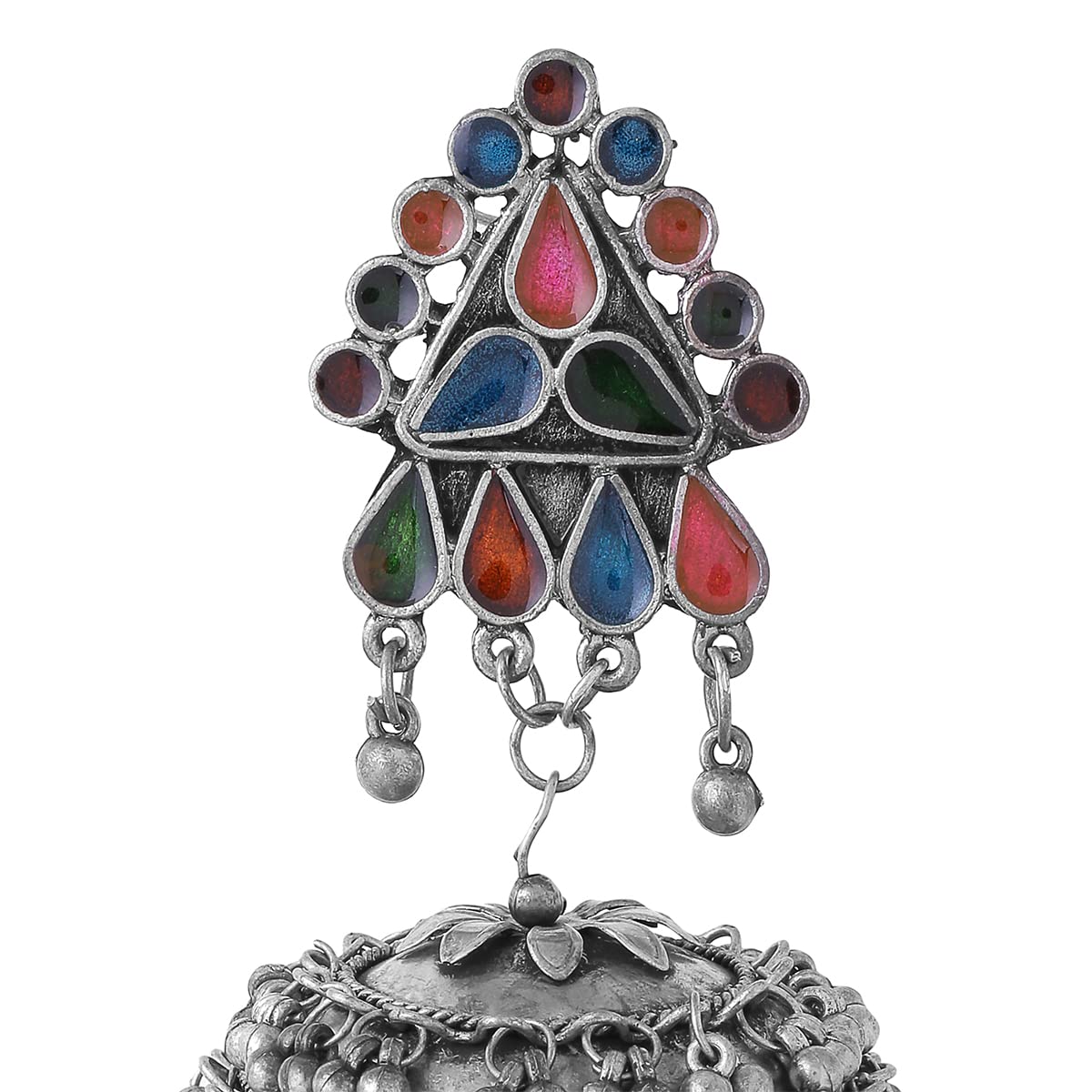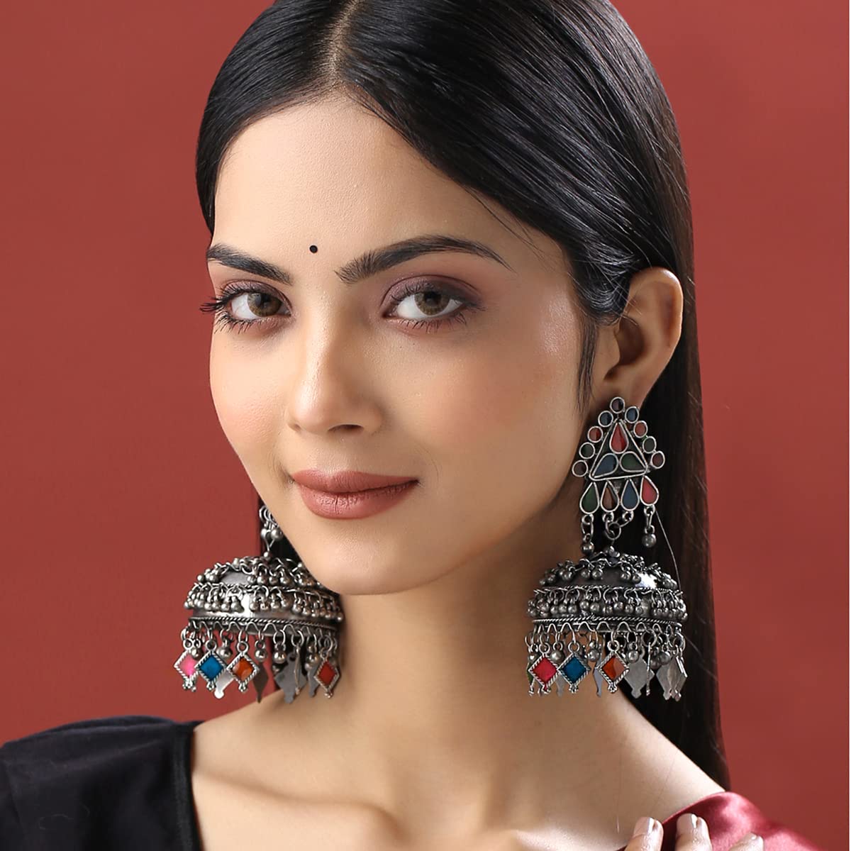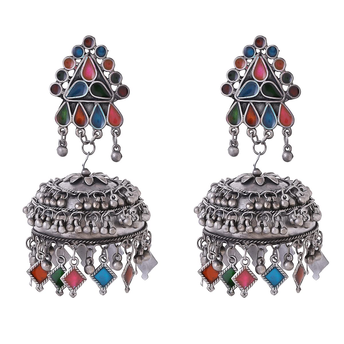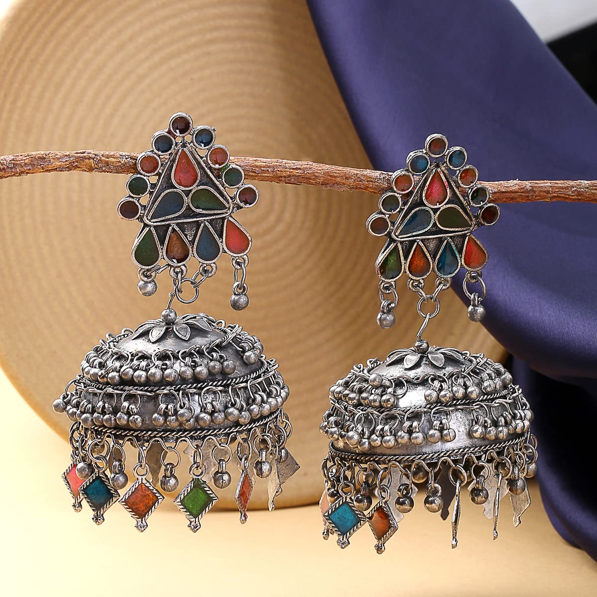 - Traditional Silver oxidised jhumka earrings Afghani style dome shaped Worked light weight Indian Silver oxidized jhumka earring for women multicolor Big size Jhumkas with Hanging Peals. Our Product is perfect for valentines Anniversary Birthday gift for Women,girlfriend,Wife.
