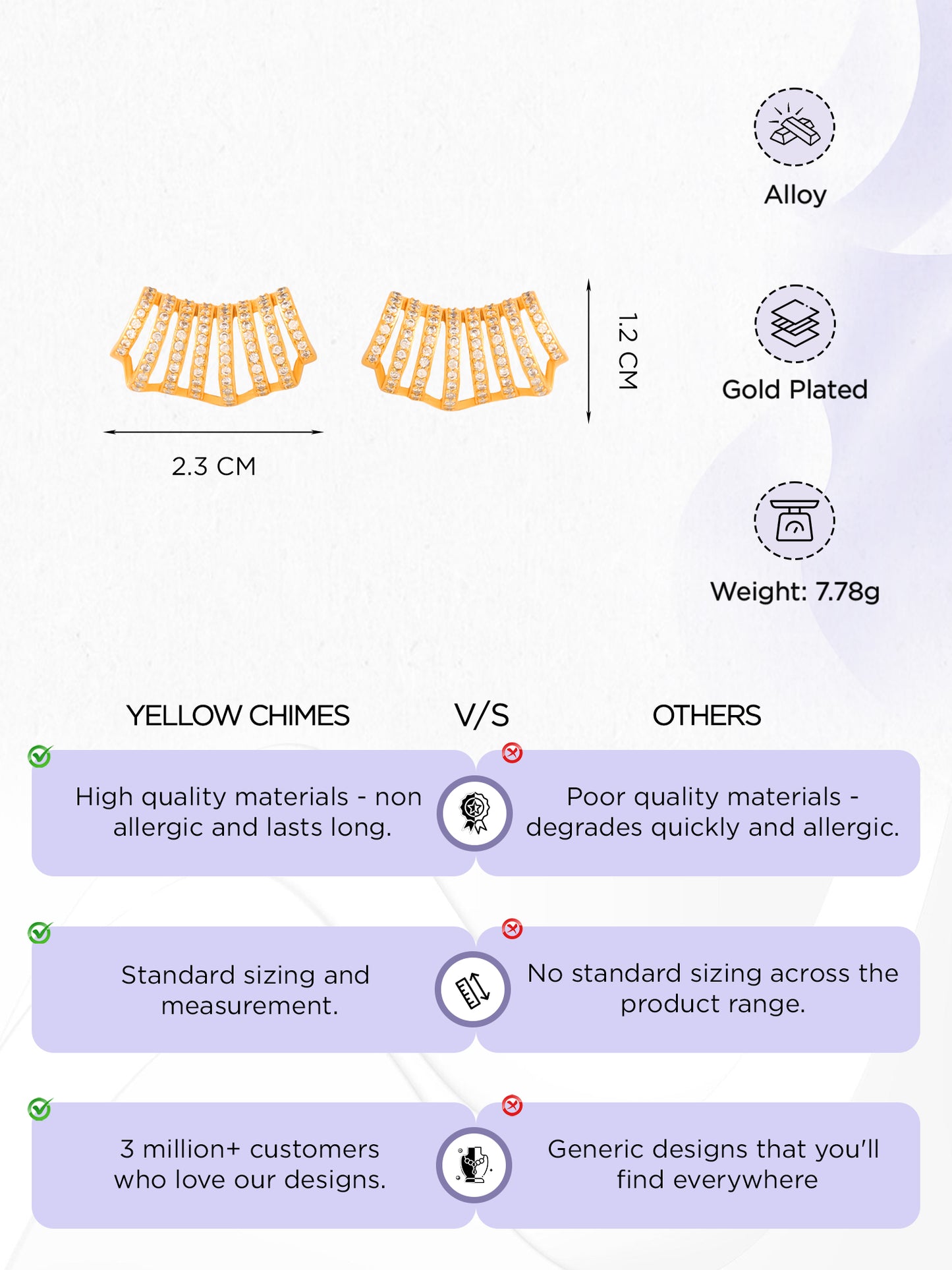 - Size Details: Earrings Length - 1.2cm,Width - 2.3cm. Weight - 7.78GM