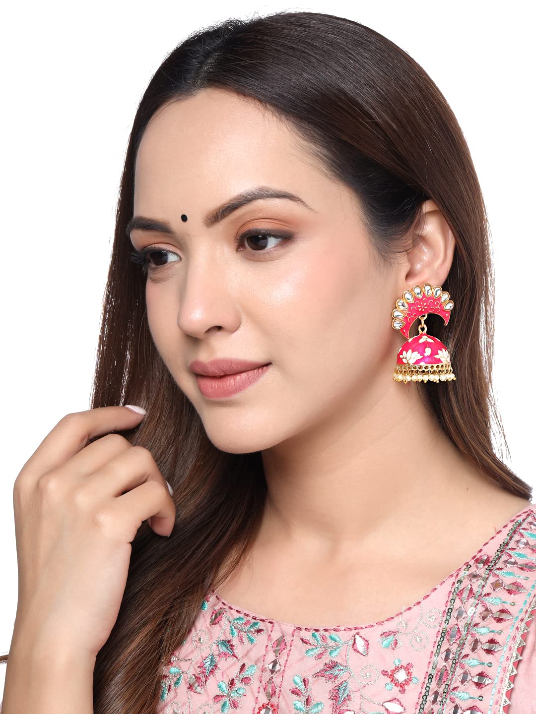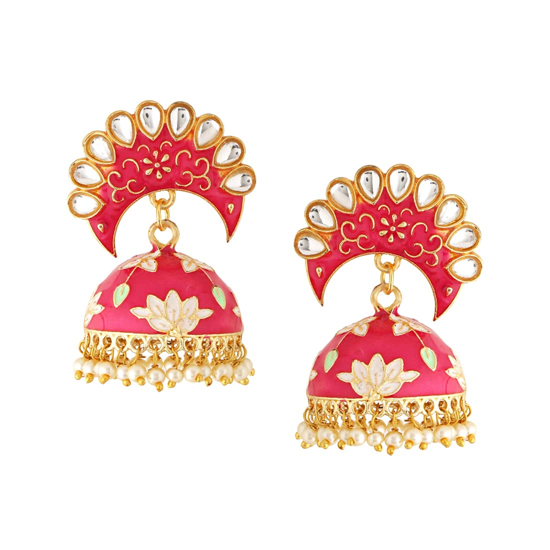 Yellow Chimes Earrings For Women Bright Pink Color Pearl and Stone Studded Meenakari Jhumka Earrings For Women and Girls