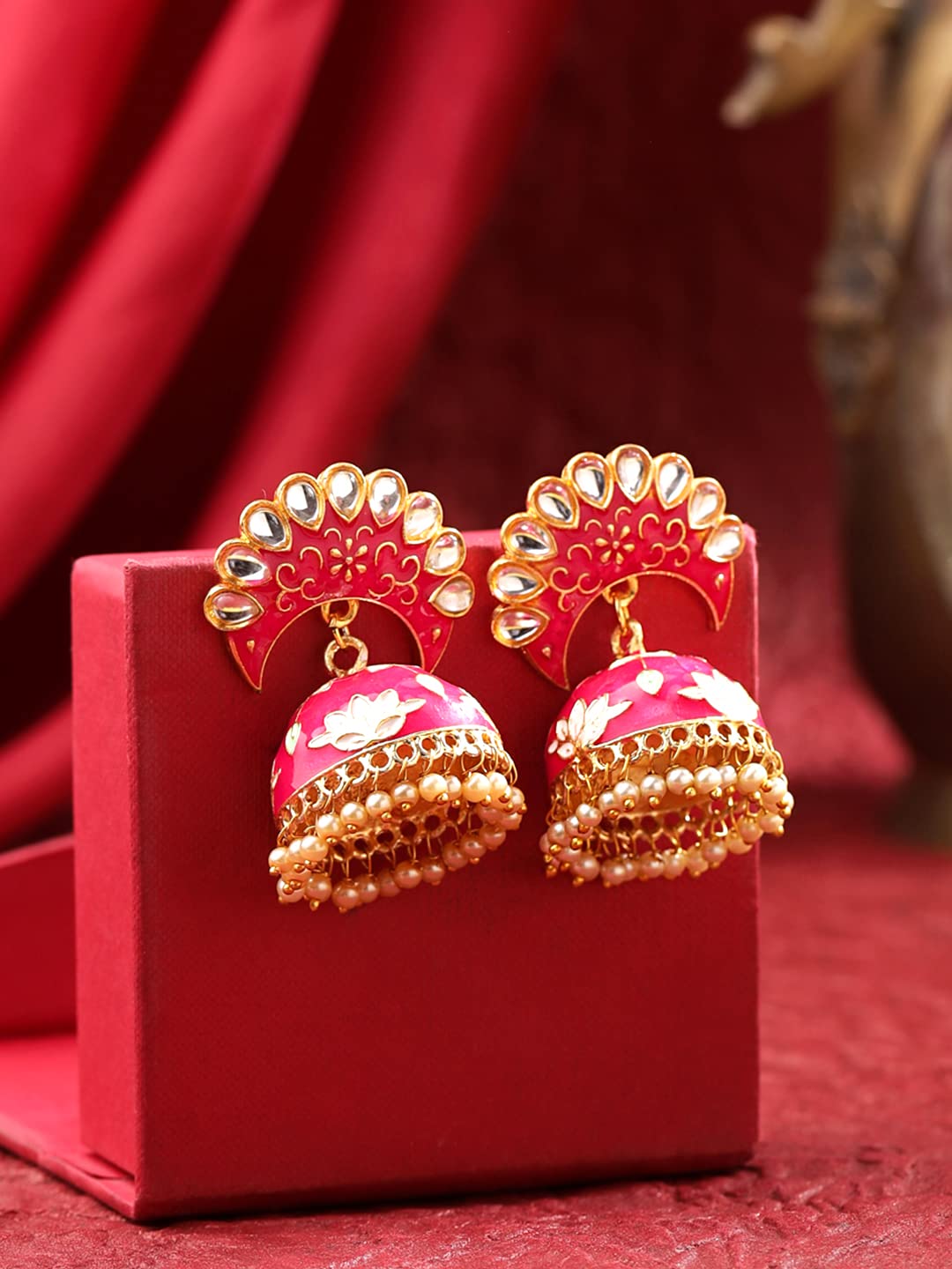 Earrings For Women Bright Pink Color Pearl and Stone Studded Meenakari Jhumka Earrings For Women and Girls