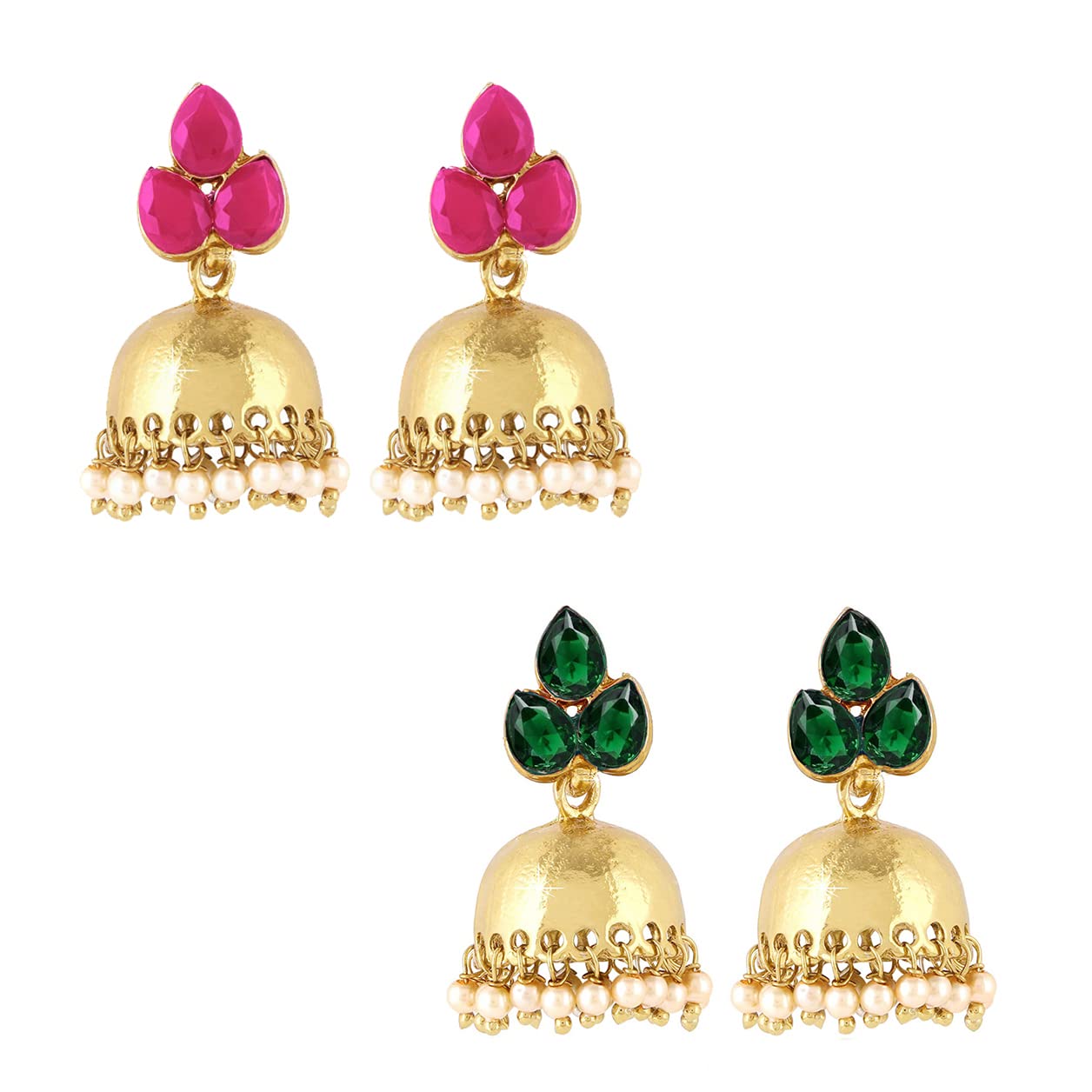 - Elegant Gold plated Pink Studded Stone Traditional Jhumka Earrings with Hanging Pearls Simple and Eye catched Earring. Our Product is perfect for valentines Anniversary Birthday gift for girlfriend and Wife.