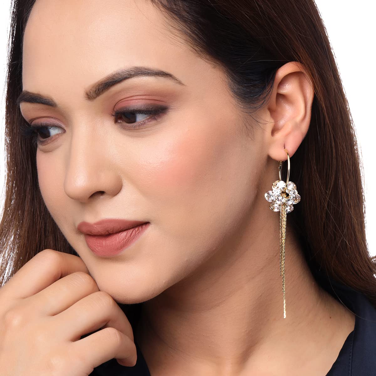 Elevate your accessory game with the stunning Yellow Chimes Earrings. These exquisite gold-tone hoop earrings feature attachable flower chain fringes, making them a perfect choice for women and girls who love to stand out.