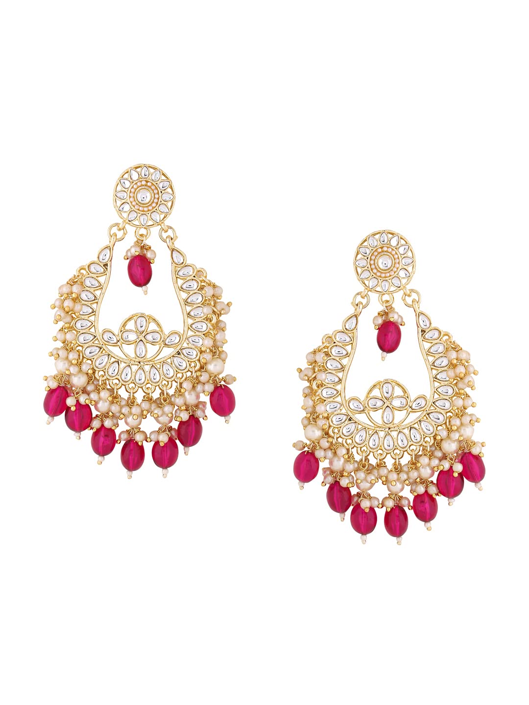 - This beautiful gold plated Chandbali Earrings showcases timeless ethnic style and traditional craftsmanship, embellished with Kundan stones and pearls adding to their charm.