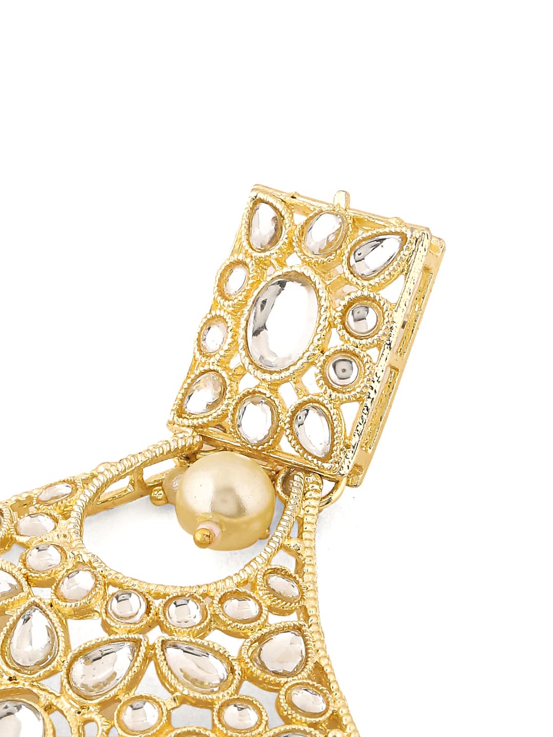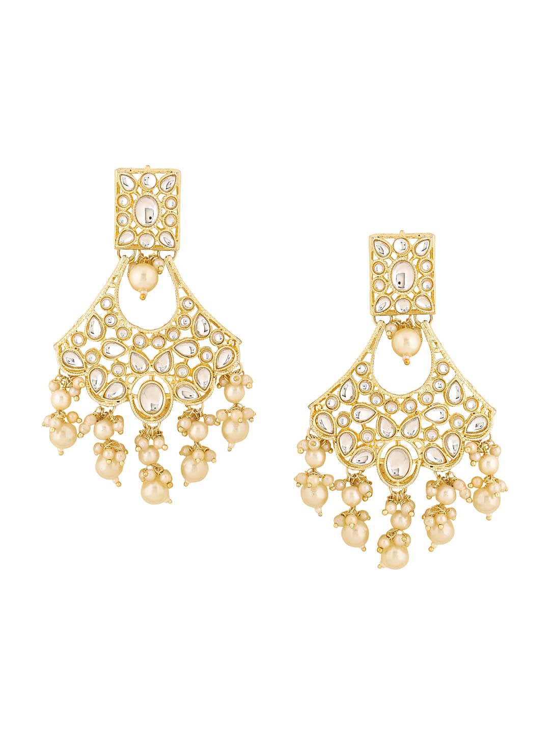 - This beautiful gold plated Dangler Earrings showcases timeless ethnic style and traditional craftsmanship, embellished with Kundan stones and pearls adding to their charm.
