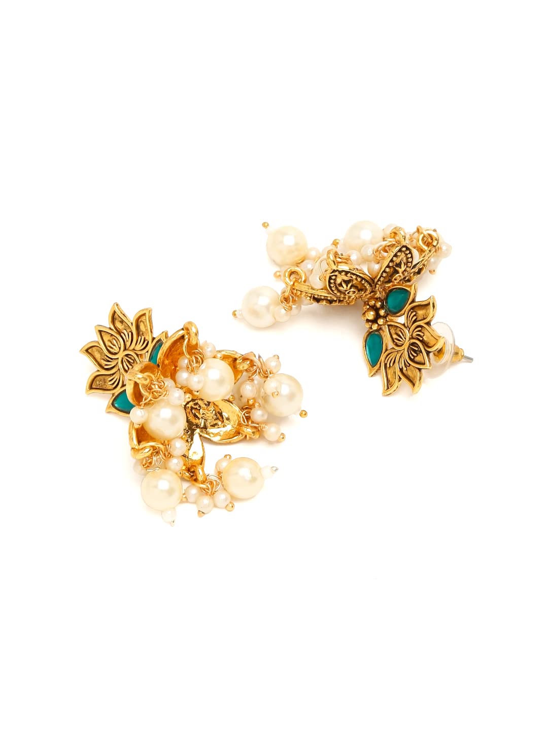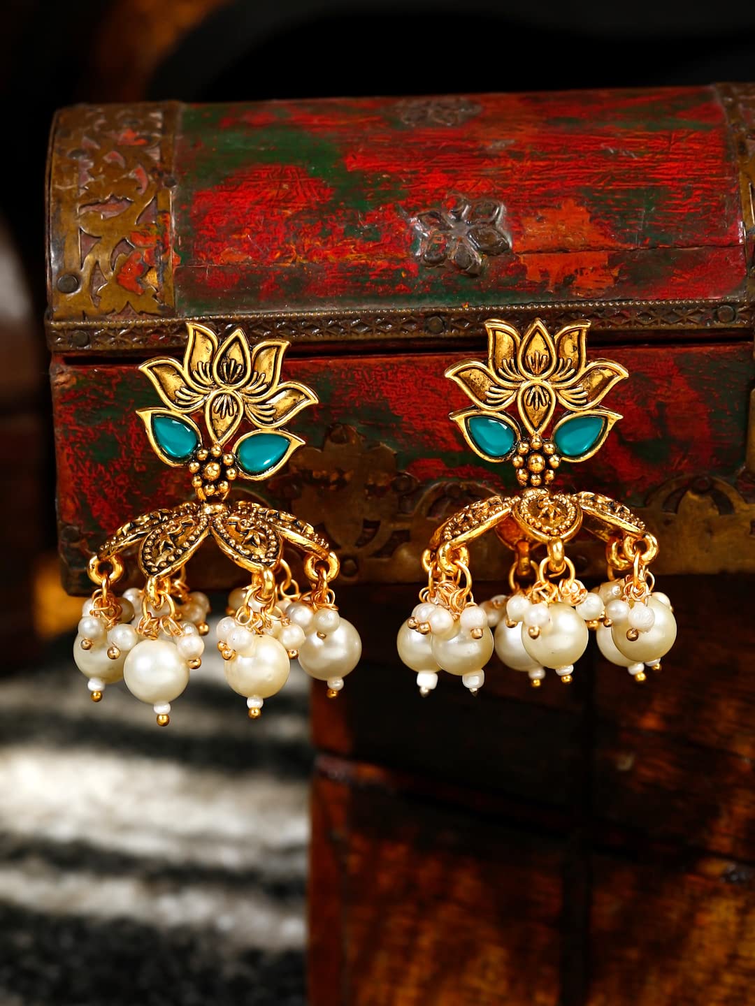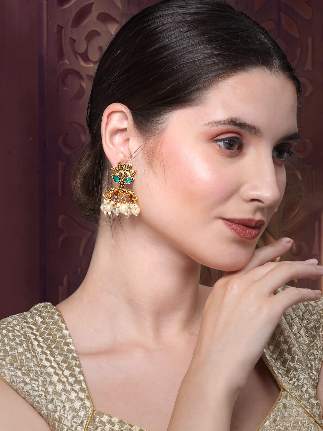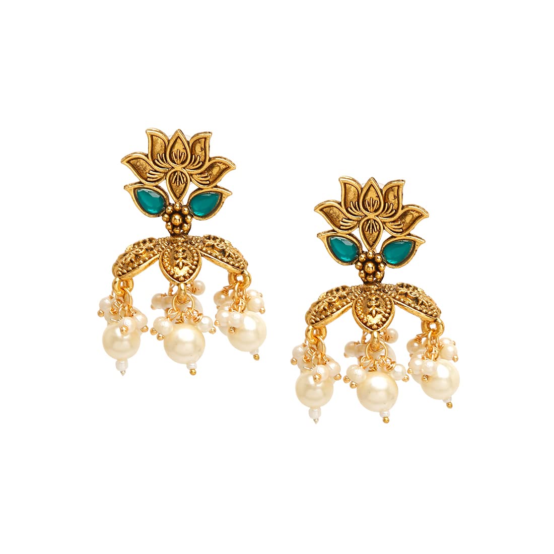 Earrings for Women Oxidised Gold Floral Designed Green Crystal Studded Beads Drop Designed Drop Earrings for Women and Girls