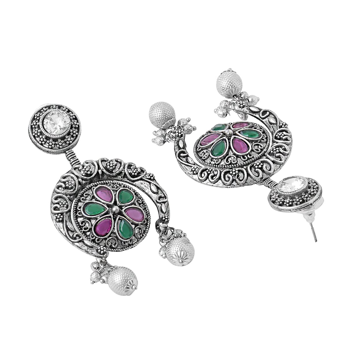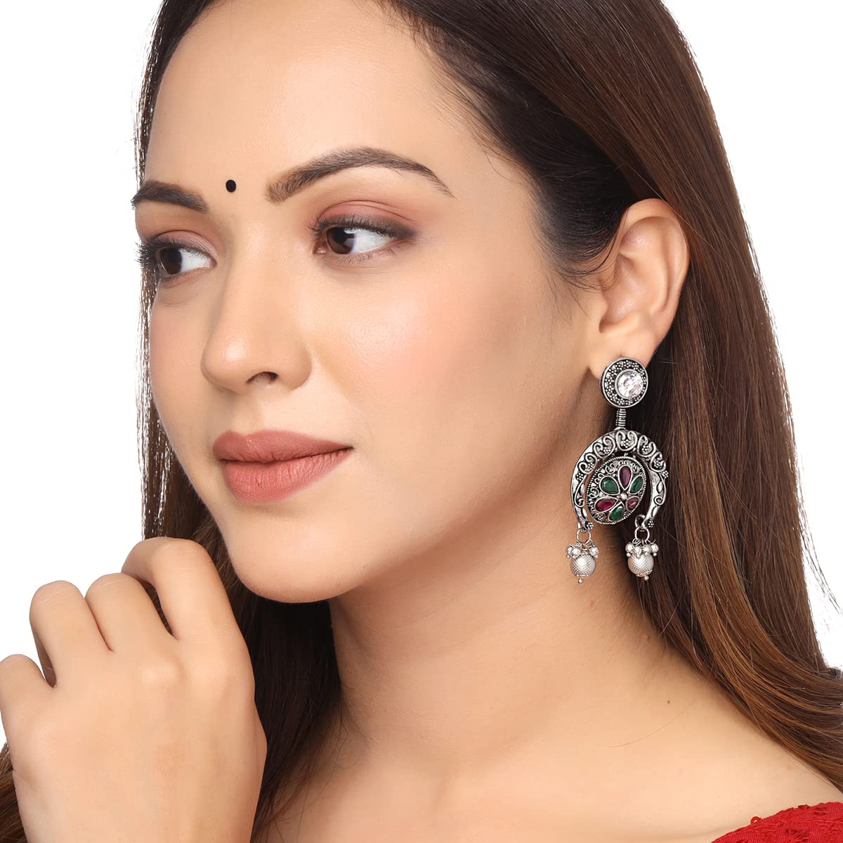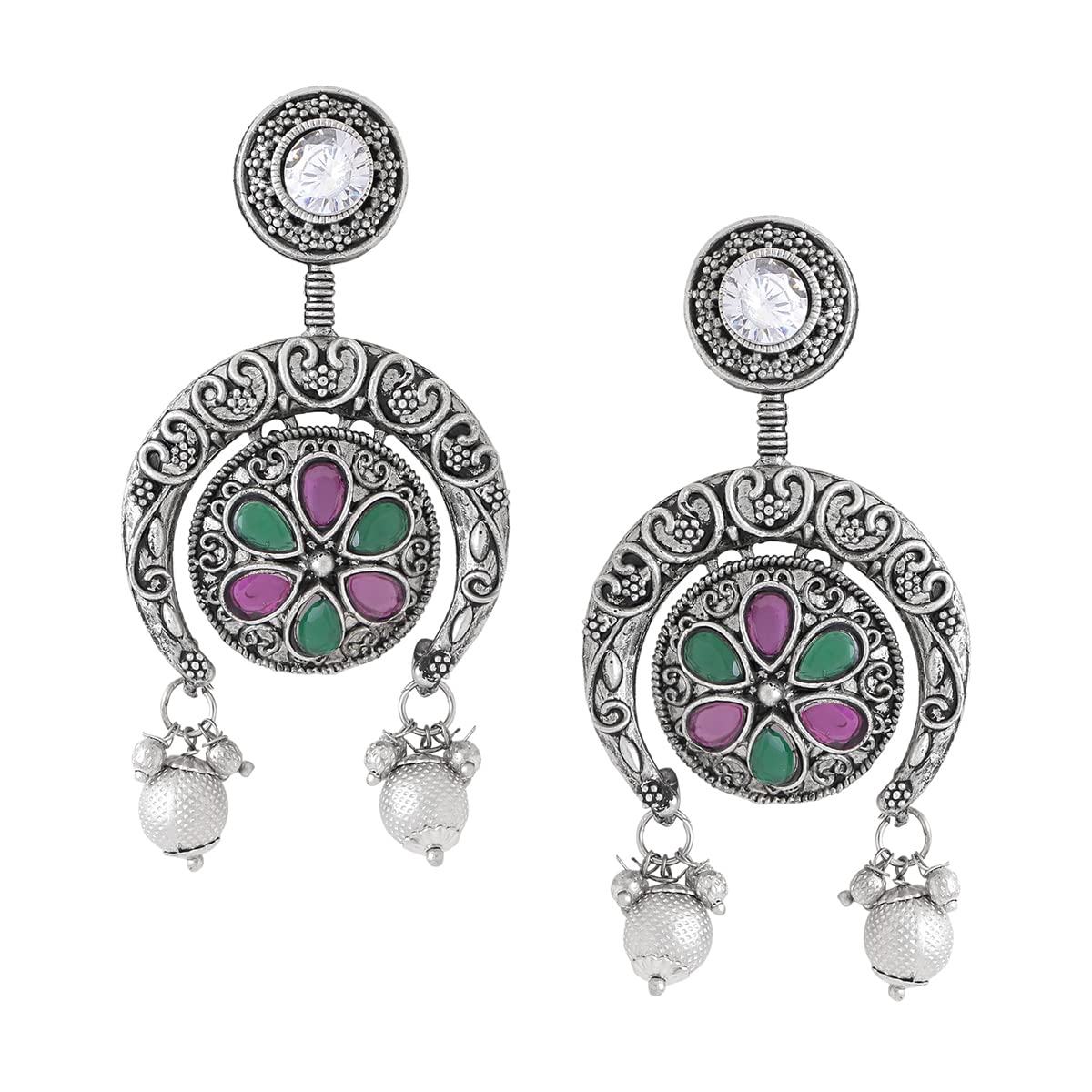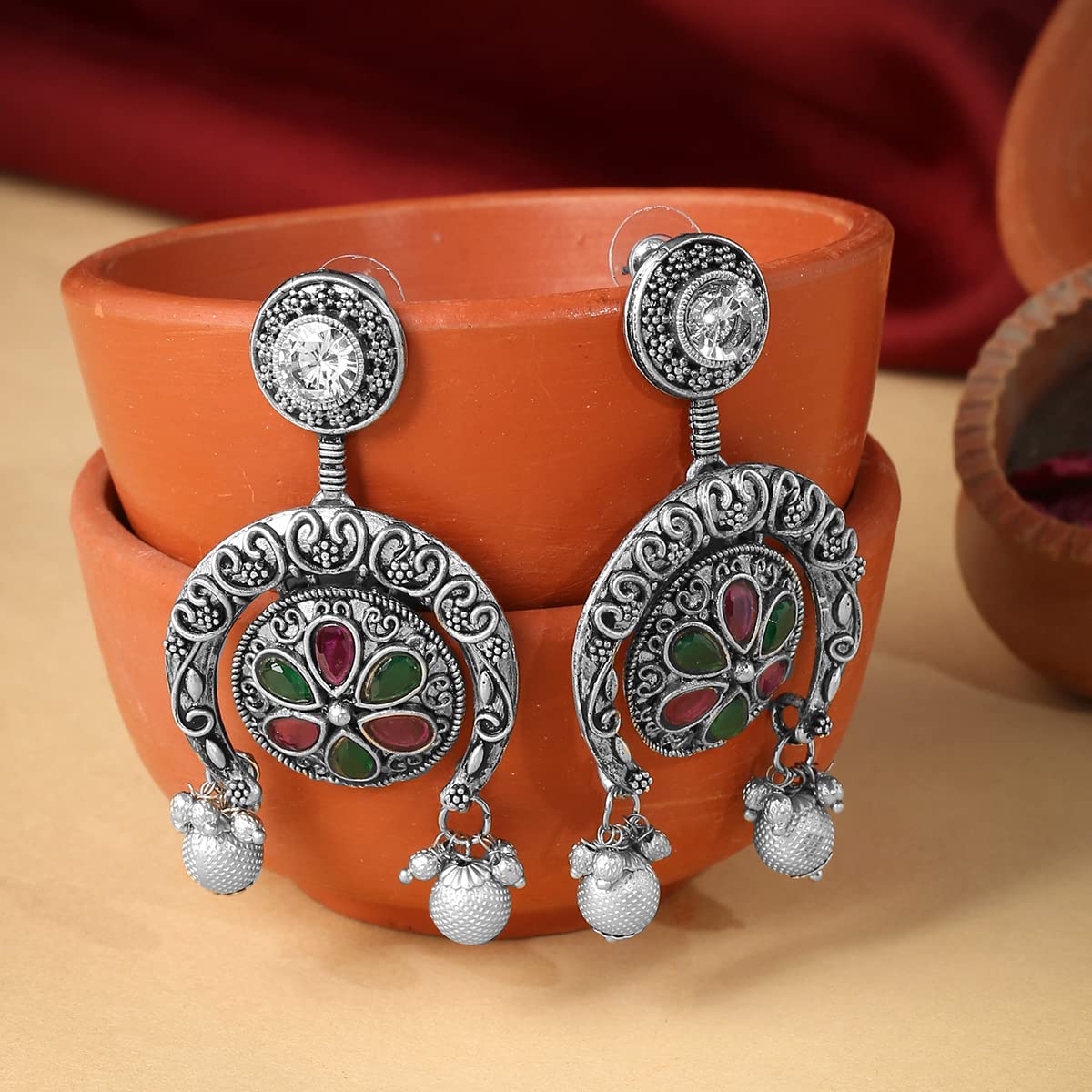 Earrings for Women Silver Oxidised Stone Studded Semi Round Drop Designed Earrings for Women and Girls