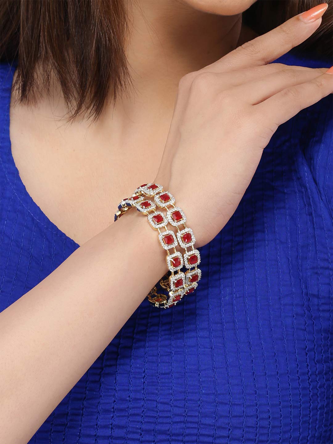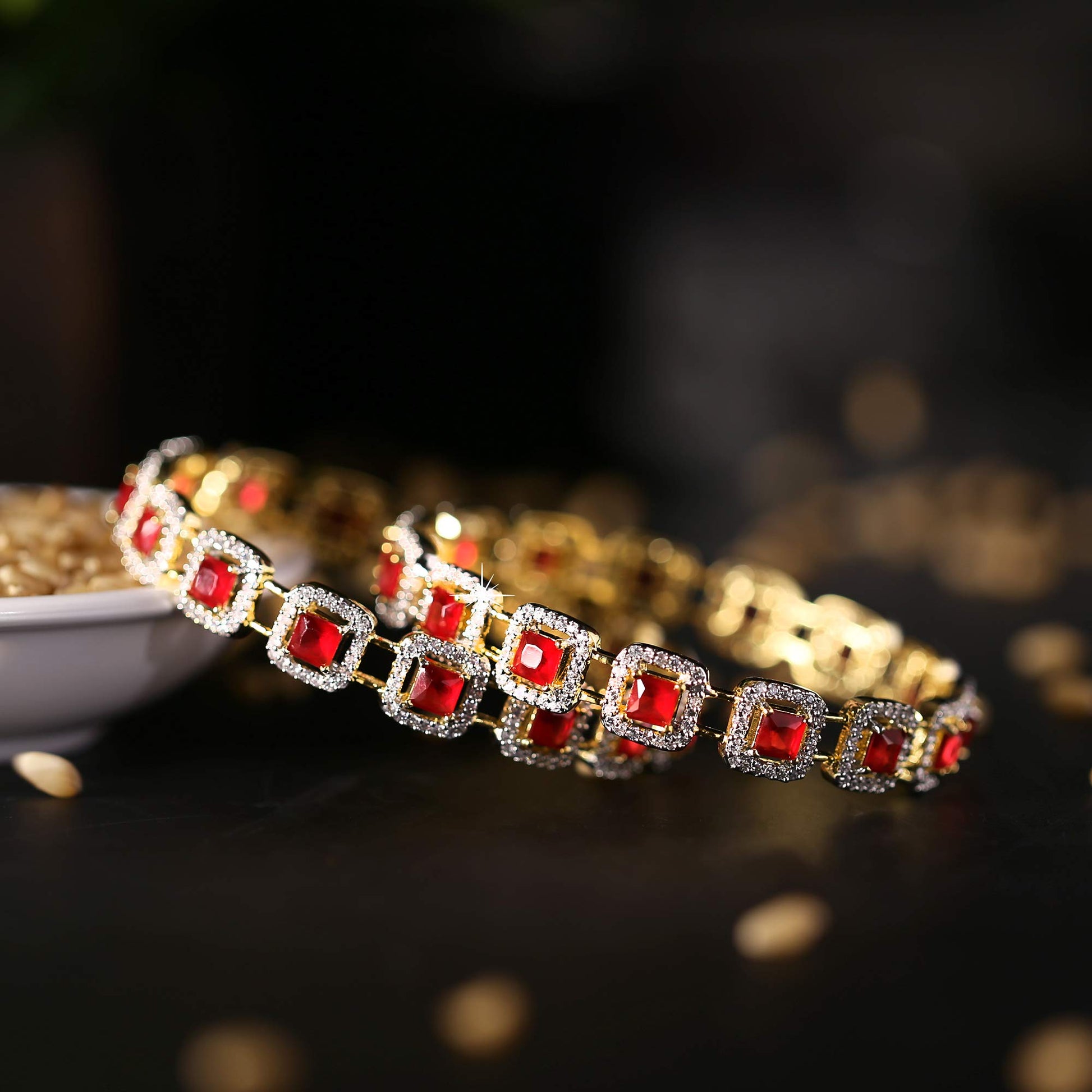 - Elegant Pretty adorable Stylish Ruby Ad/American Diamond Pink Crystal Studded 18k Gold Plated Designer Square Shaped Traditional Broad Bangles Jewellery are Ethnic yet Contemporary hold in its Design, can be worn on any Occasion to boost up your Attire Looks.