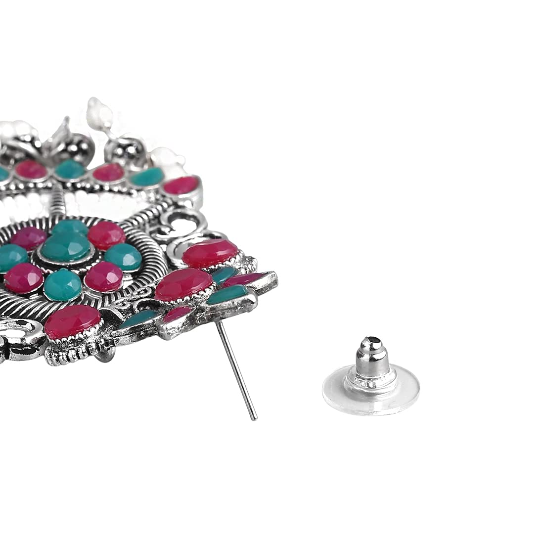 Ethnic German Silver Oxidised Multicolour Studded stones Flower Design Pearl Moti Traditional Chandbali Earrings for Women and Girls, Medium (YCTJER-90OXDCHDS-MC)
