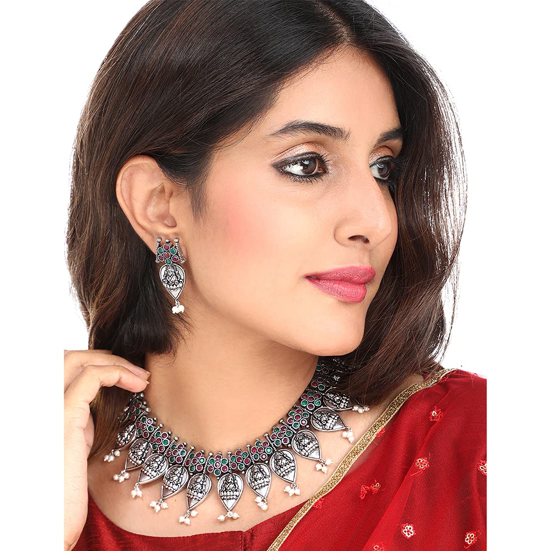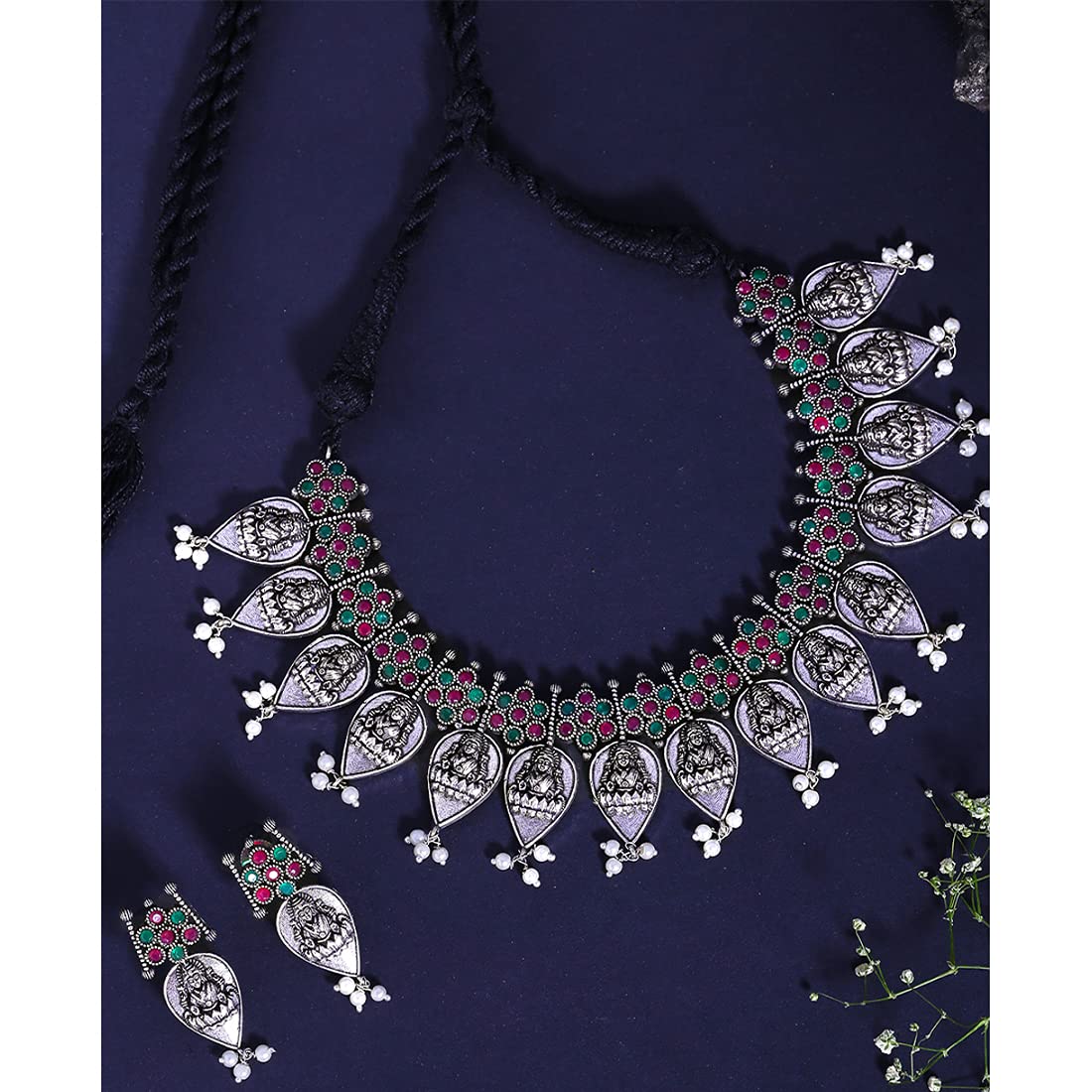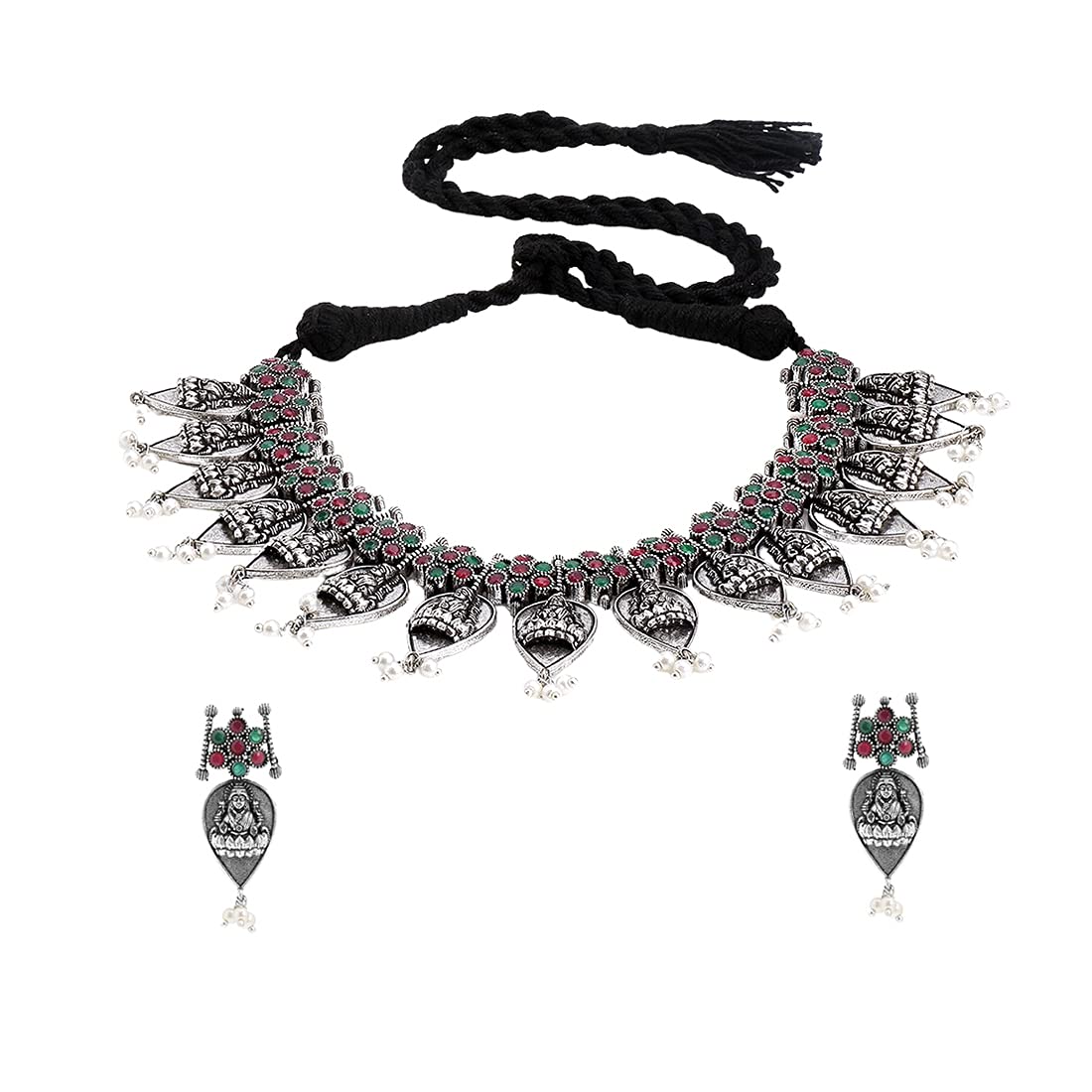 Introducing the Yellow Chimes Ethnic German Silver Oxidised Multicolour Studded Stones Moti Design Lakshmi Choker Necklace Set