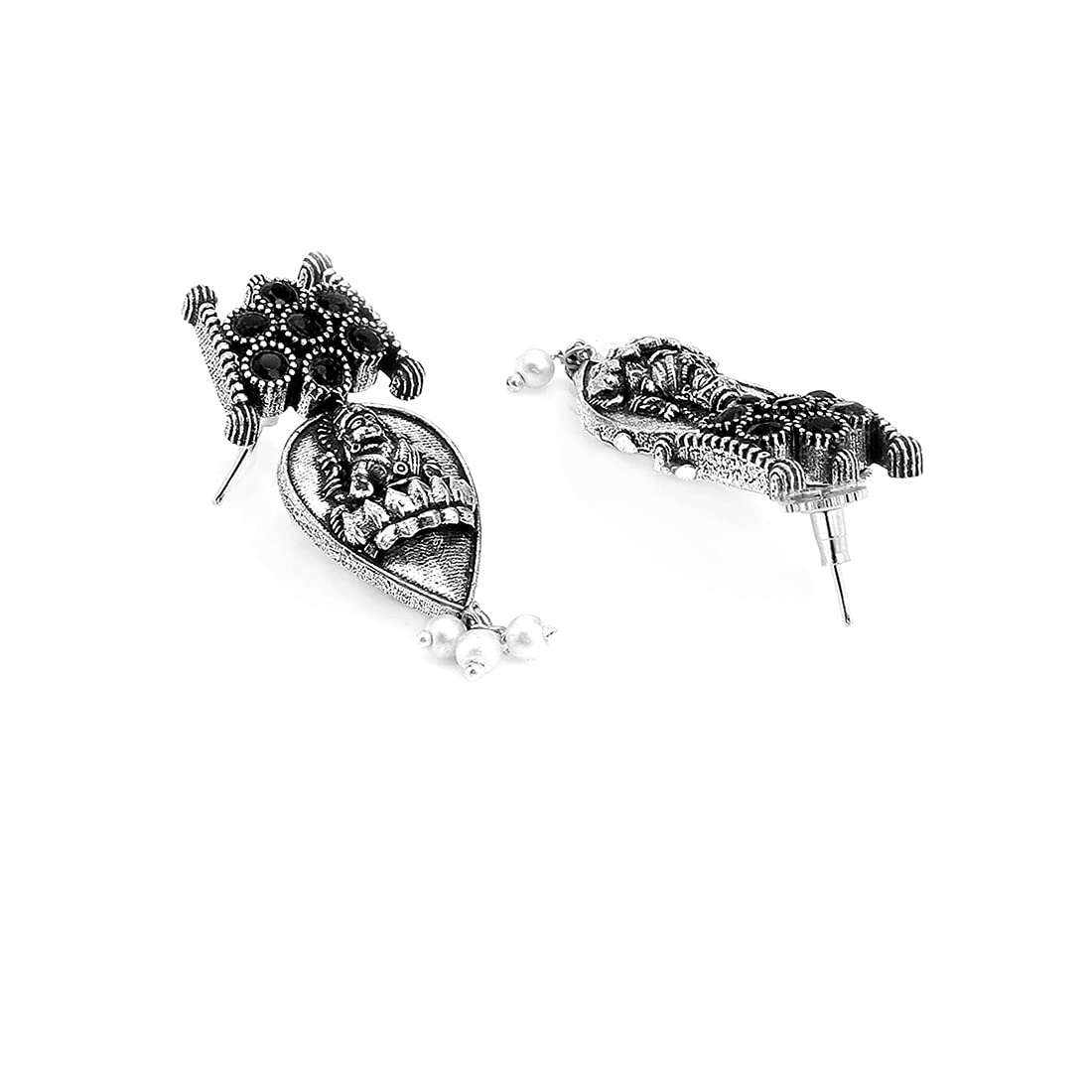 Ethnic German Silver Oxidised Black studded stones White pearl moti Design Lakshmi Choker Necklace Set with Earrings Traditional Jewellery Set for Women and Girls, Medium
