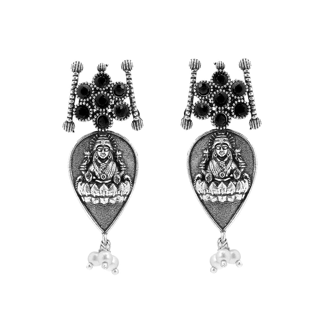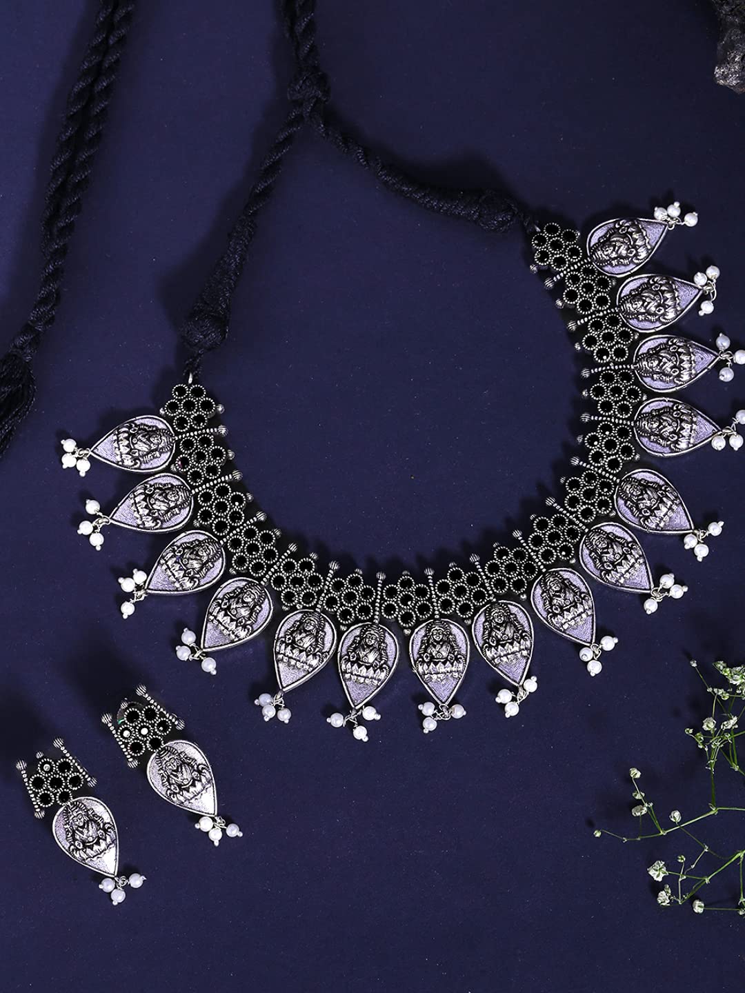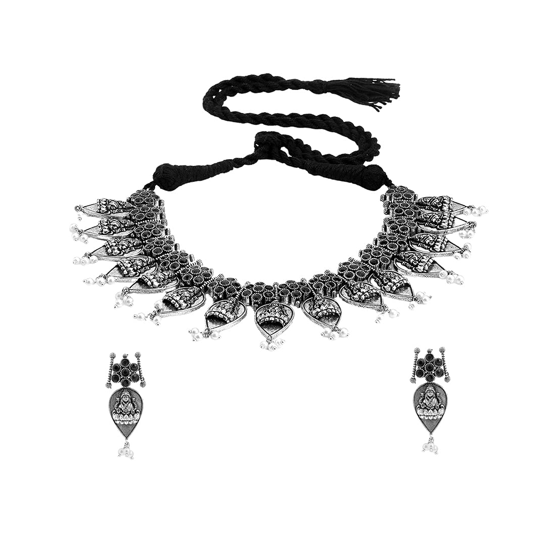Yellow Chimes Ethnic German Silver Oxidised Black studded stones White pearl moti Design Lakshmi Choker Necklace Set with Earrings Traditional Jewellery Set for Women and Girls, Medium