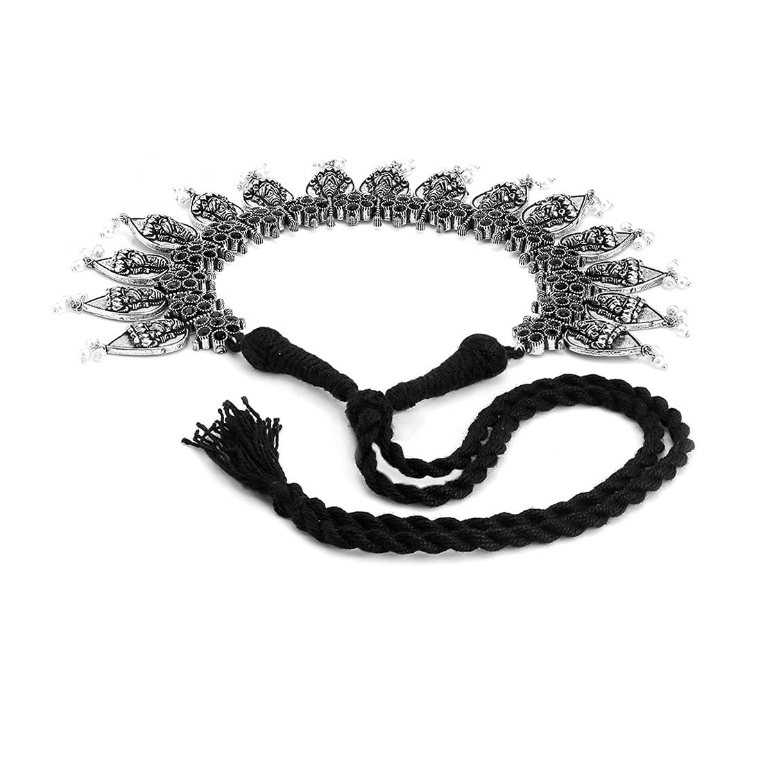 Step into a world of timeless beauty with the Yellow Chimes Ethnic German Silver Oxidised Lakshmi Choker Necklace Set. This exquisite piece combines traditional craftsmanship with modern design, making it a perfect addition to any jewelry collection.