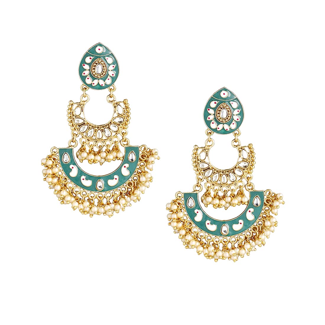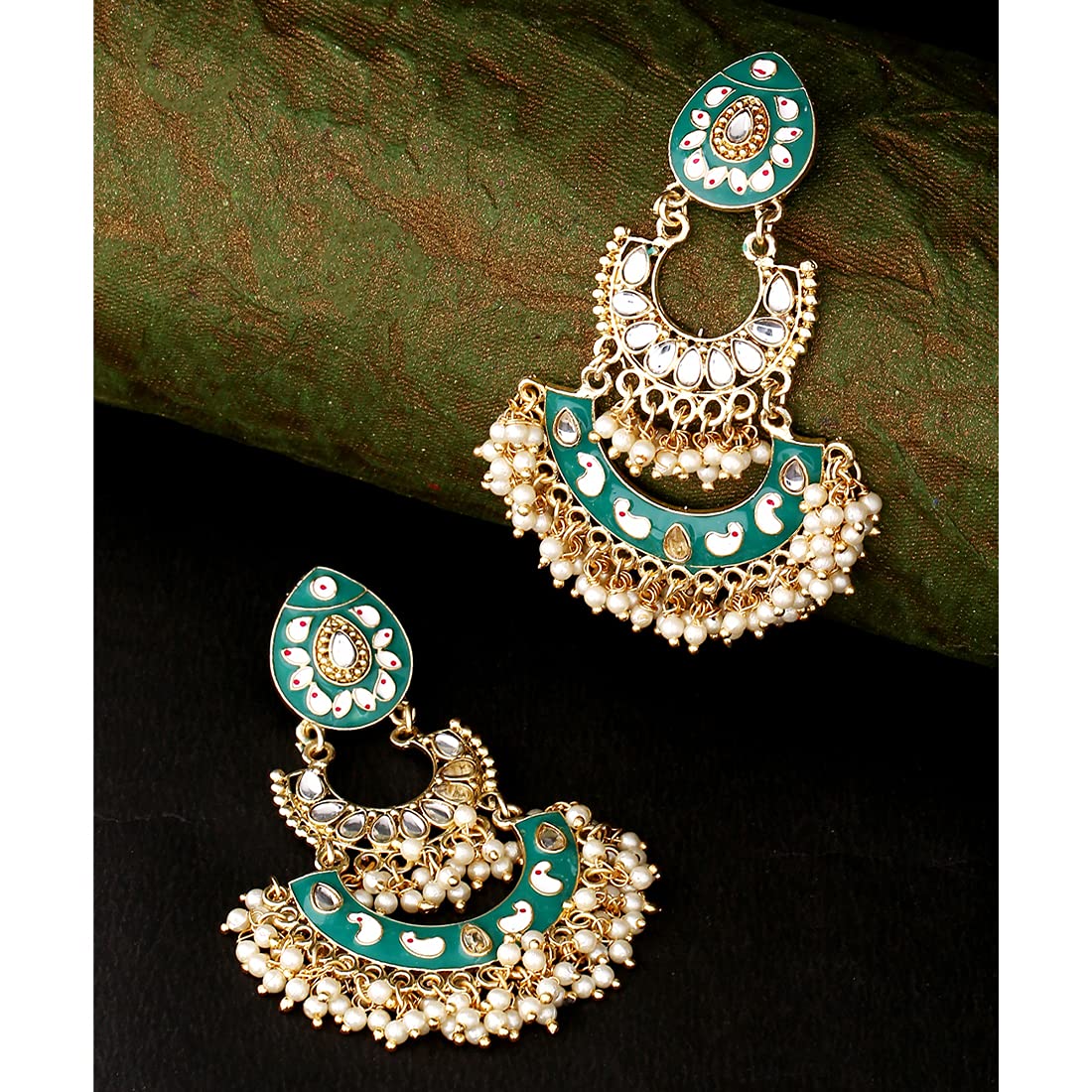 - Ethnic Gold Plated Indian Chandbali Earrings with Green Enamel Design and Stones Studded, An Eternal Evergreen Design. This Traditional earrings will complement any Occasion Ethnic Wear/ Daily / College / Leisure Wear