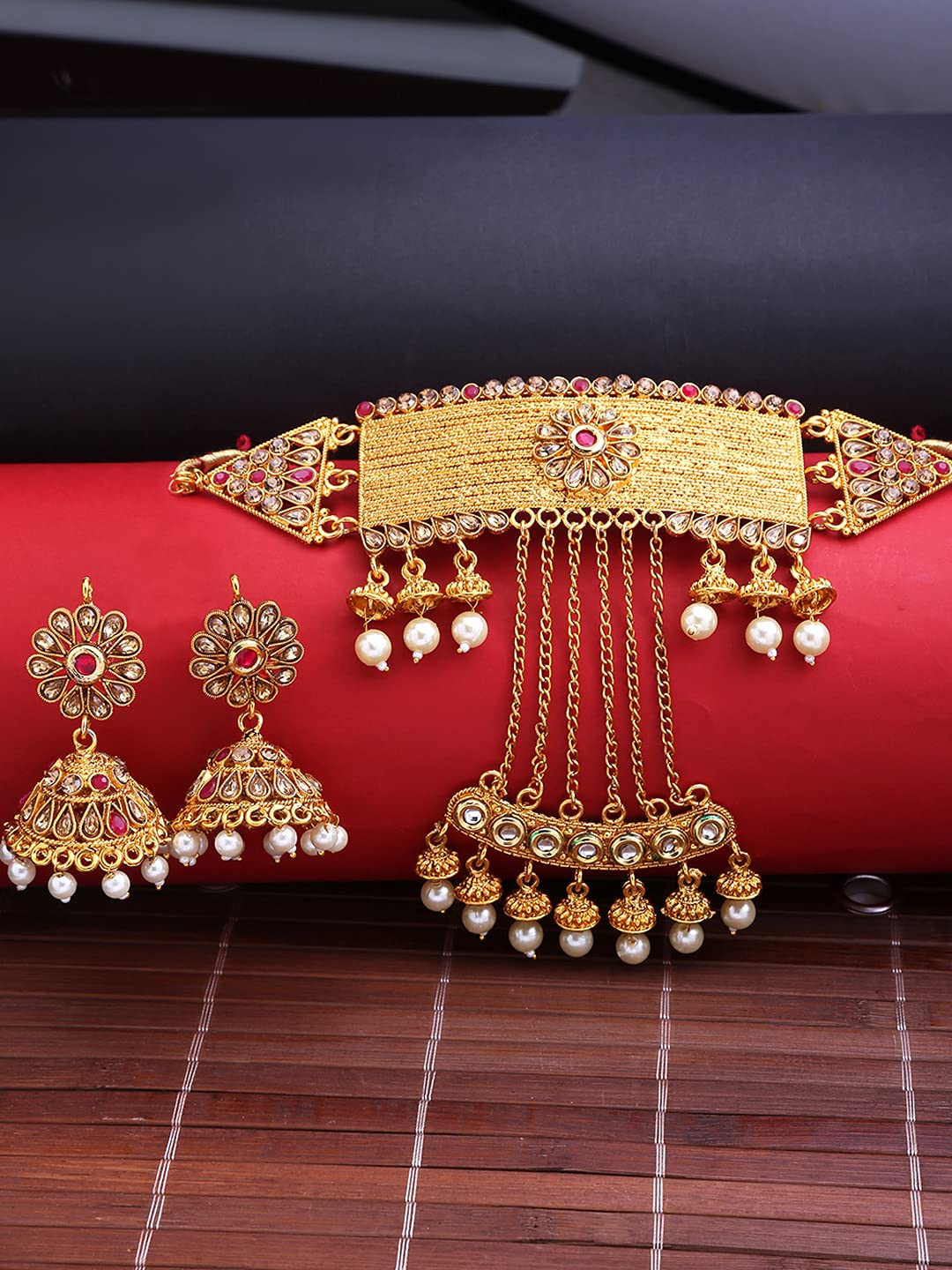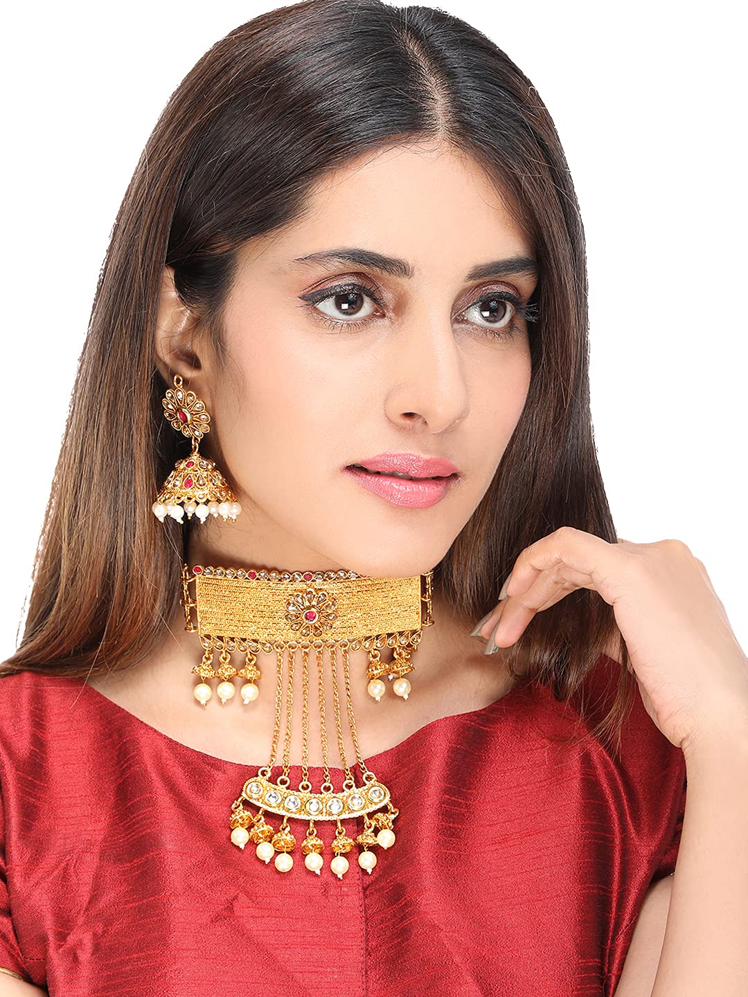 Yellow Chimes Ethnic Gold Plated Studded stones Flower Jhumka design Pearl Traditional Choker Necklace Set for Women and Girls, Medium (YCTJNS-67CKRPRL-GL)