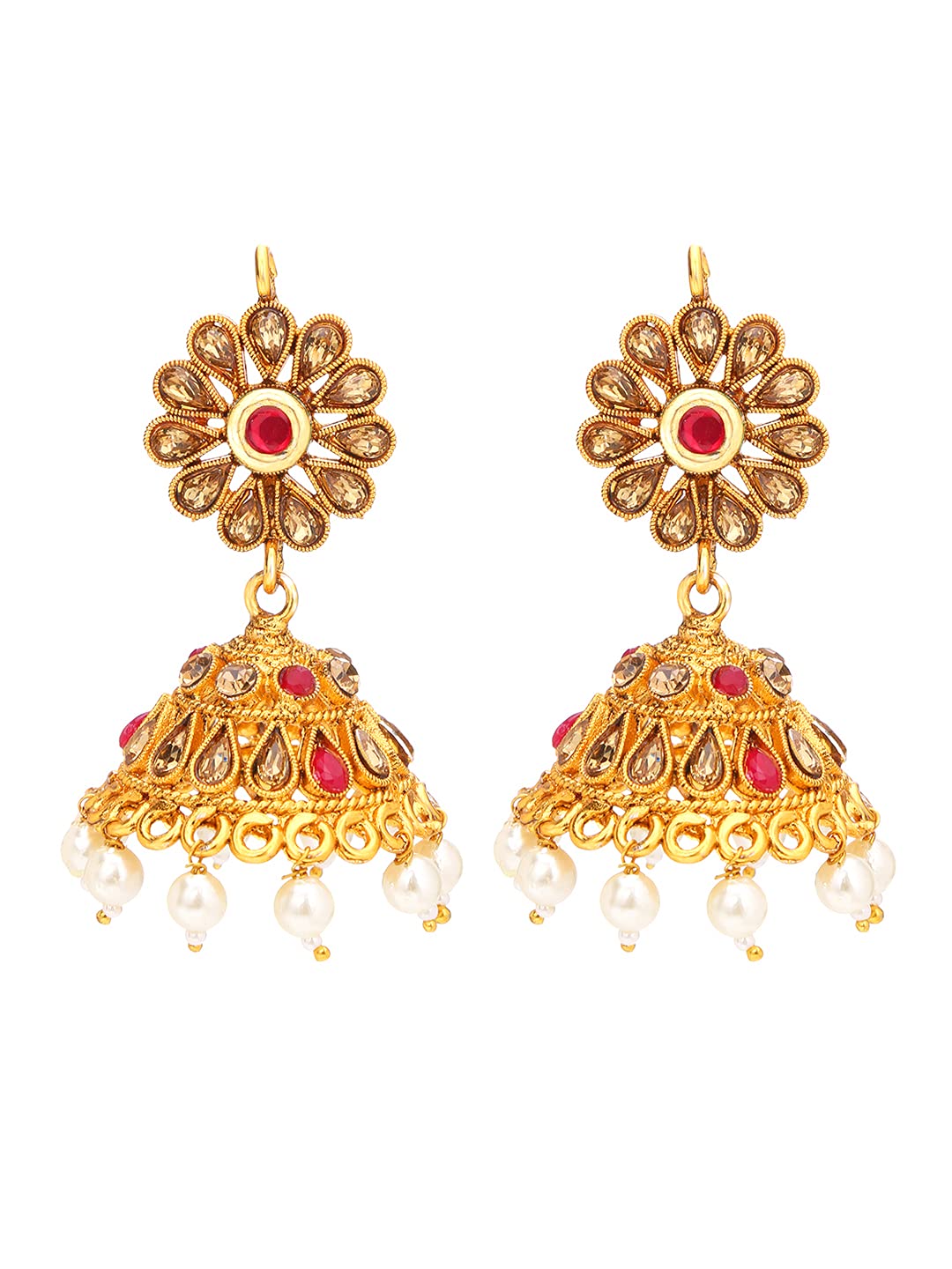 Ethnic Gold Plated Studded stones Flower Jhumka design Pearl Traditional Choker Necklace Set for Women and Girls, Medium (YCTJNS-67CKRPRL-GL)