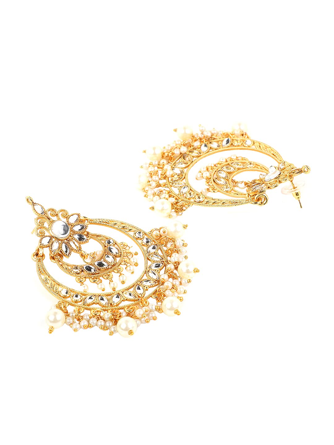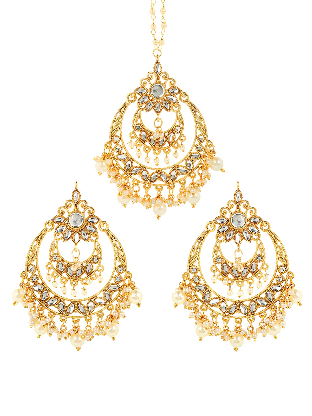 Yellow Chimes Ethnic Gold Plated Traditional Kundan Studded Pearl Chandbali Earrings with Maangtikka for Women and Girls, Medium (YCTJER-05KUDULCH-GL)