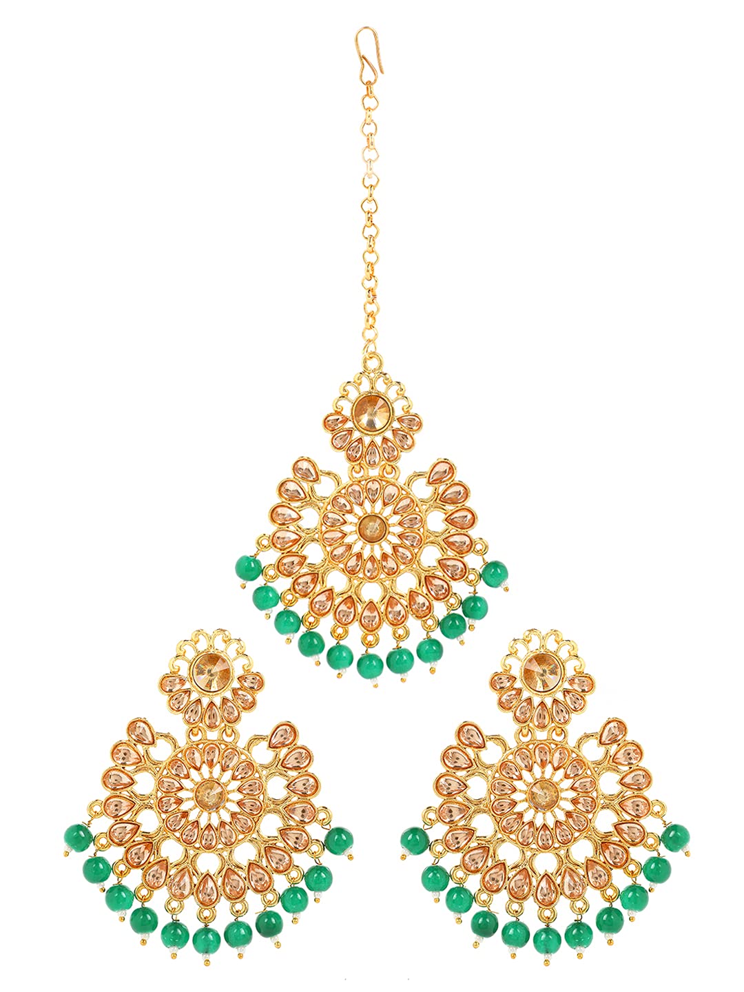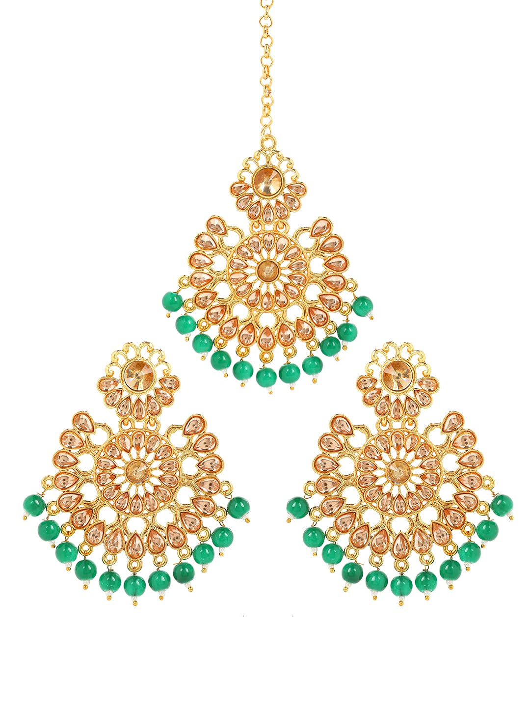 Yellow Chimes Ethnic Gold Plated Traditional Studded Kundan Green Pearl Chandbali Earrings with Maangtikka for Women and Girls, Medium, YCTJER-08FLWBDS-GR