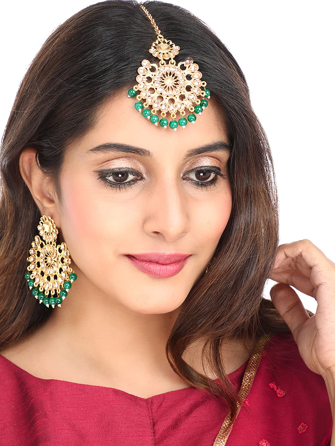 - Skin friendly: Nickel free and lead free as per international standardsAnti-allergic and safe for skin.Size: Earring Length- 7 CM, Width- 4.5 CM. Maang Tikka Length- 15 CM, Width-4.5 CM