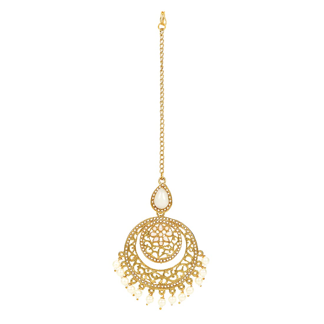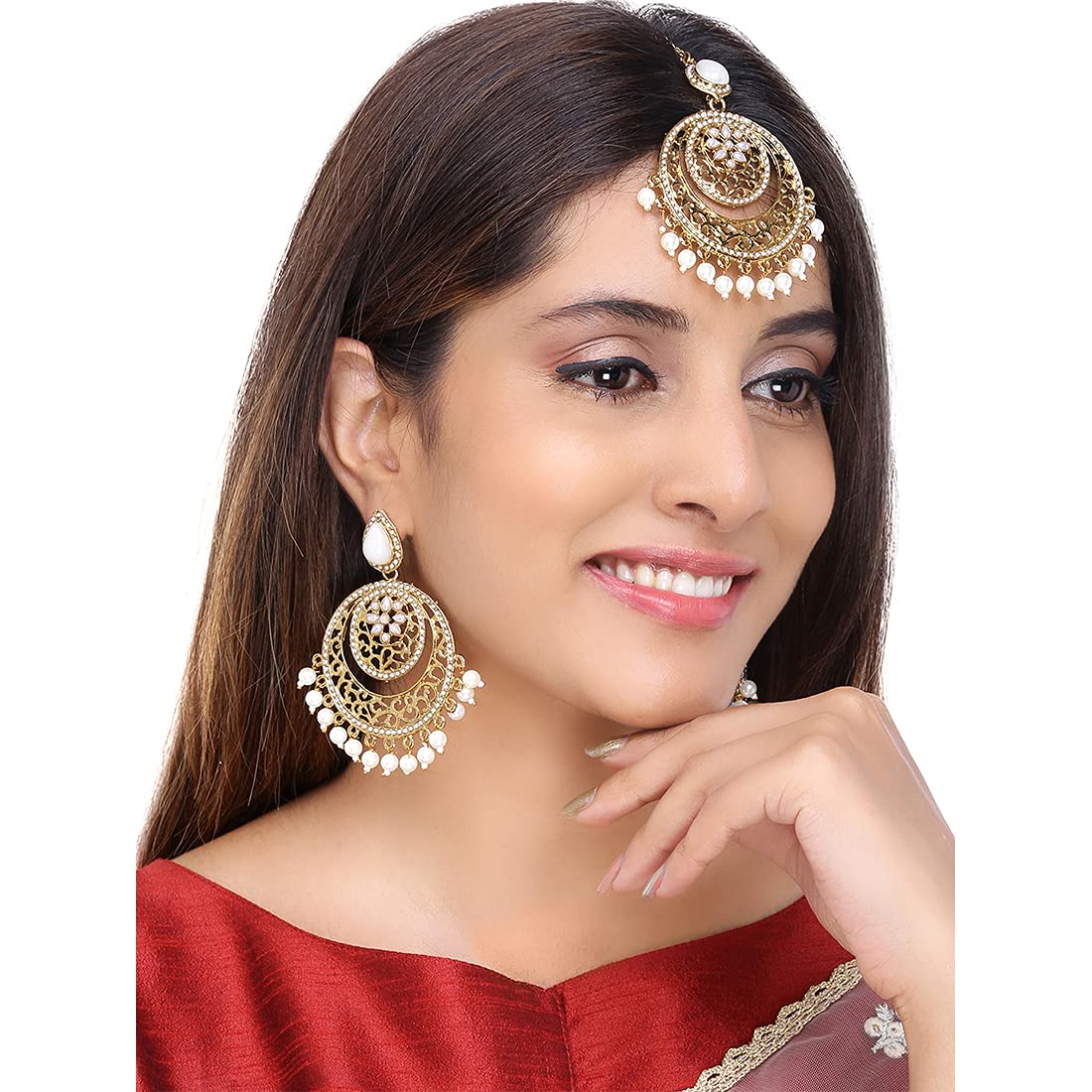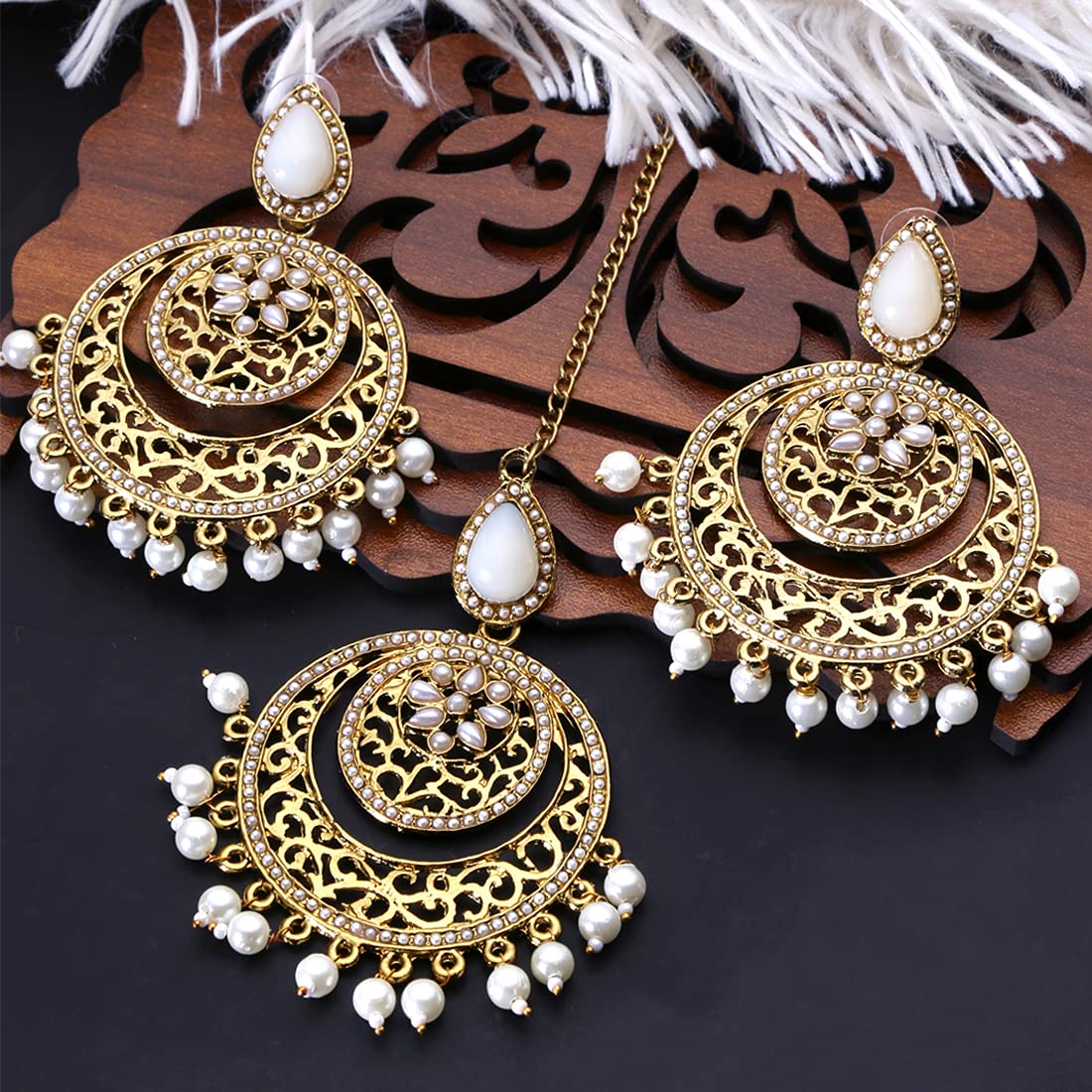 Yellow Chimes Ethnic Gold Plated Traditional Pearl Chandbali Earrings with Maangtikka for Women and Girls, Medium (YCTJER-04MNGPRL-GL)