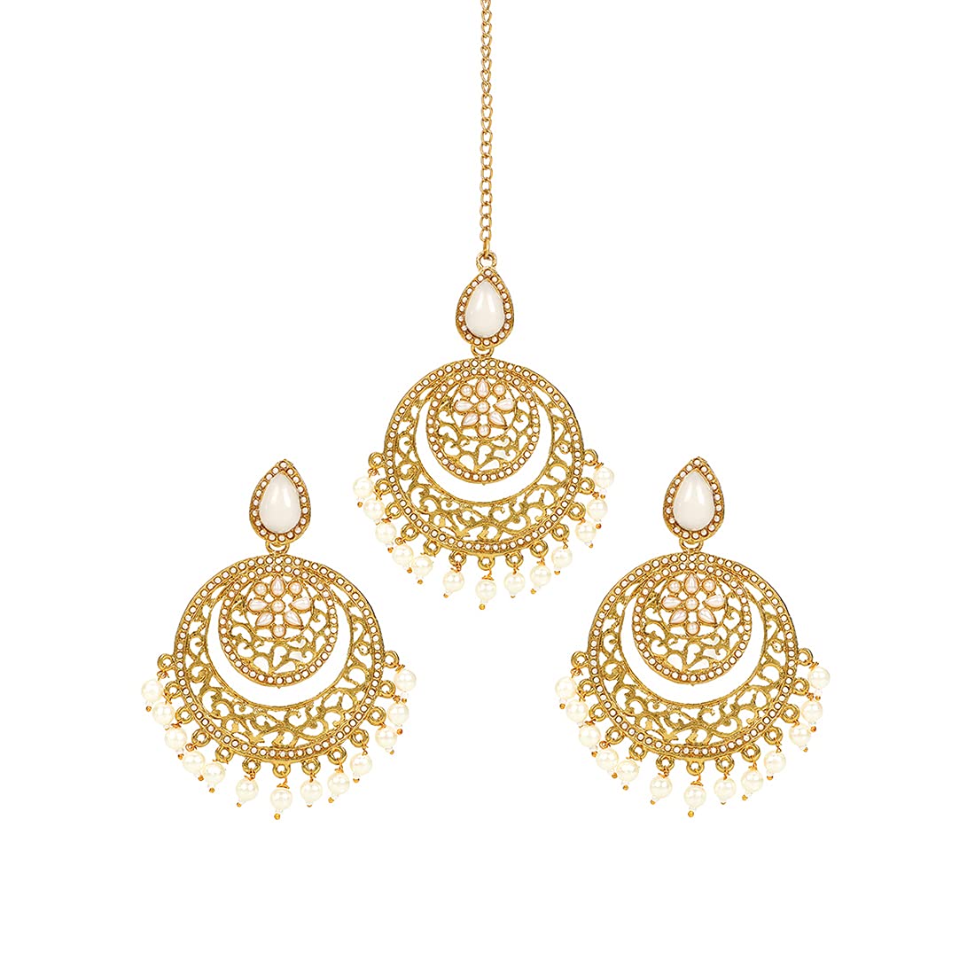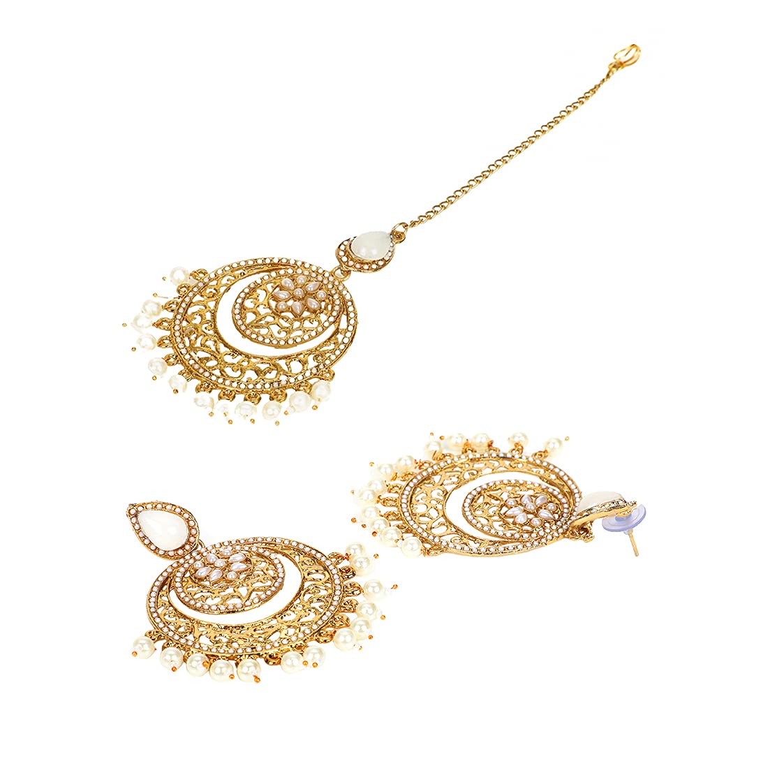 Ethnic Gold Plated Traditional Pearl Chandbali Earrings with Maangtikka for Women and Girls, Medium (YCTJER-04MNGPRL-GL)