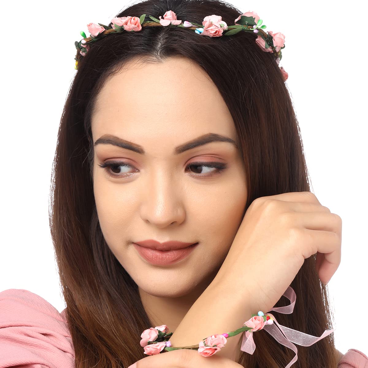 Yellow Chimes Floral Tiara and Bracelet Set for Women Pink Bridal Wedding Headband Hair Tiara For Women Bridesmaid Tiara Vines Set Hair Accessories.