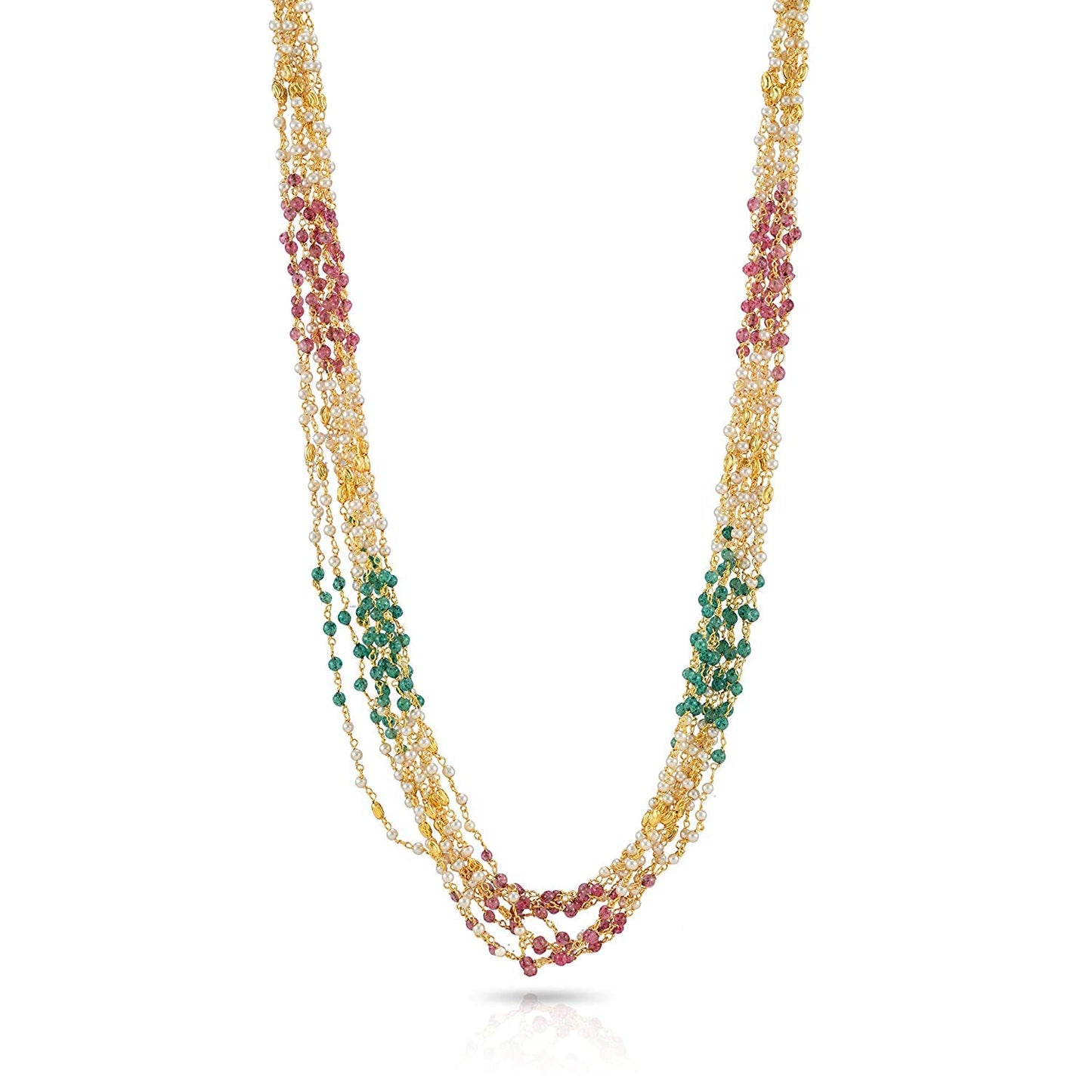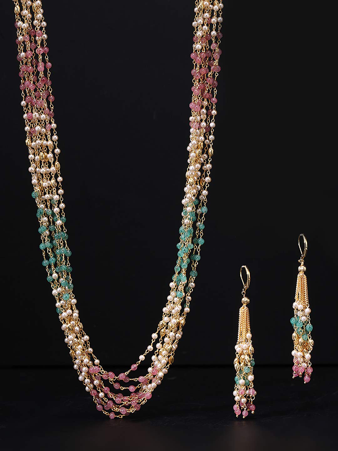Yellow Chimes Ganthan Moti Handmade Pearl Multilayer Beads Gold Plated Traditional Long Chain Necklace Set with Earrings Jewellery Set for Women and Girls