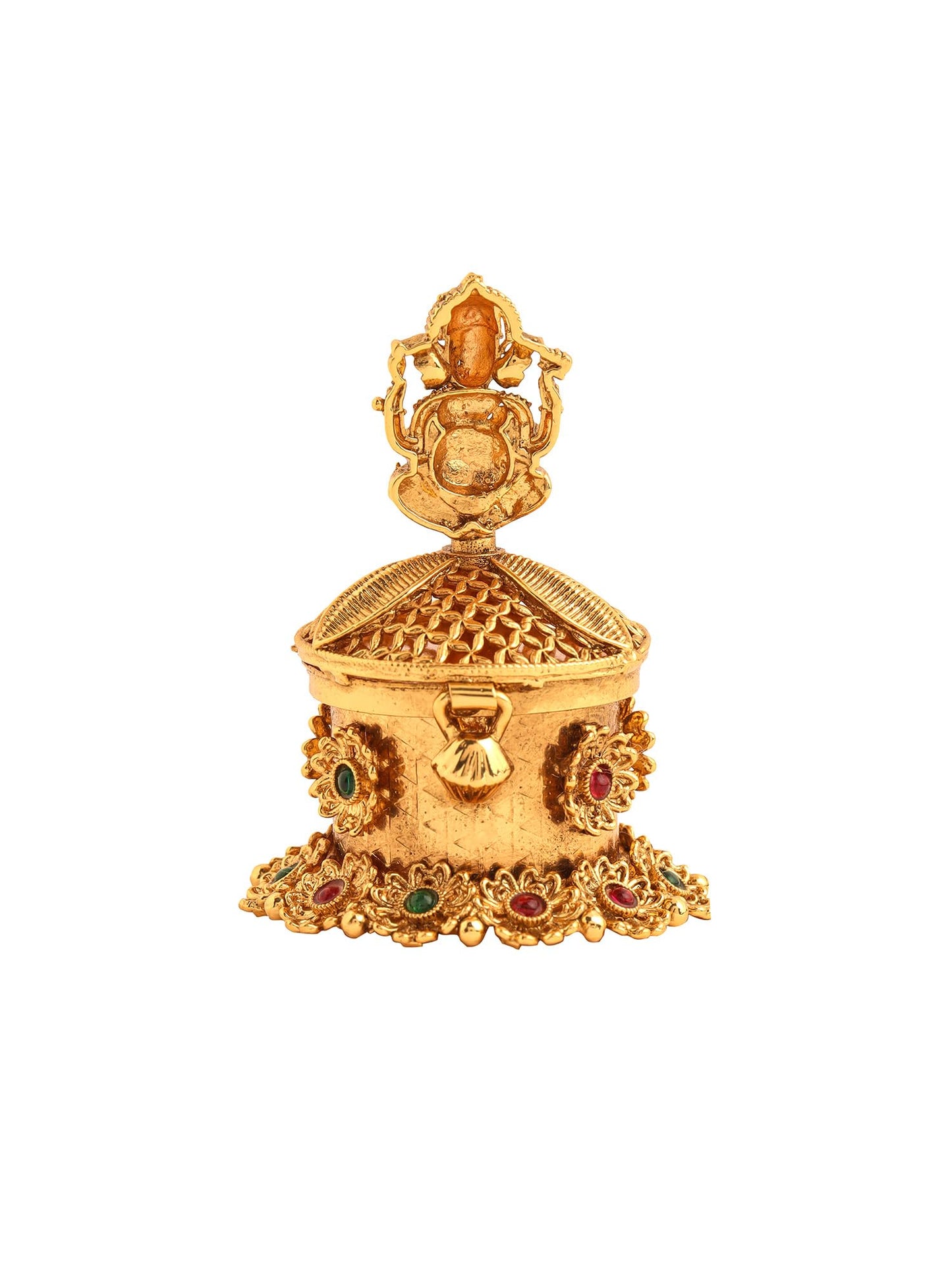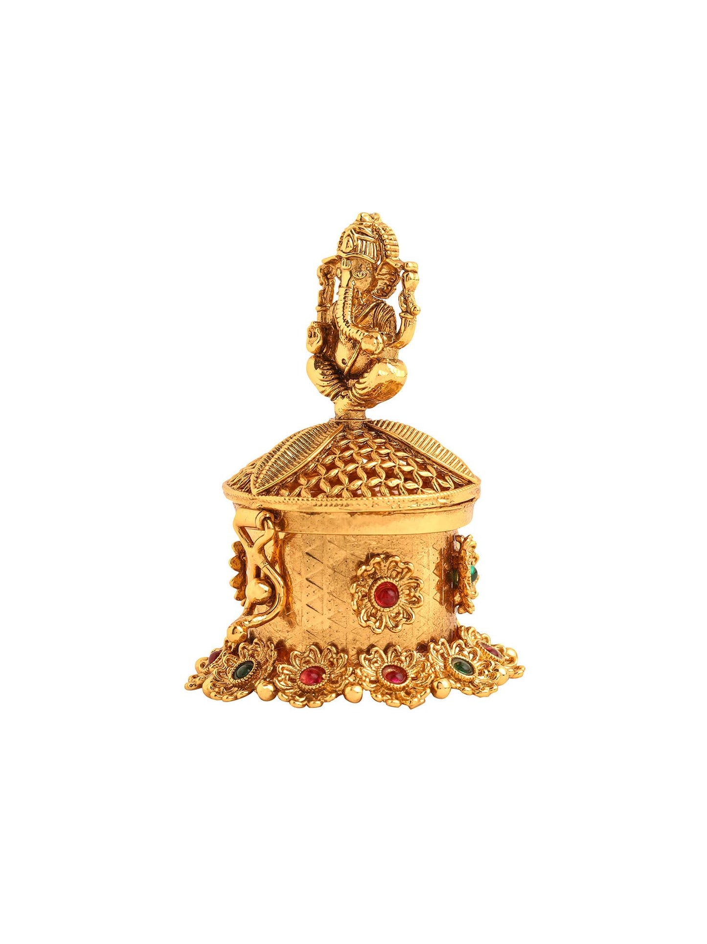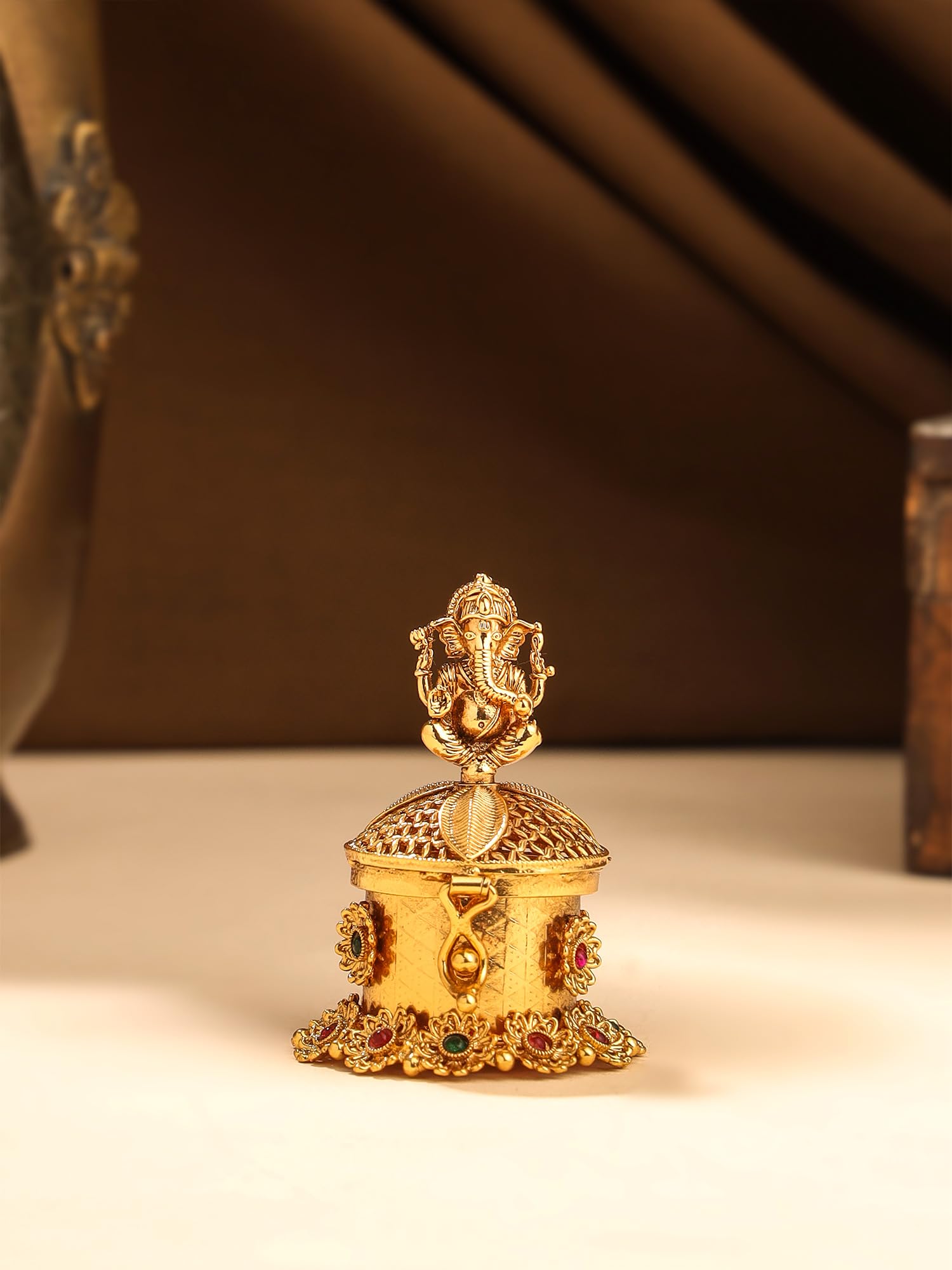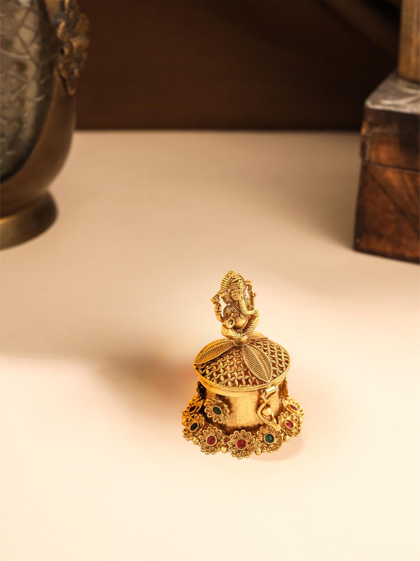 - STUNNING DESIGN: Crafted from brass with an intricate Lord Ganesh design, this Yellow Chimes Kumkum Box is visually appealing and adds a touch of elegance to your wardrobe or cupboard. The compact size makes it perfect for organizing accessories efficiently.