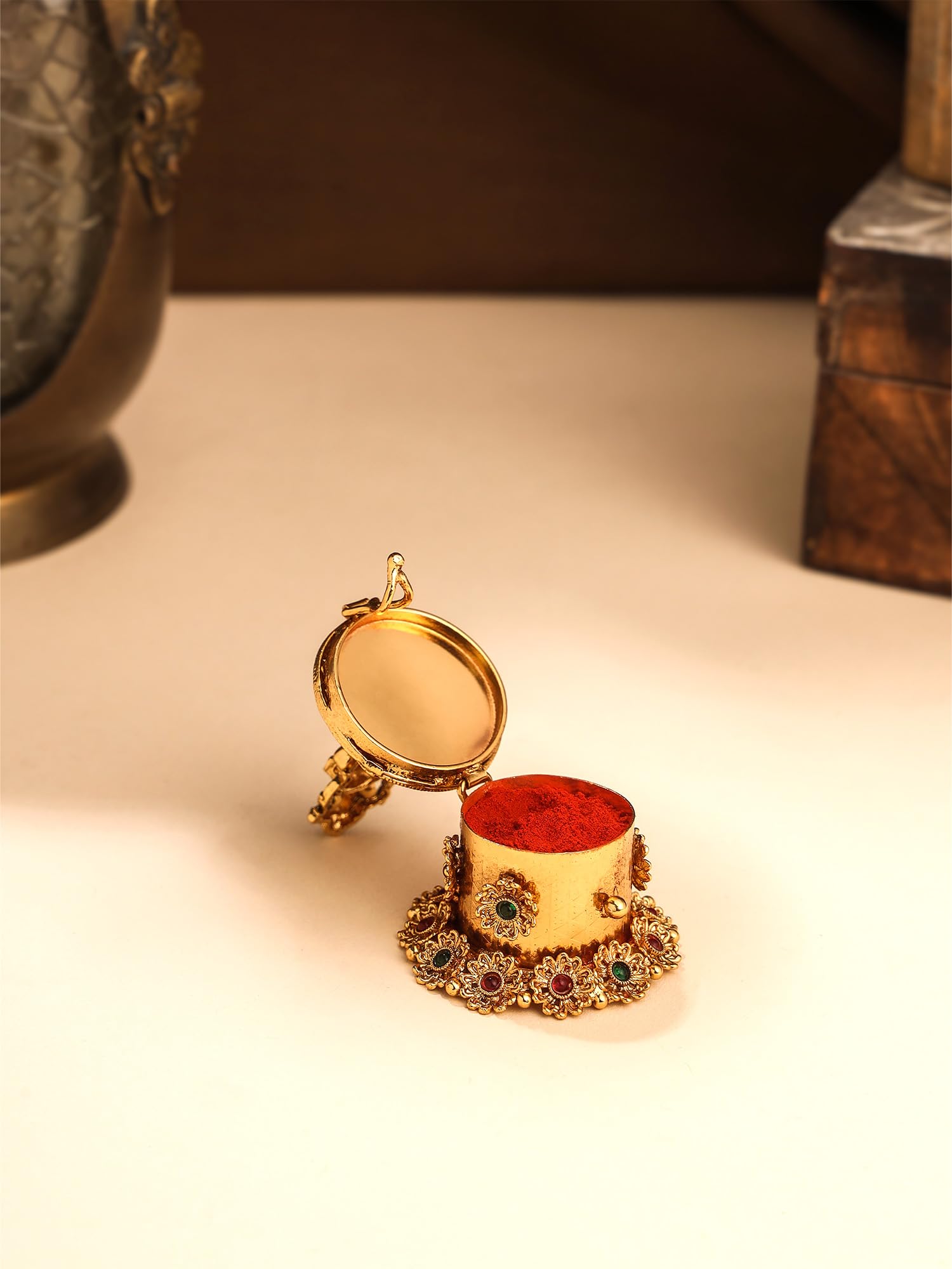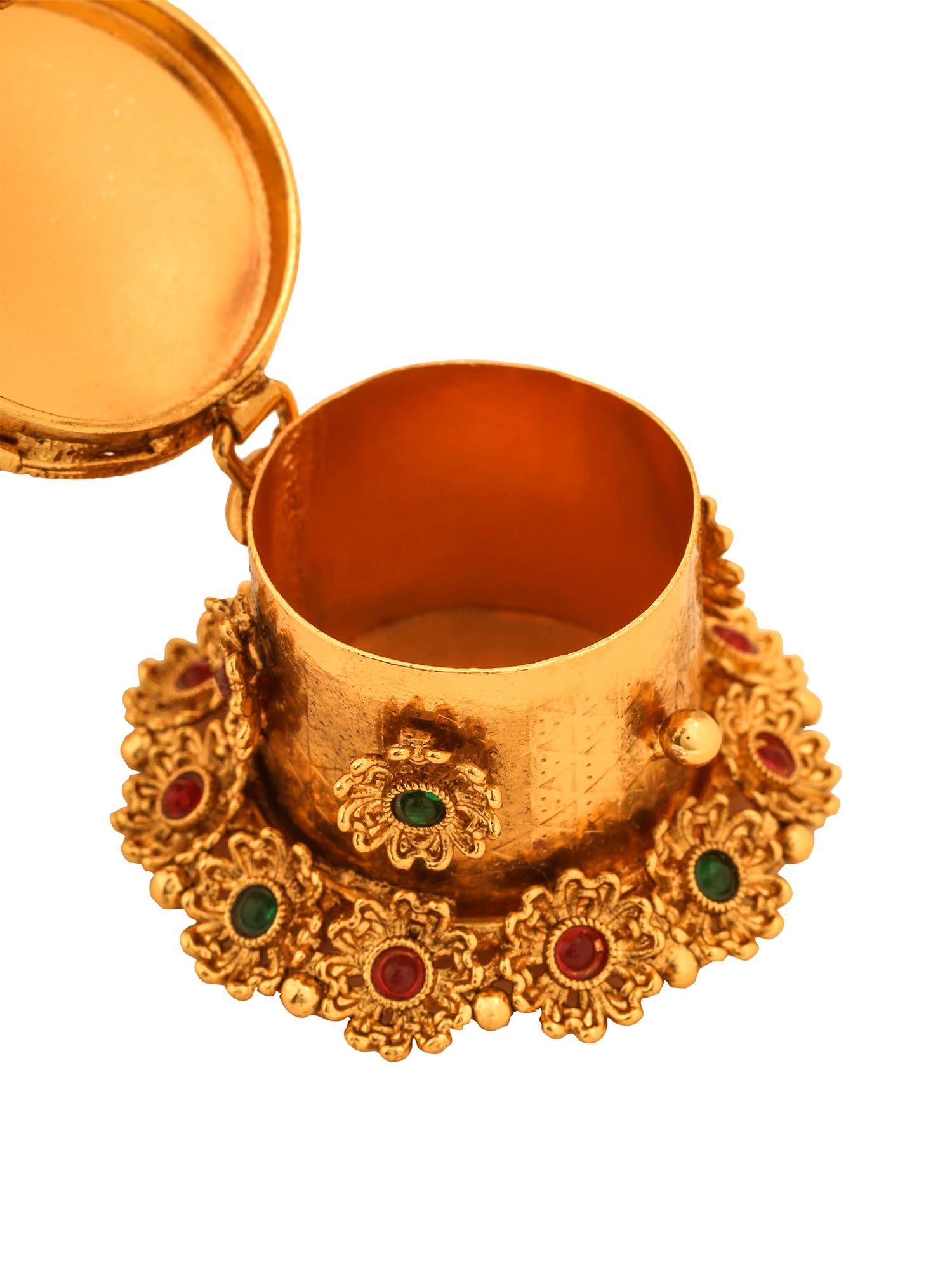 The Gold Plated Brass Kumkum Box is perfect for various uses, allowing you to store kumkum, sindoor, and other precious items with grace. Size details include: Length: 6 cm, Width: 4 cm, Weight: 28 g.
